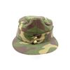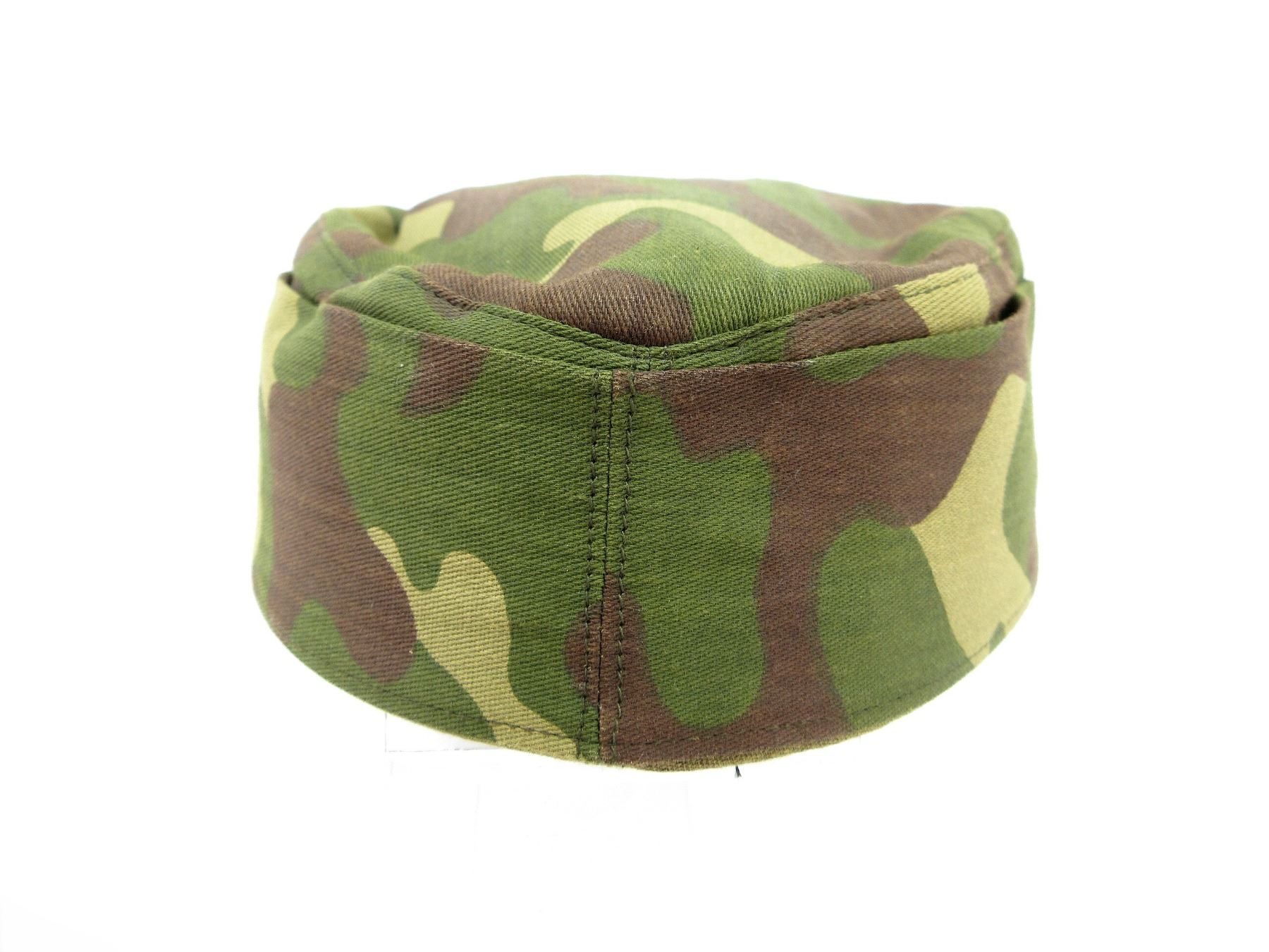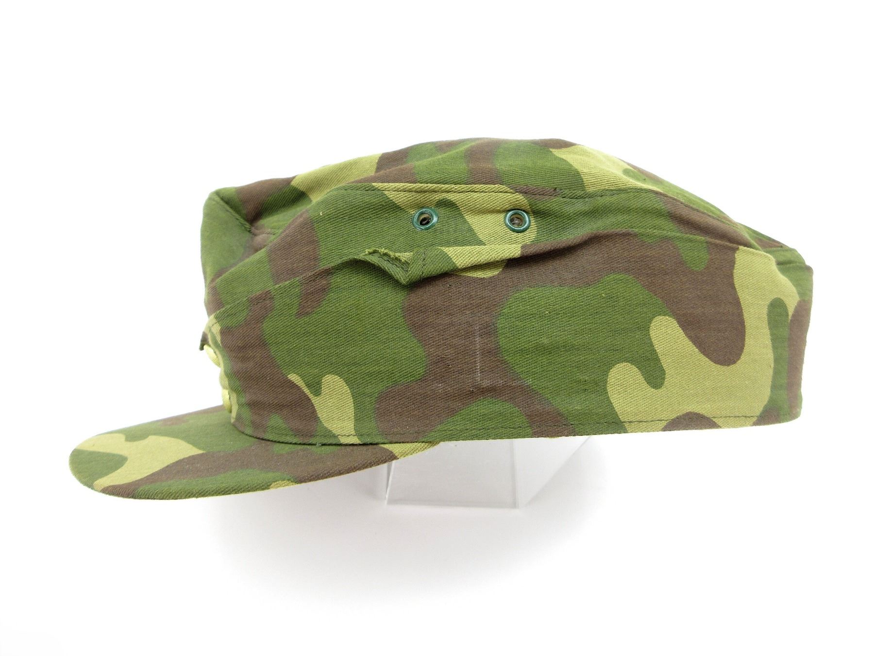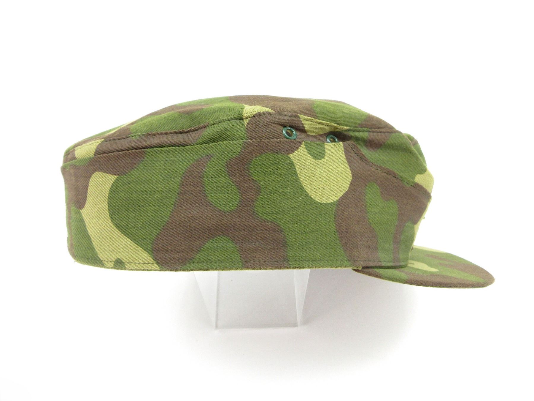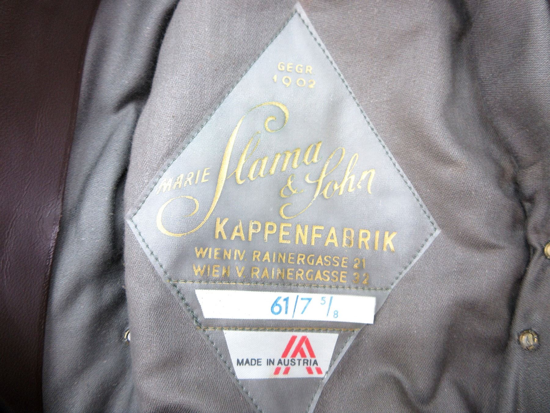 (1) CAMO FIELD CAP, MARKED: "GEGR, 1902, MARIE SLAMA & JOHN, KAPPENFABRIK, 61 / 7 5/8, MADE IN AUSTRIA" ETC., LEATHER HEAD BAND, VARIOUS MARKING ON HEAD BAND, BRASS PEBBLED BUTTONS, CONSIGNOR STATES: "1970'S -80'S". SEE PHOTOS.