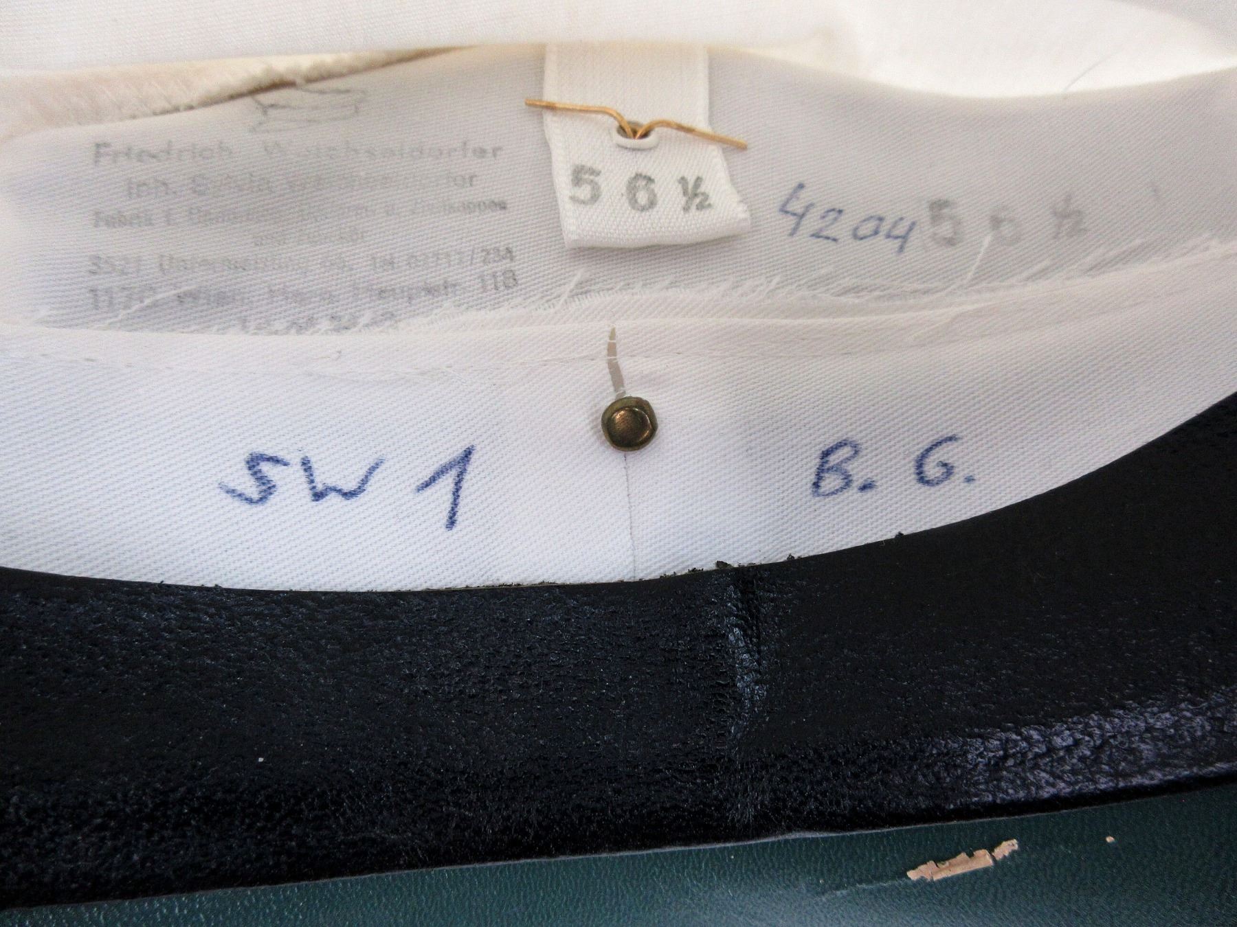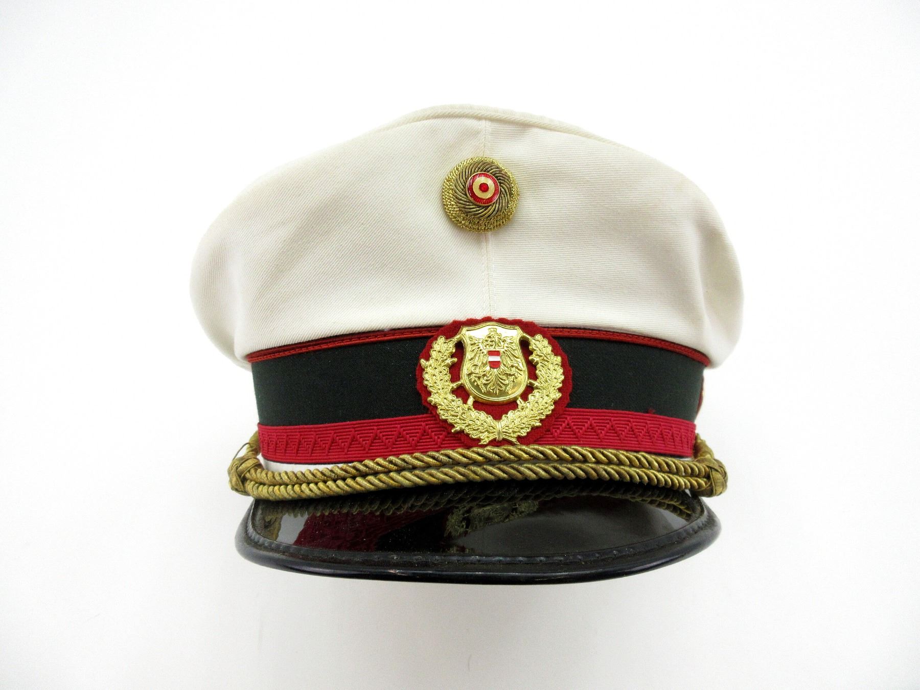 (1) WHITE PEAKED CAP WITH RED / BLACK BANDS, GOLD COLOURED CHIN STRAP, AUSTRIAN POLICE CAP BADGE, AUSTRIAN COCKADE, EAGLE'S HEAD CAP BADGE, SIZE 56 1/2, MARKED: "4204", "SW1", "B.G." & VARIOUS OTHER FAINT / UN-CLEAR MARKINGS. SEE PHOTOS.