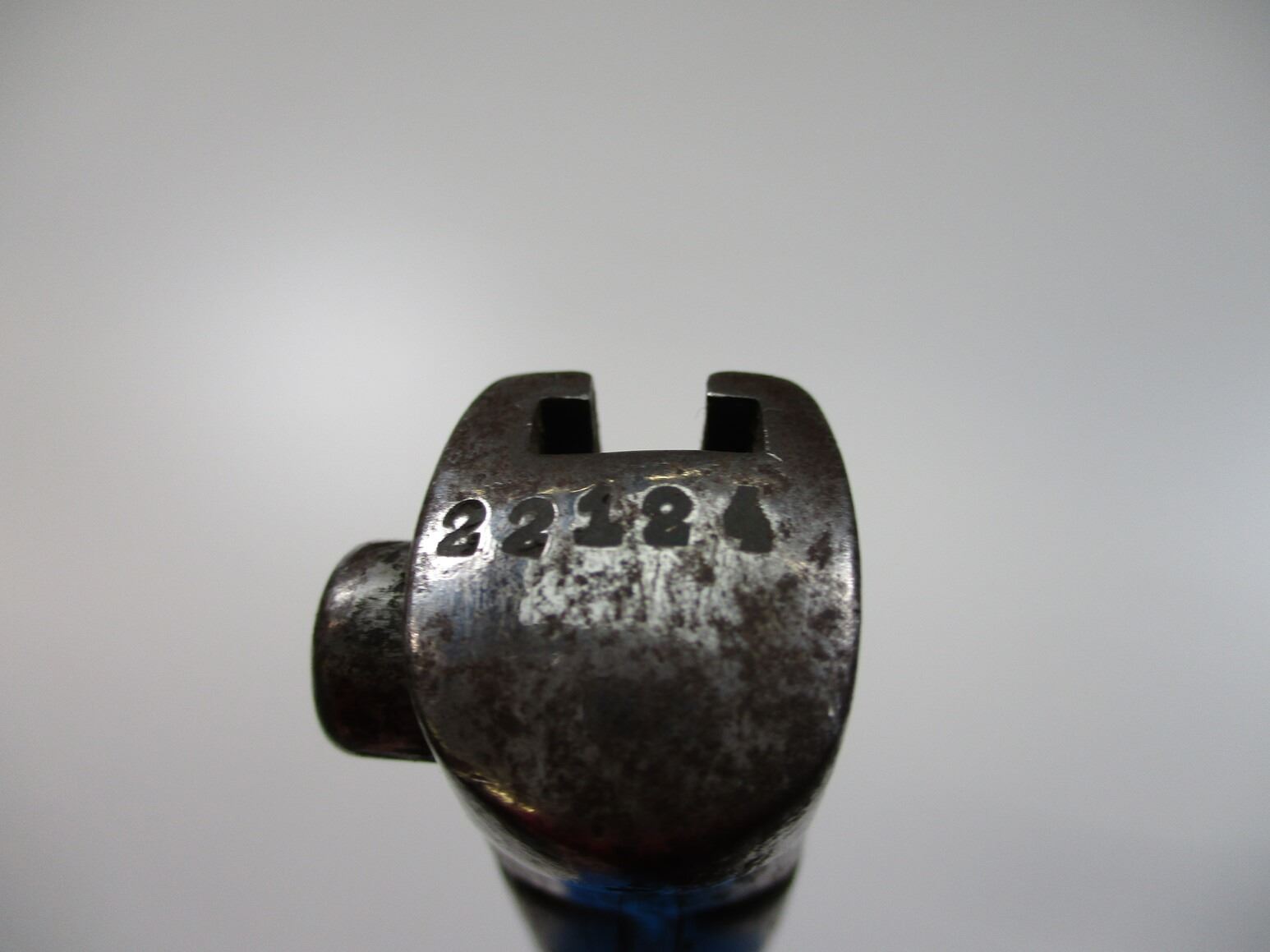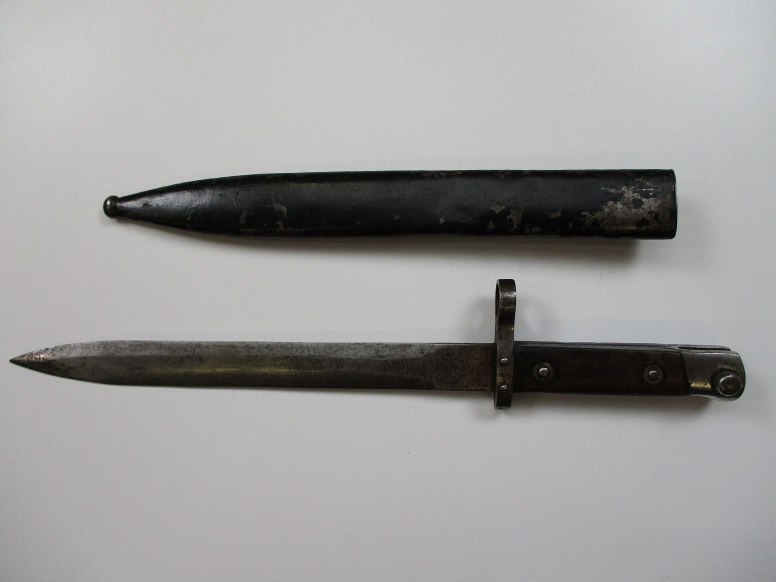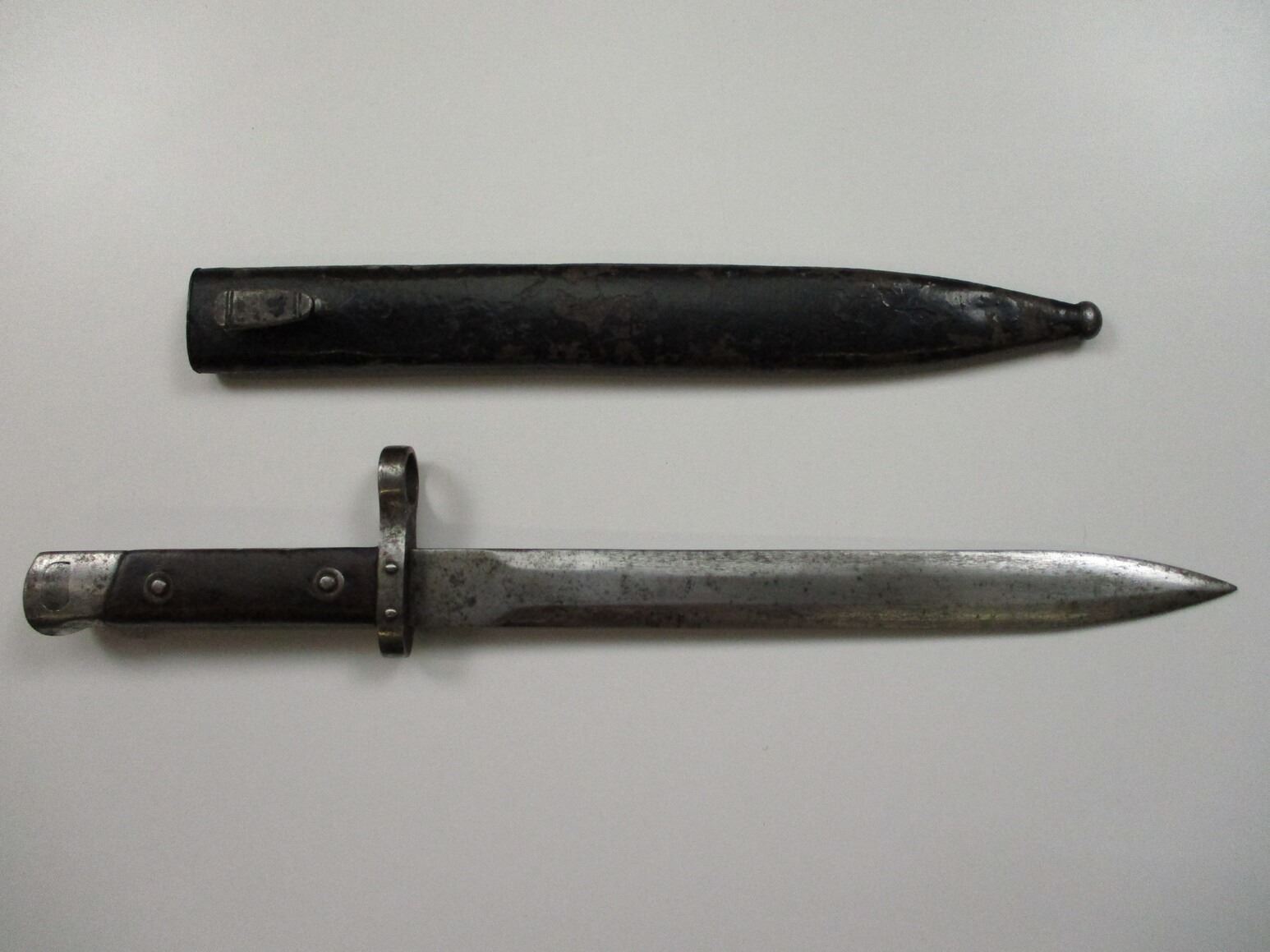 AUSTRIAN TYPE M1895 BAYONET , FOR USE WITH THE 8MM M1895 MANNLICHER RIFLE. POMMEL MARKED 22124. COMES WITH METAL UNMARKED SCABBARD, PAINT IS CHIPPING. APPROXIMATE MEASUREMENTS: 9 1/2" BLADE, 13 3/4" OVERALL LENGTH.