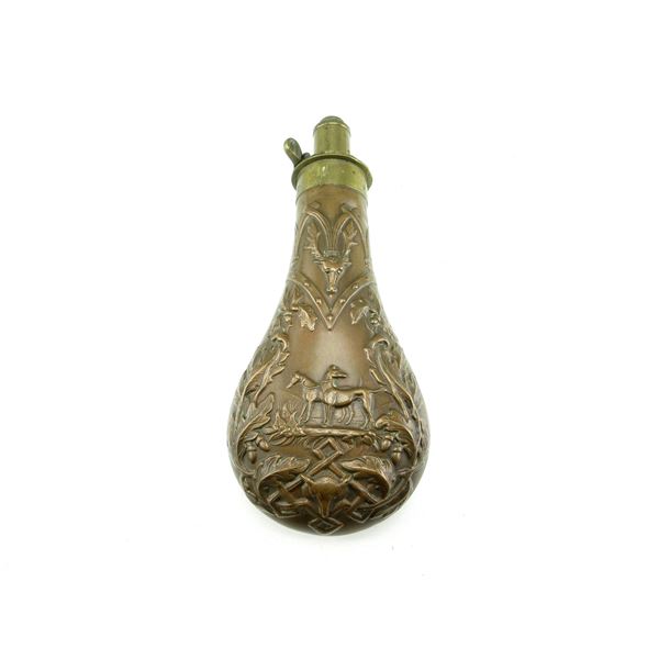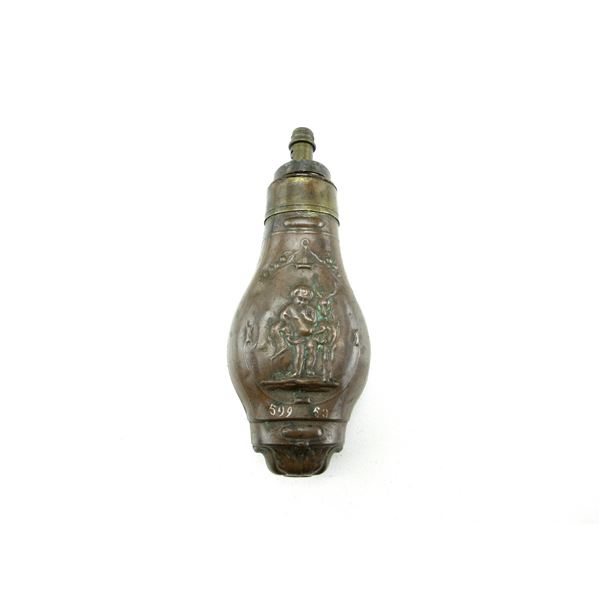 (1) EMBOSSED BRASS & COPPER POWDER FLASK WITH DOUBLE-SIDED BABY & DEER MOTIF, MARKED: "599, ?0", OAL A...