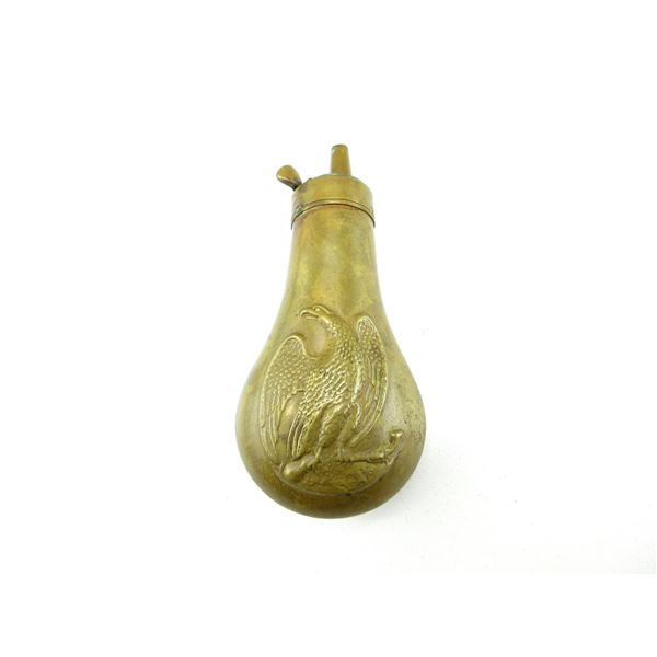 (1) BRASS & COPPER POWDER FLASK WITH DOUBLE-SIDED EMBOSSED EAGLE MOTIF, NO VISIBLE MARKINGS, OAL APPROX. 4.25&...