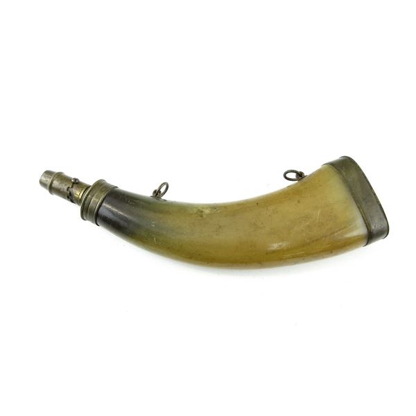 (1) POWDER HORN WITH BRASS SPOUT, SPOUT MARKED: "BOCHE, BREVETE DU ROI 1831" & VARIOUS DRAMS MEASUREM...