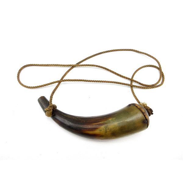 (1) BLACK POWDER HORN, MISSING CAP, TWISTED ROPE THONG, NO VISIBLE MARKINGS, OAL APPROX. 6.25". SEE PHOTOS.