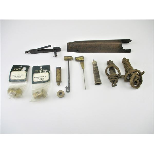 ASSORTED ACCESSORIES , INCLUDES: VARIOUS BLACK POWDER ACCESSORIES, POWERED HORN PLUGS, TOOLS, ETC, PULL THROUGH BORE CLEANING SNAKES, UNKNOWN CRACKED