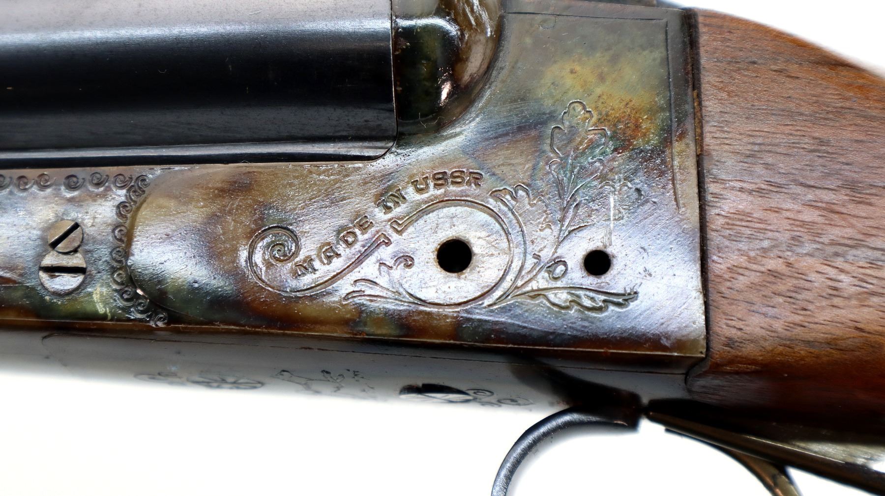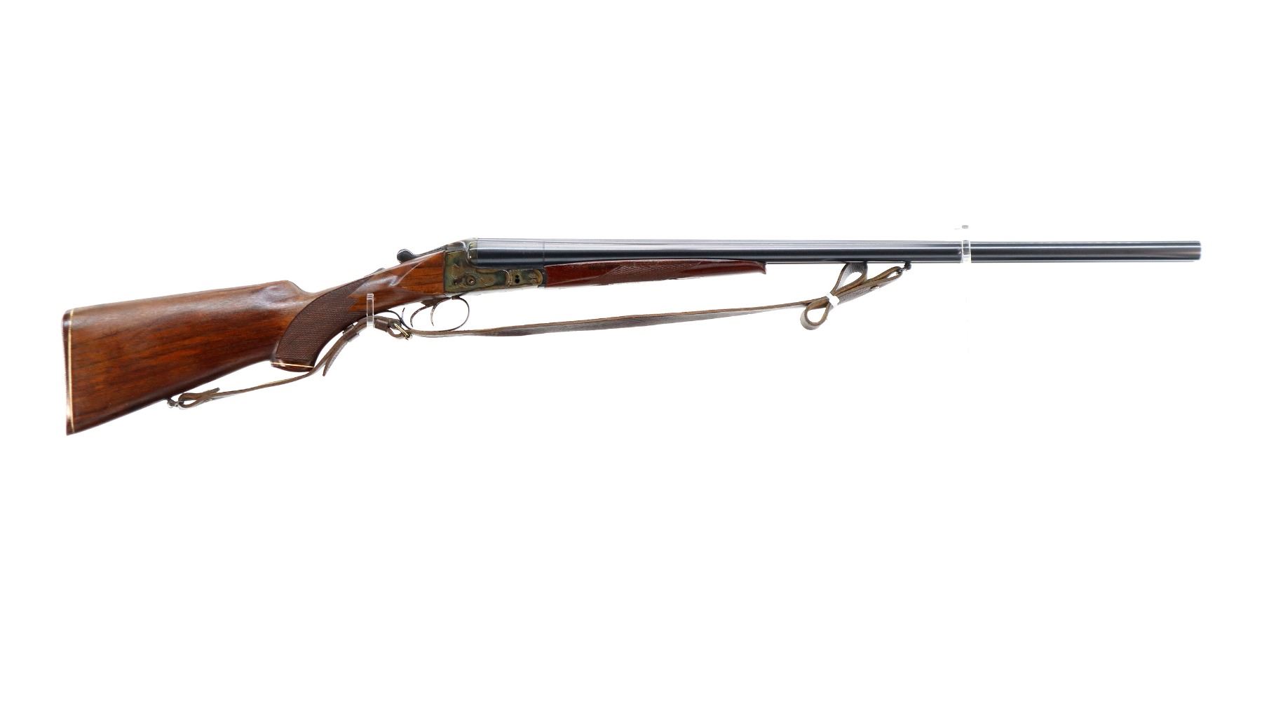 Main Description: Note: This shotgun is missing right side firing pin assembly, hammers, ears, pins and possibly internal springs. Brass bead, blued barrels with raised rib, engraved colour case hardened receiver, has the safety, extractor, double triggers. Missing the cocking indicators. Has two piece wood stocks, checkered forearm and pistol grip, grooved brown polymer butt plate, grip cap, sling swivels with brown leather sling.