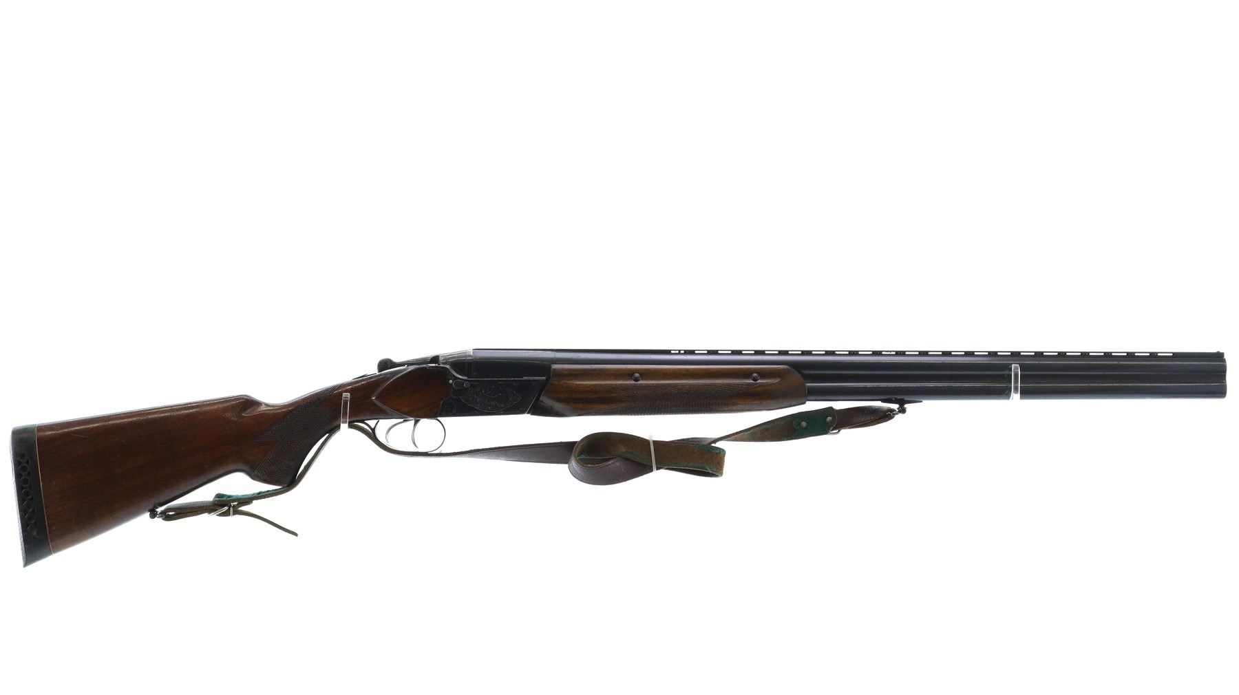 Main Description: Brass bead, blued finish, vent rib, engraved receiver, manual safety, action does not function opening lever does not lock open hammers do not fire may require parts, adjustment or repair. Extractor, Double triggers. Three piece wood stocks, checkered forearm and pistol grip chipped behind receiver, black vented rubber recoil pad, sling swivels with brown leather sling.