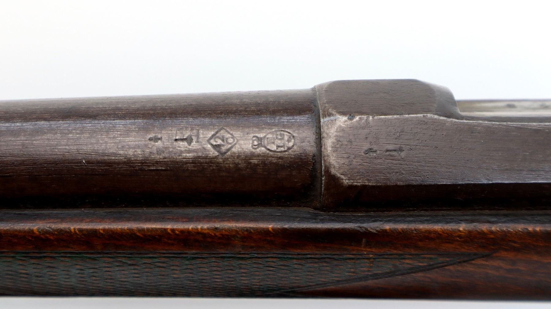 Main Description: Brass bead, round barrel, hex receiver, turned down butter knife bolt handle, extractor is present. One piece sporter wood stock, checkered forearm and pistol grip small crack behind receiver, grooved steel butt plate.