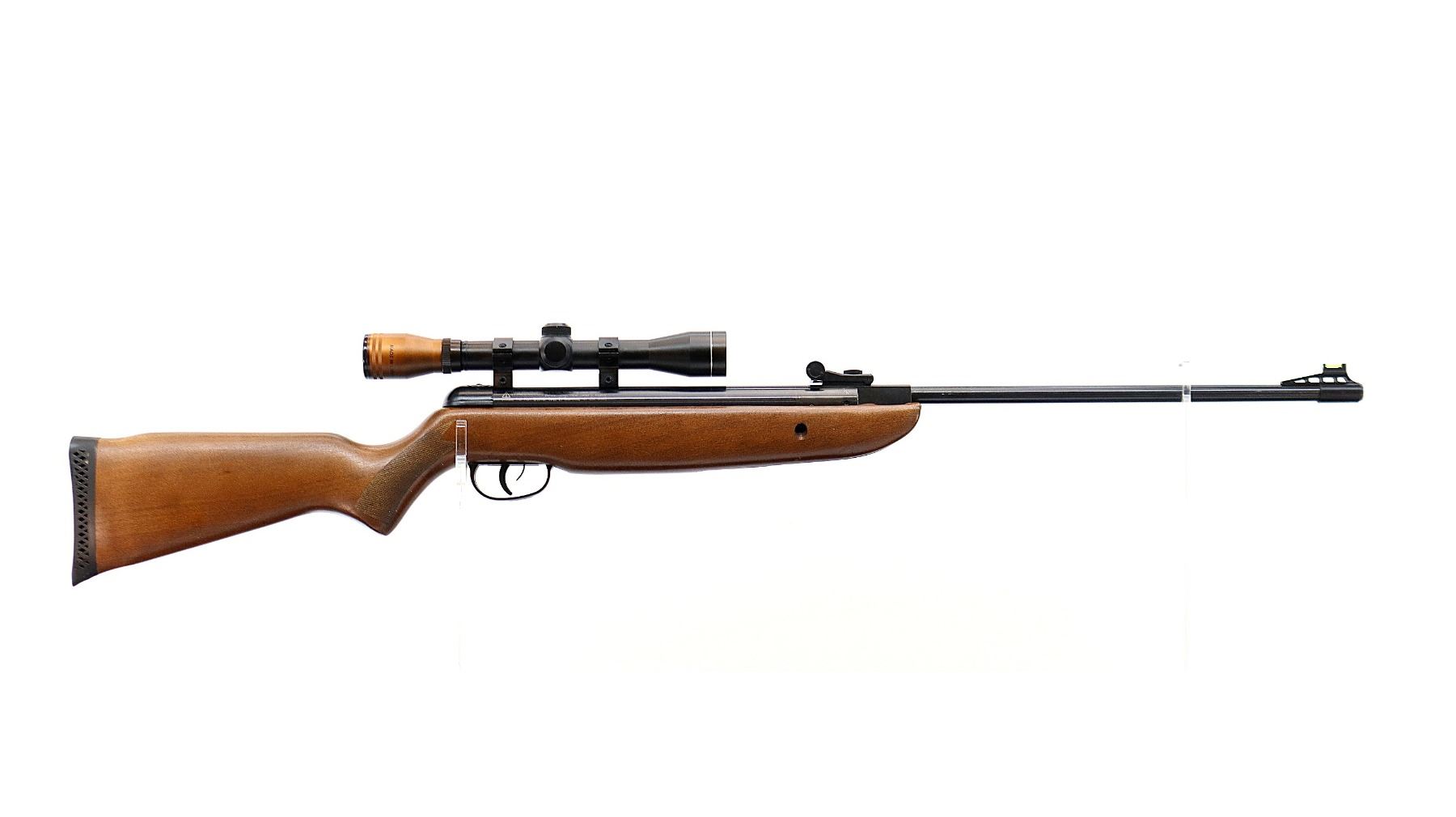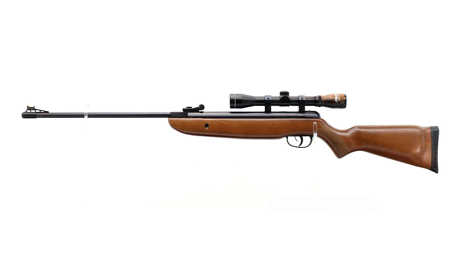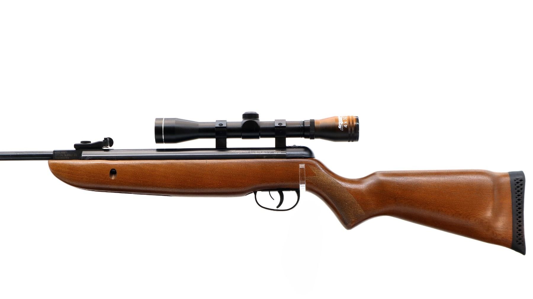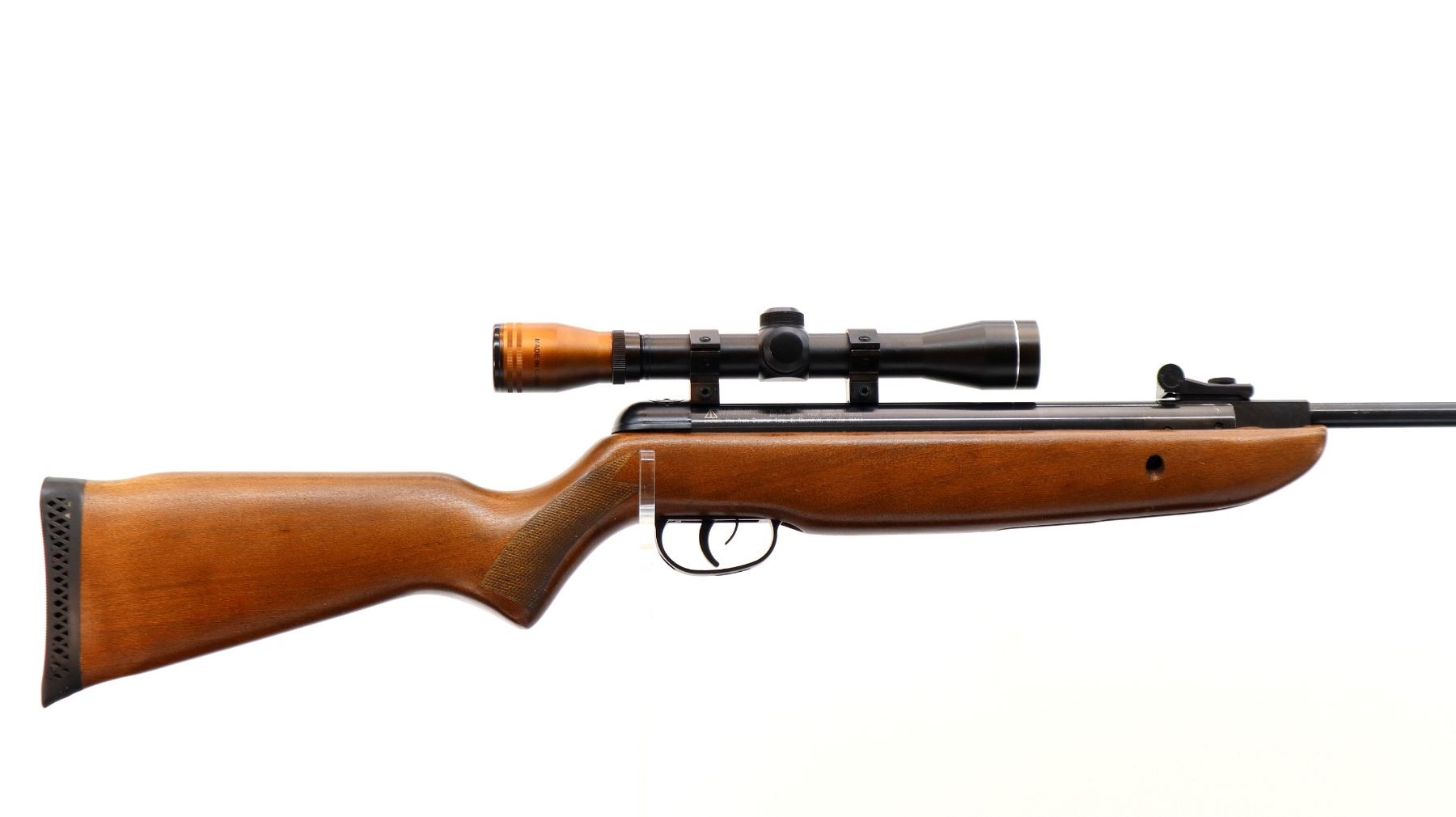 Main Description: Green fiber optic blade front sight with ramp, adjustable u notched red fiber optic rear sight, blued finish, grooved receiver with Crosman Airguns 4x32 scope installed, clear optics with duplex crosshair. One piece wood stock, checkered pistol grip, cheek rest, black vented rubber recoil pad