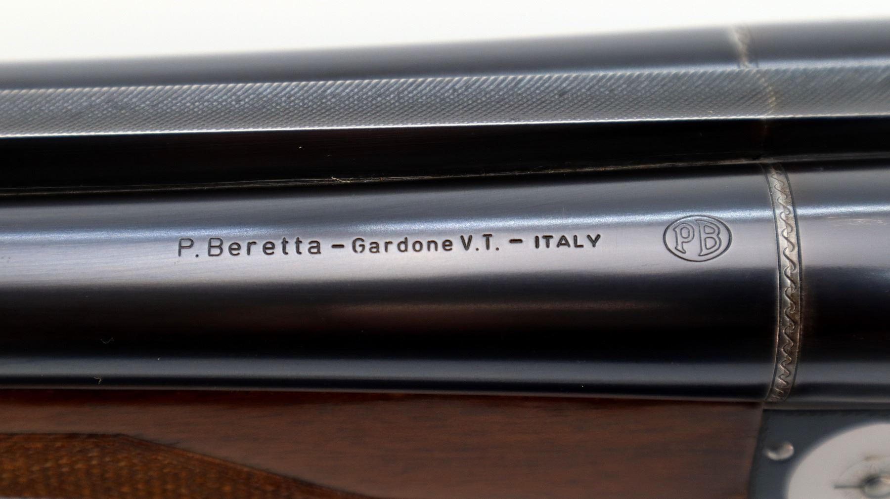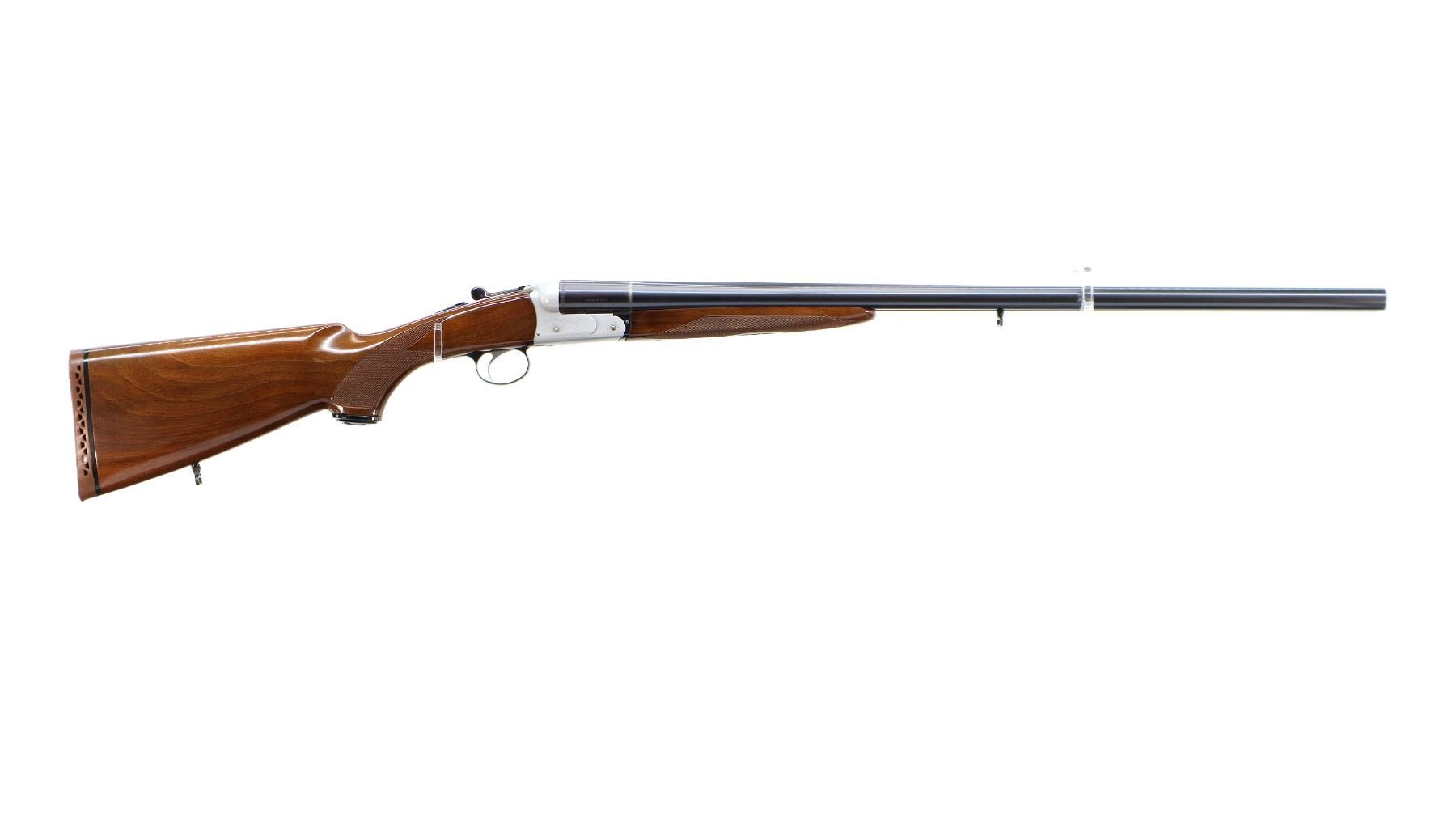 Main Description: Brass bead, polish blued barrels with raised solid rib, engraved silver receiver, manual selective safety, extractor, single silver inertia trigger. Two piece wood stocks, checkered forearm and pistol grip, brown vented rubber recoil pad, grip cap, sling swivels.