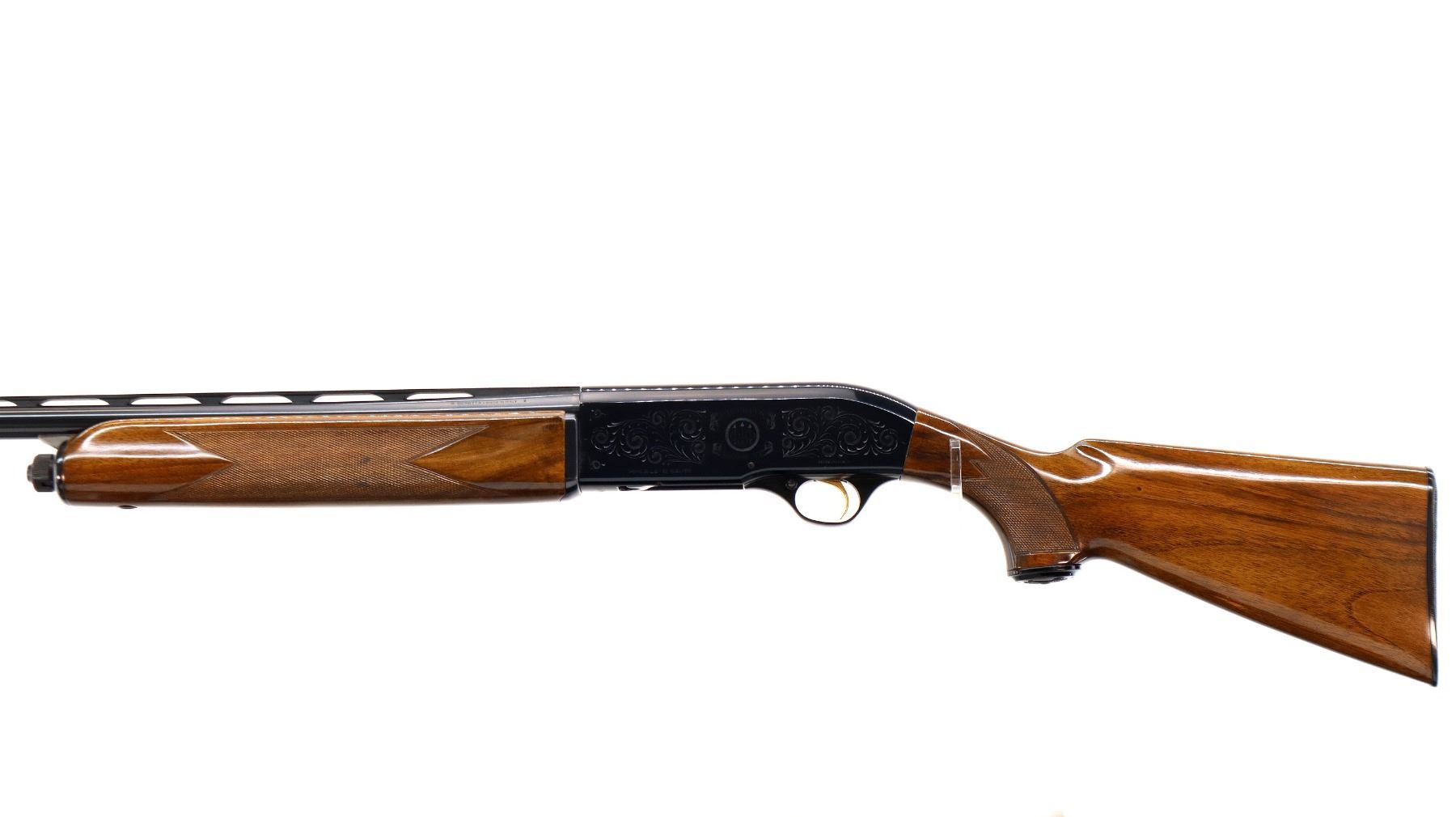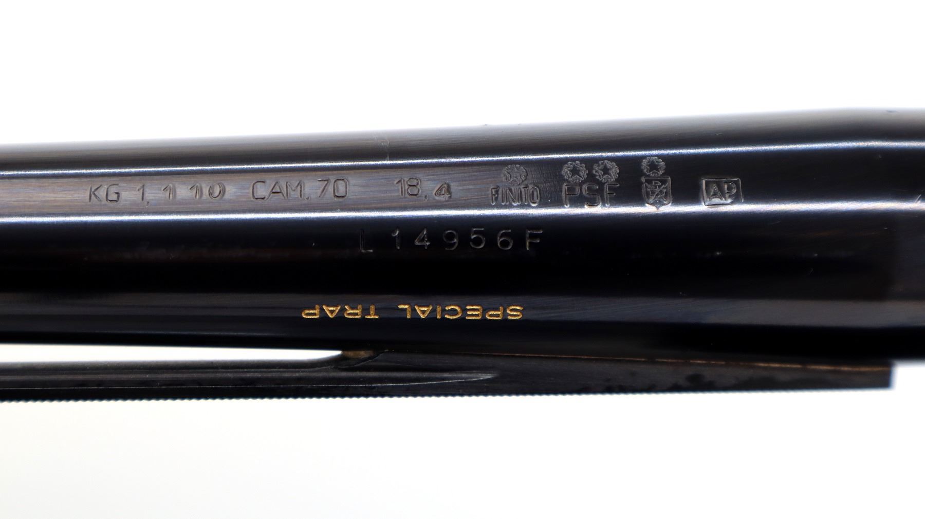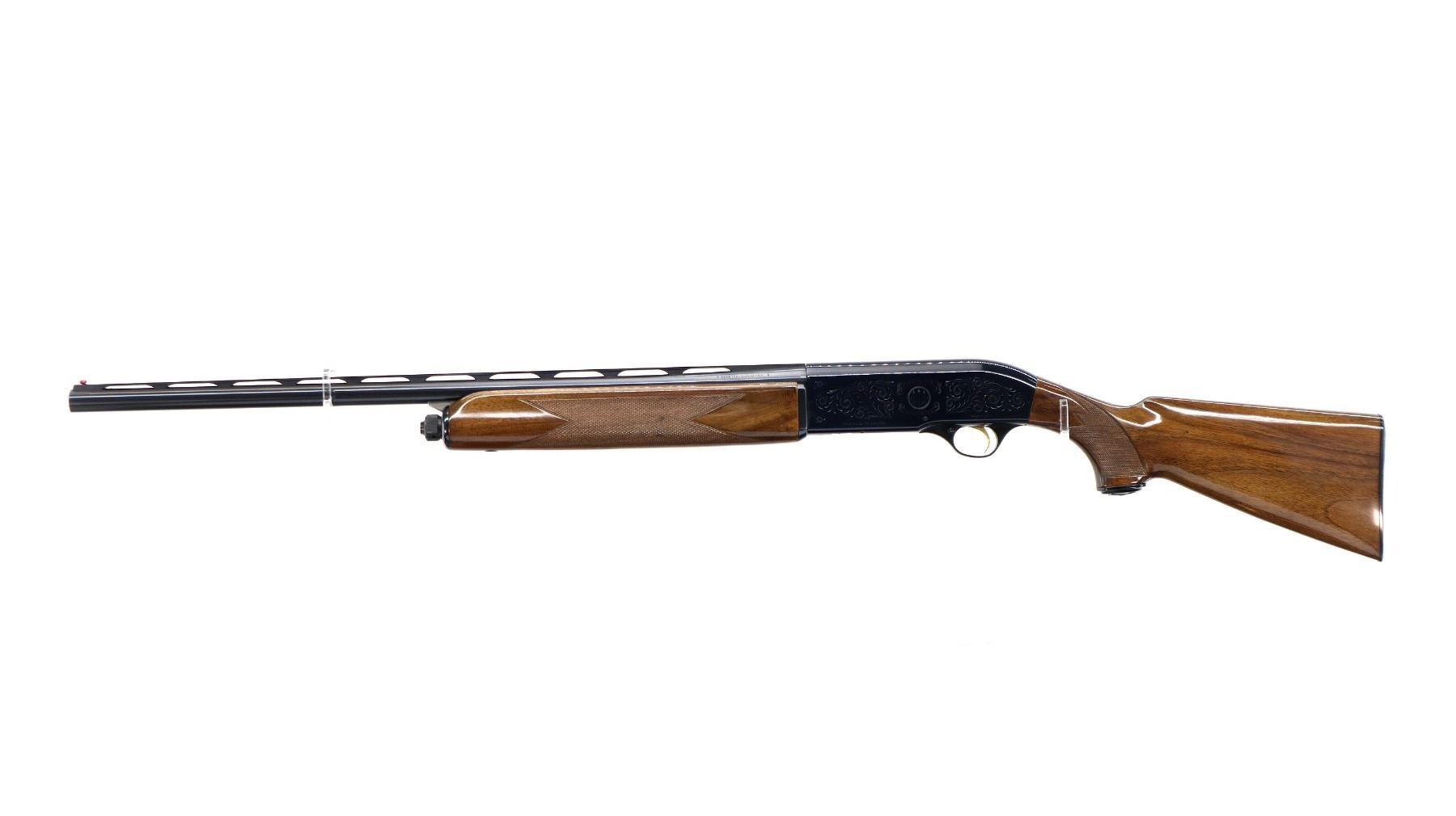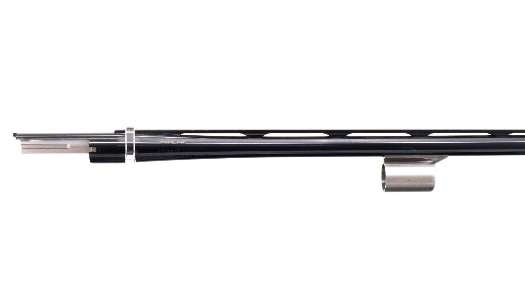 Main Description: Red fiber optic front bead, blued vent rib barrel, engraved alloy receiver, gold trigger. Two piece wood stocks, checkered forearm, pistol grip and black polymer butt plate, grip cap. Spare Barrel: Special Trap, 12 G X 2 3/4", 30", Bore is Excellent, Fixed Full Choke, Red fiber optic bead, polish blued finish, vent rib.