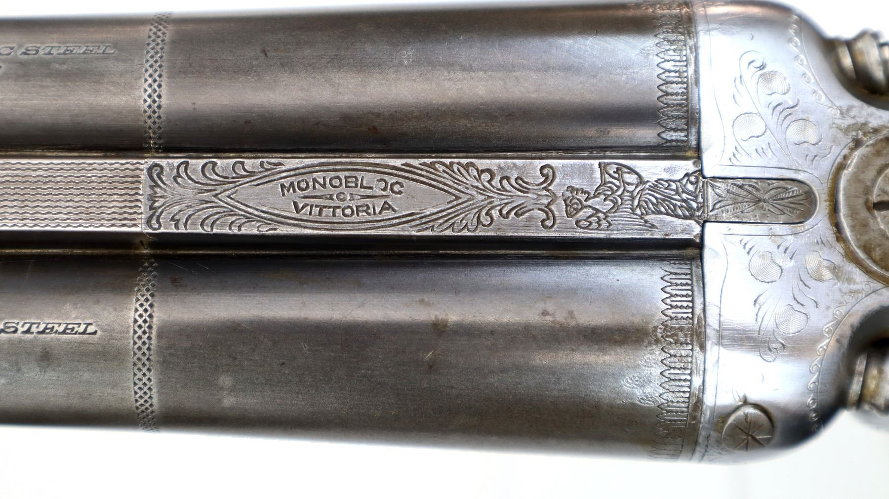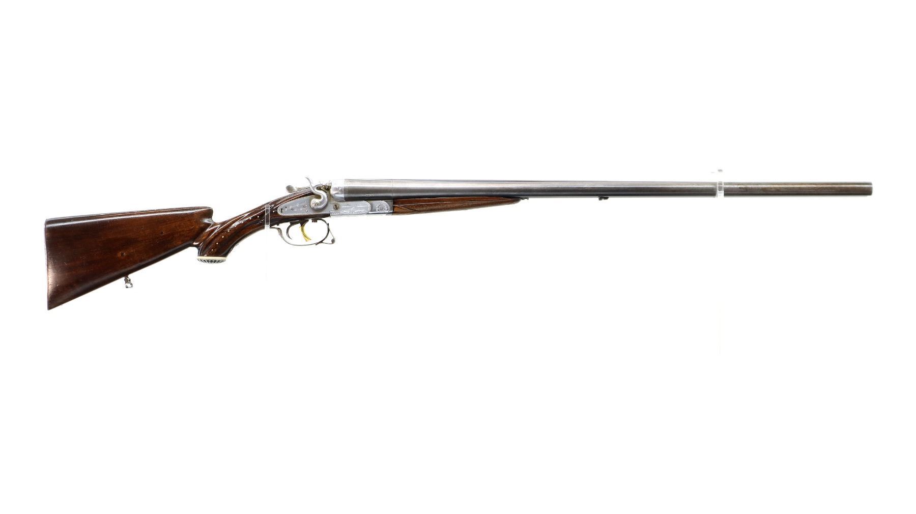Main Description: White front bead, raised rib between barrels, engraved silver receiver with side locks, grooved spur hammers that function, extractor, double triggers, engraved trigger guard which has been repaired. Two piece wood stocks, checkered forearm, grooved pistol grip with brass pins, grooved steel butt plate, grip cap, sling swivels.