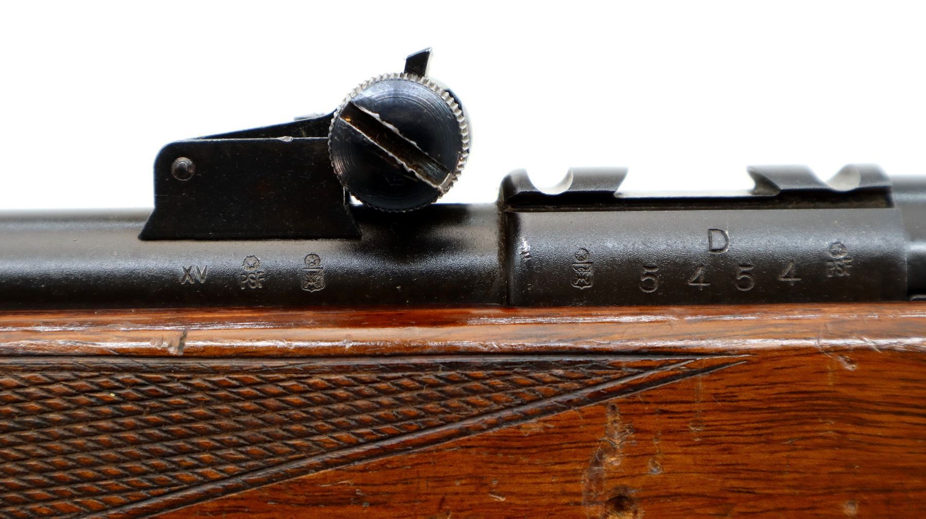 Main Description: Blade front sight with ramp, adjustable u notched rear sight, blued finish, heavy barrel, receiver has integral scope mount, butter knife bolt handle. One piece wood stock, checkered forearm and pistol grip chipped behind receiver, European cheek rest, grooved black polymer butt plate, stock and plate modified at heel, grip cap, sling swivels, short rail under forearm.