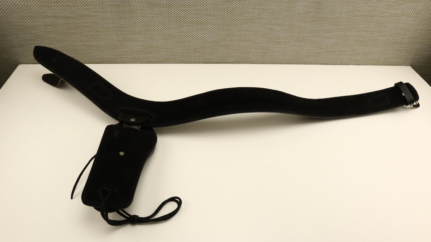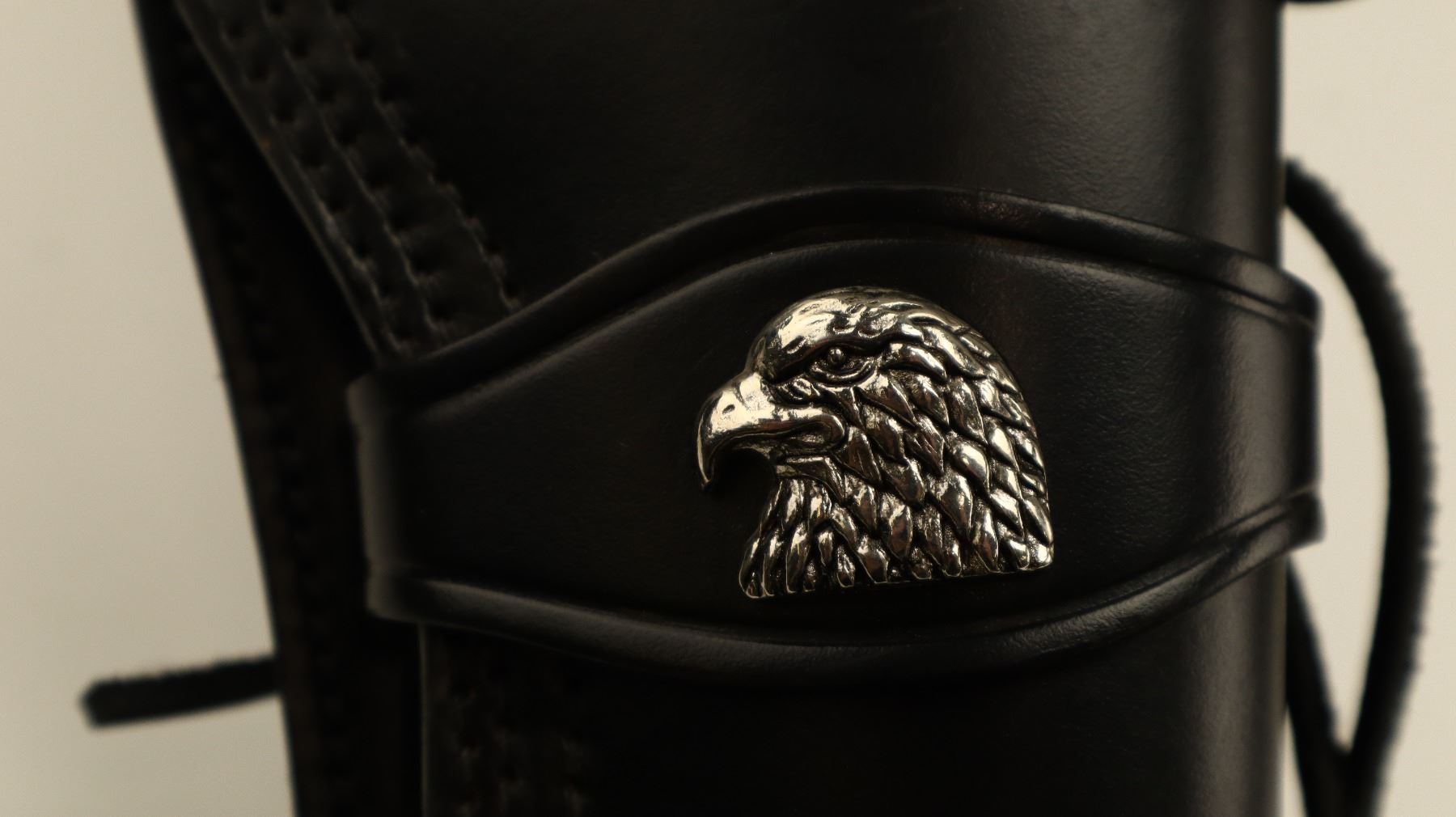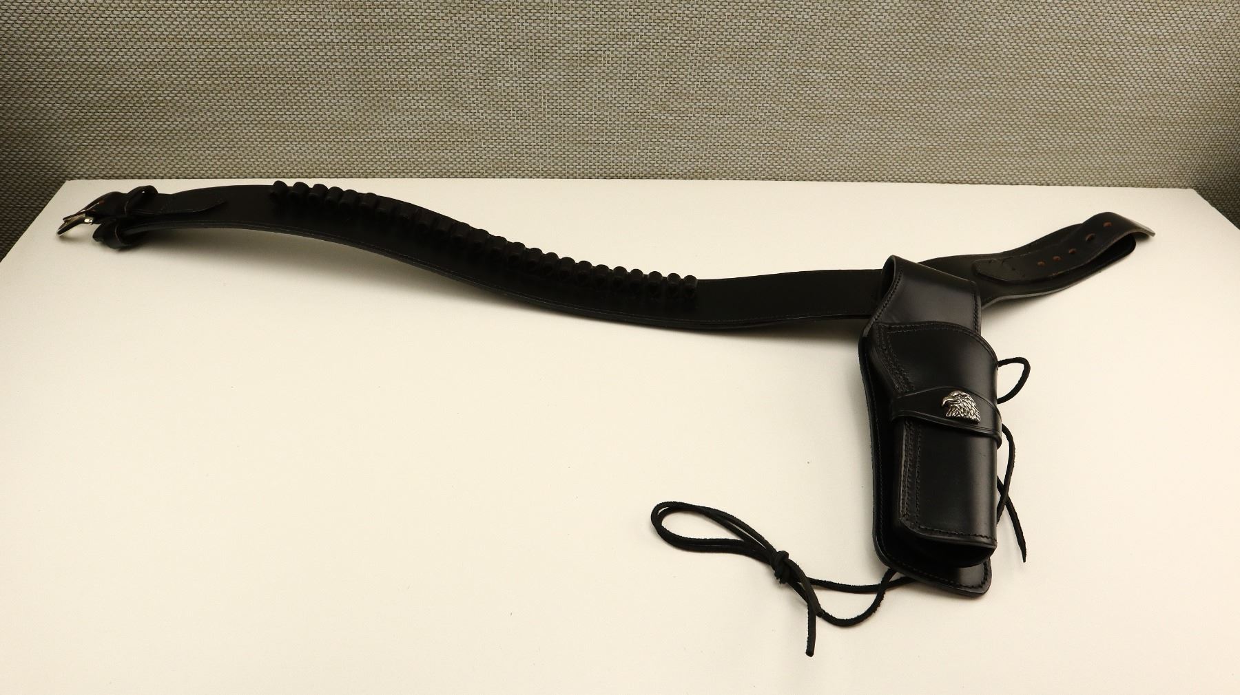 BLACK LEATHER AMMO BELT WITH REVOLVER HOLSTER , APPROX. 38" FROM MIDDLE HOLE IN BELT, RIGHT HANDED HOLSTER, REVOLVER STYLE, APPROX. 7", EAGLE TYPE CREST ON HOLSTER, AMMO LOOPS FIT .45 COLT ROUNDS.