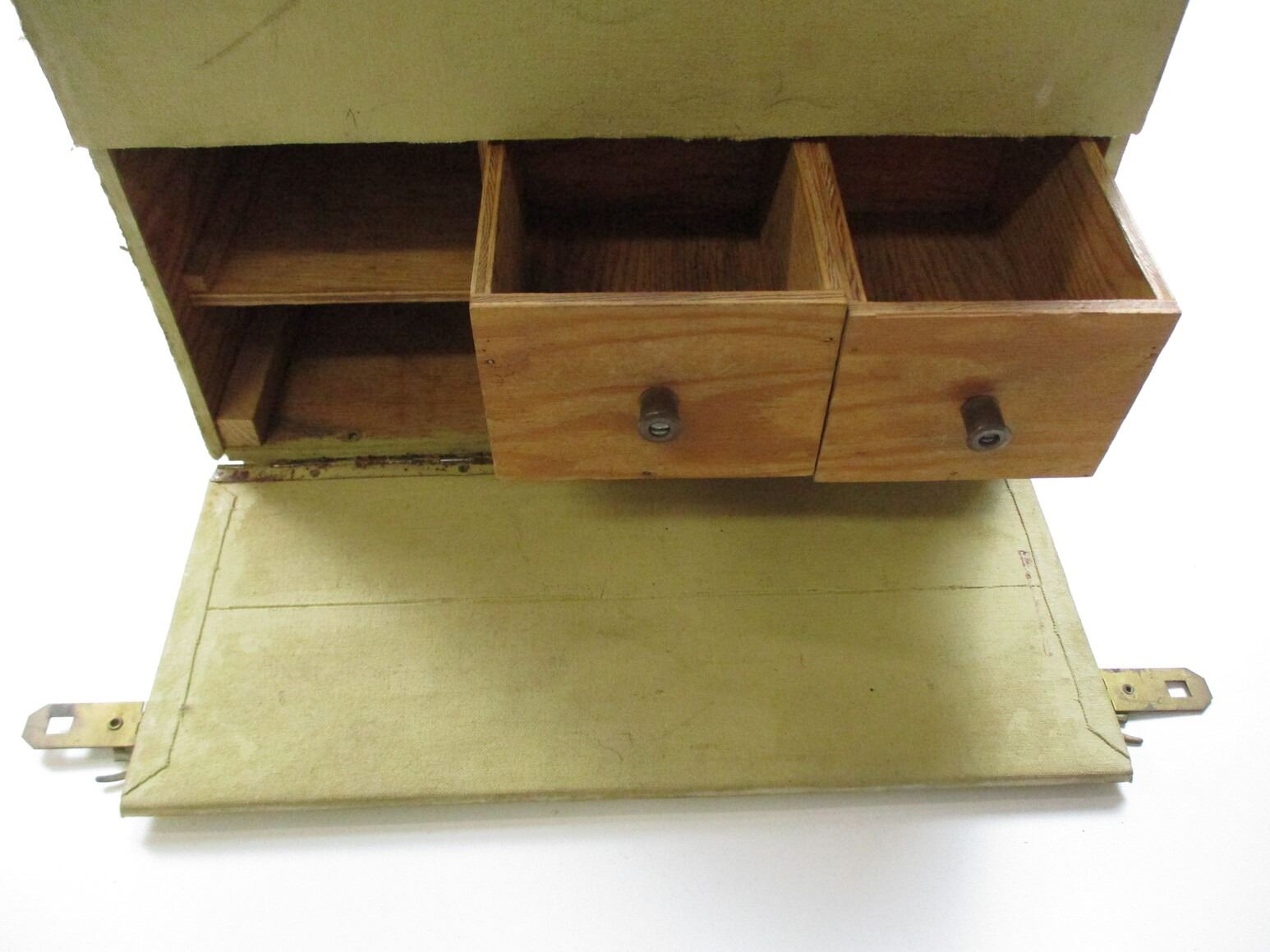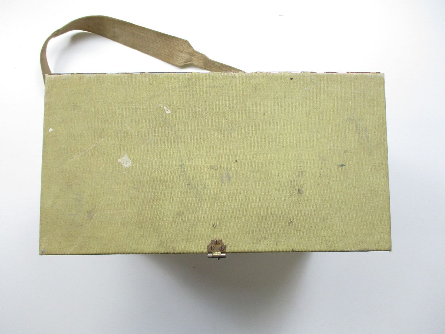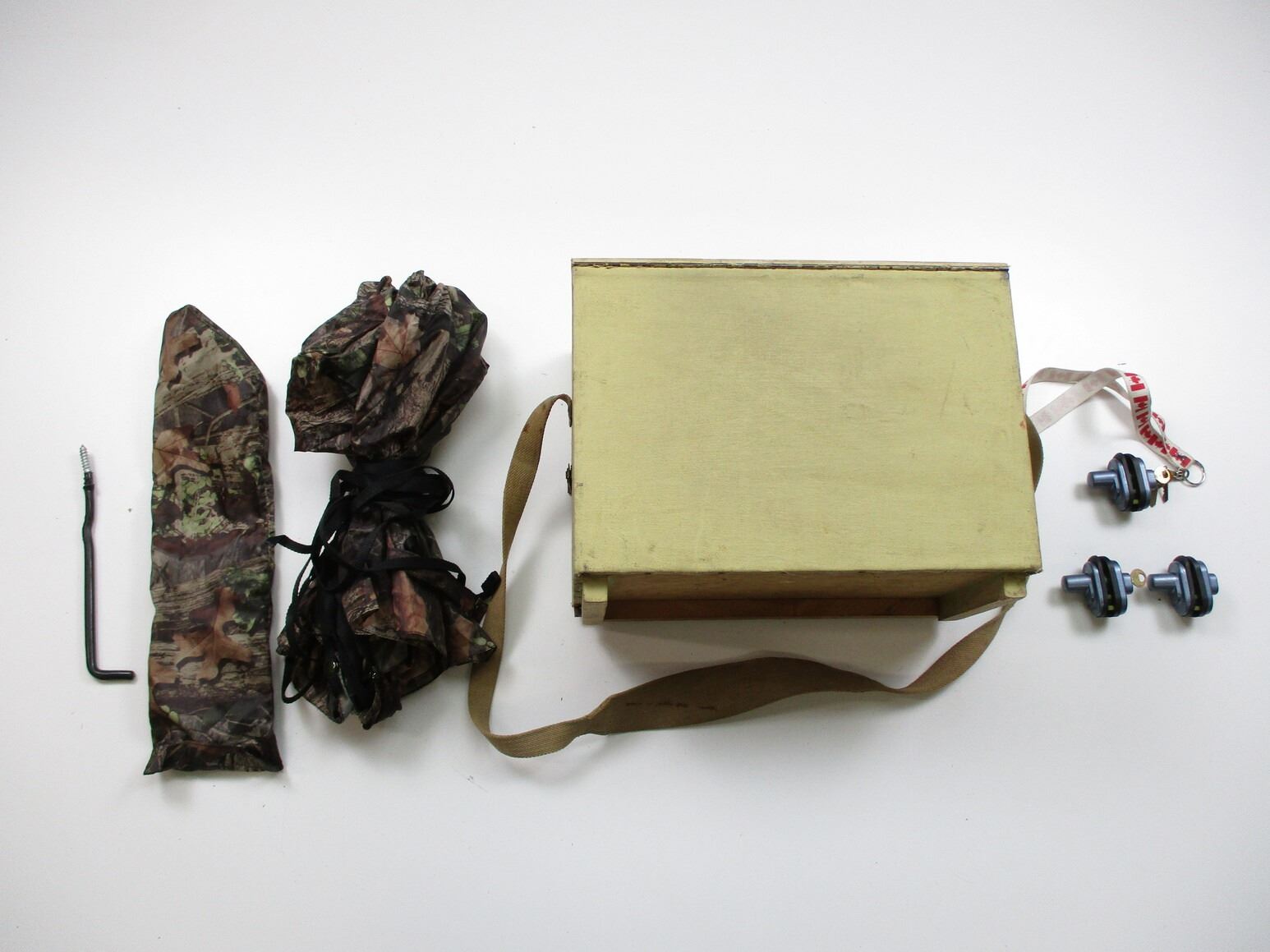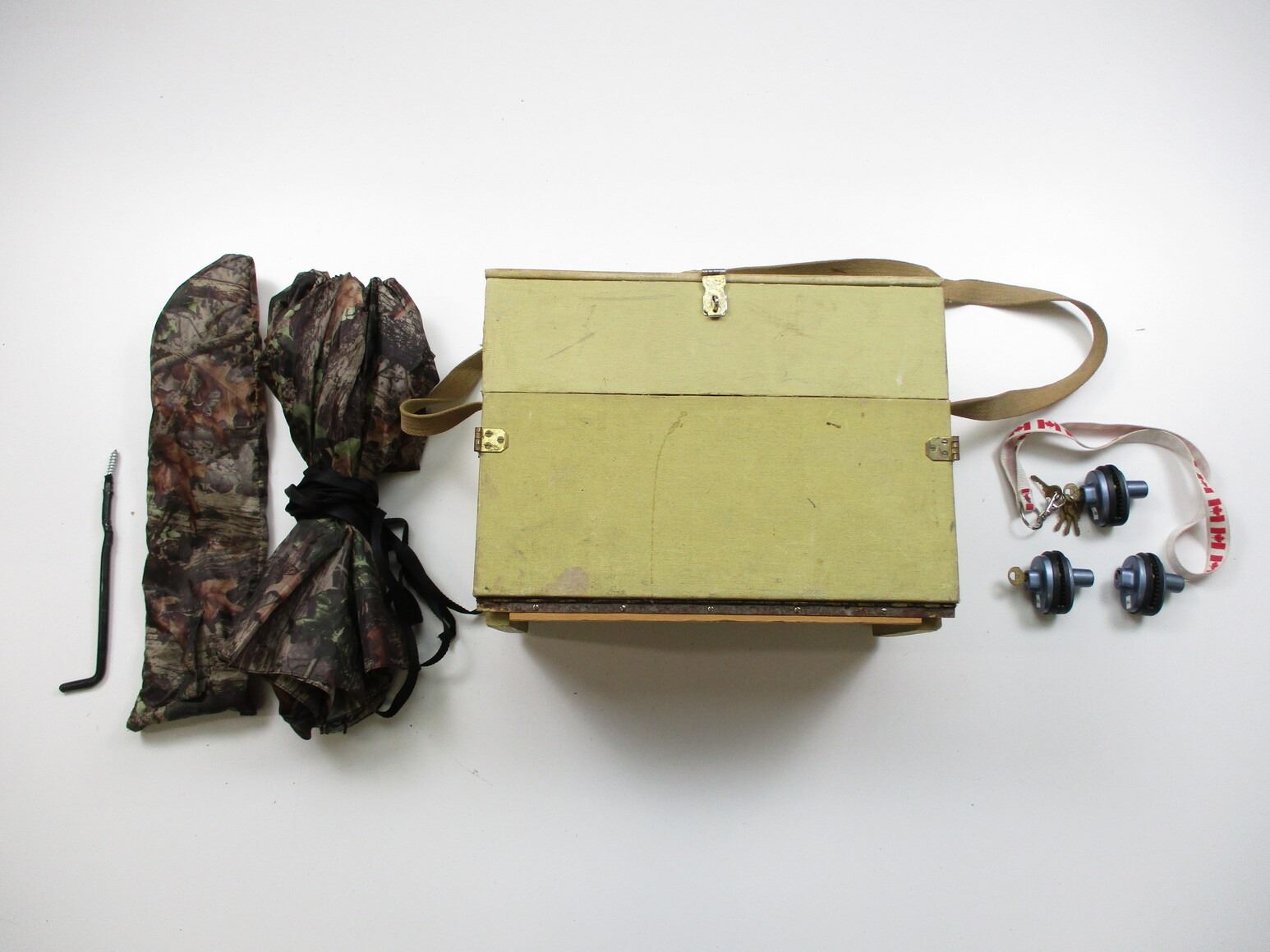 BLACK POWDER RANGE BOX ETC , WITH TOP & SIDE COMPARTMENT, WITH CANVAS CARRY STRAP, APPROX. 14.5 X 7.5 X 11.25", (3) TRIGGER LOCKS, WITH KEYS, (1) HUNTING TYPE UMBRELLA.