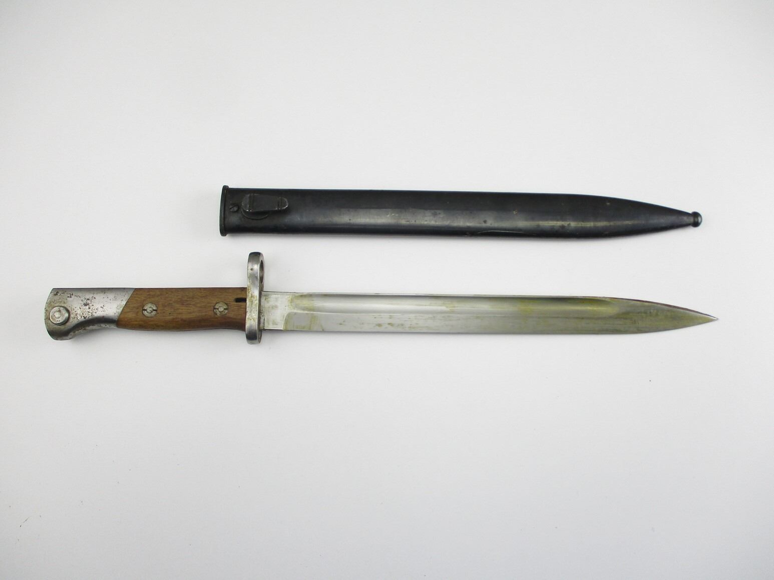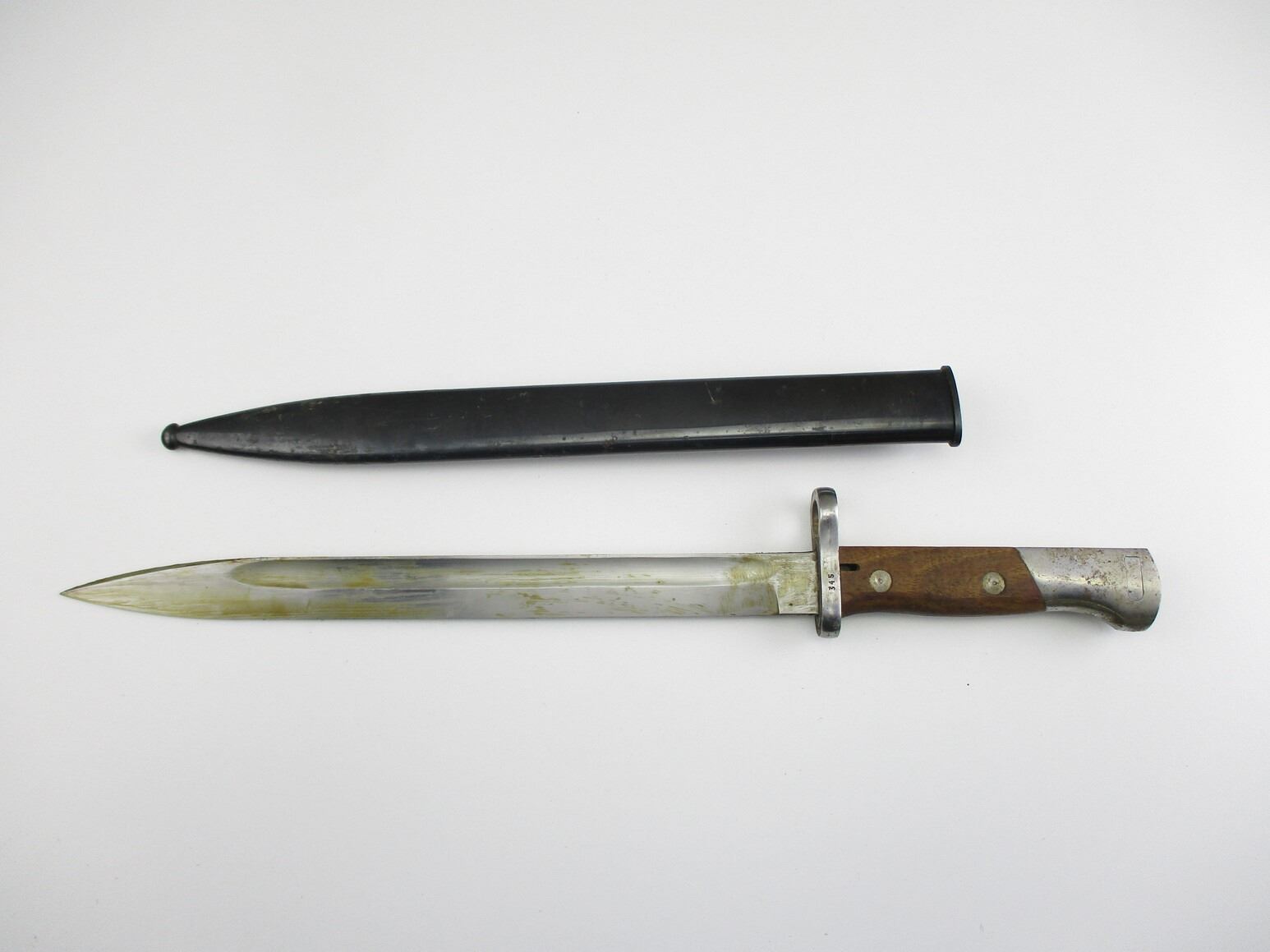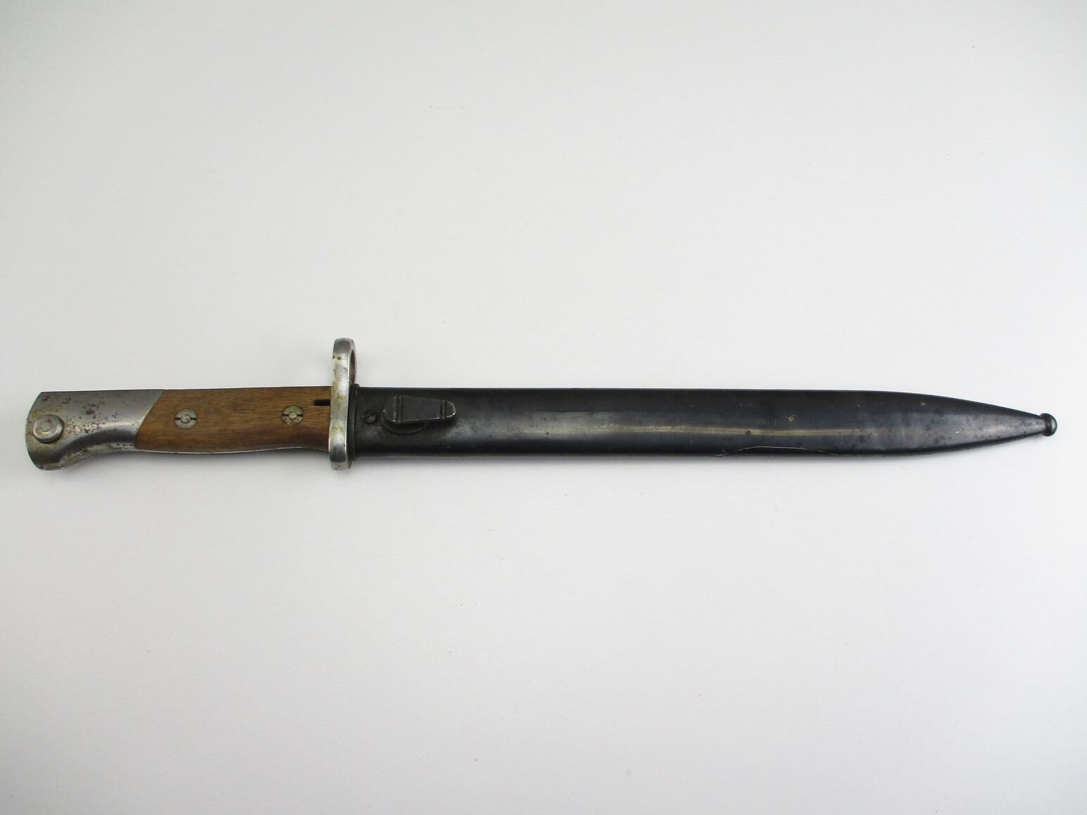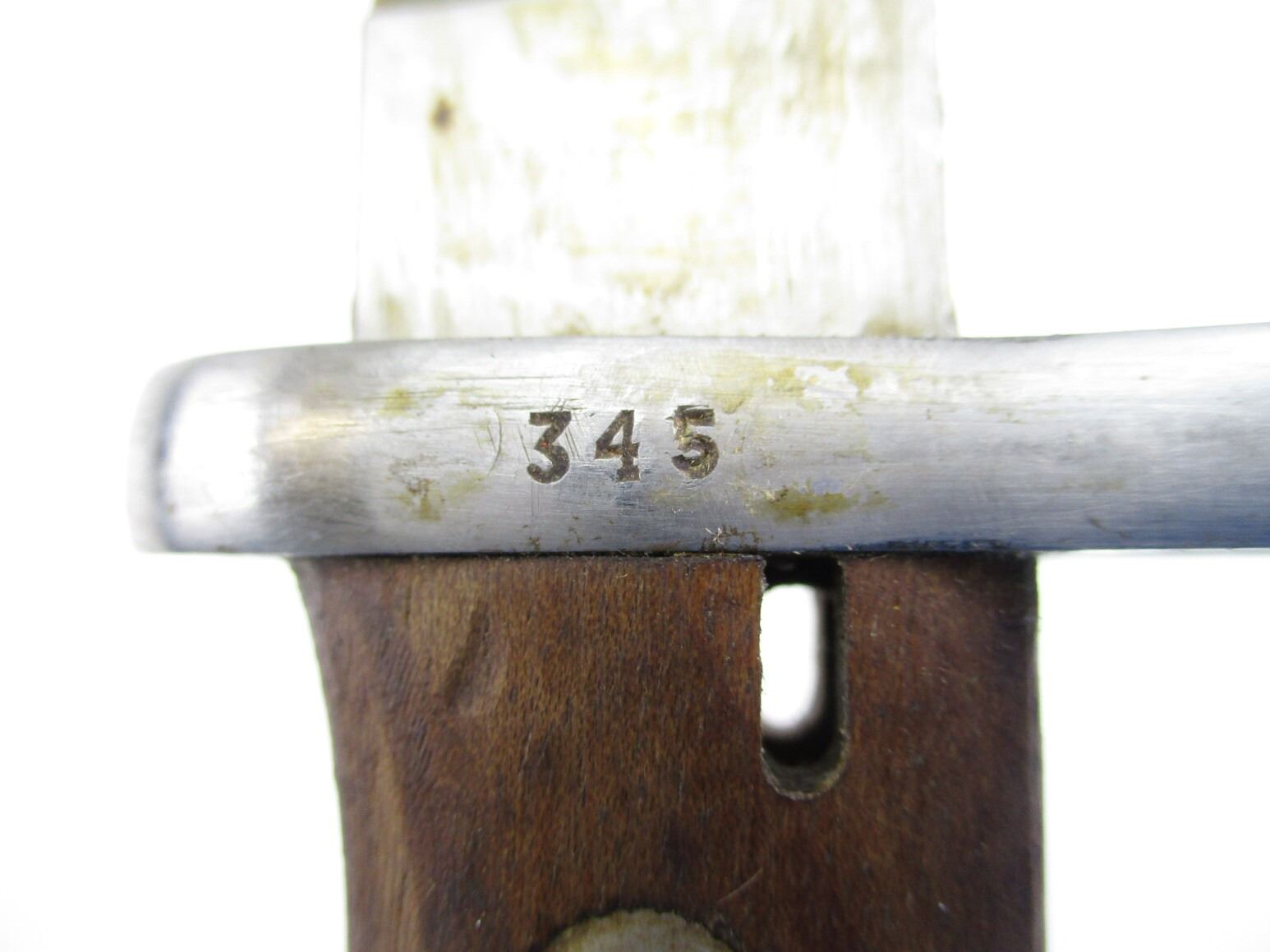 BRAZILIAN M1935 BAYONET. (1) FITS 7MM M1935 RIFLES, CROSS-PIECE MARKED: "345", 2-PIECE WOOD GRIP, METAL POMMEL, NO VISIBLE MARKINGS, STEEL SCABBARD, NO VISIBLE MARKINGS, BLADE APPROX. 11.75" & OAL APPROX. 17".