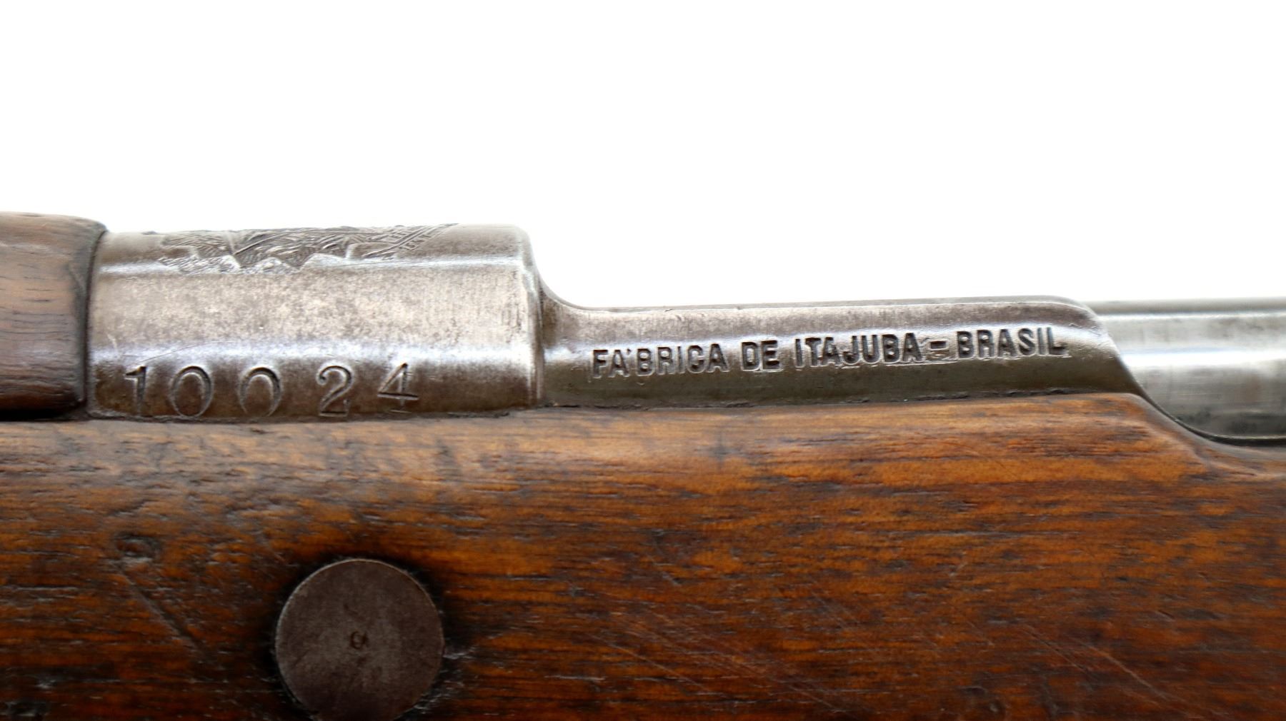 Main Description: Manufactured by Itajuba Brazil, floor plate mismatched. Blade front sight with ramp, adjustable u notched rear sight, Brazilian crest on receiver ring, turned down bolt handle. Two piece full military wood stocks, finger grooved forearm, pistol grip, smooth cupped steel butt plate with checkered trap, unmarked steel stock disk, rear swivel stud, front swivel, bayonet lug, threaded muzzle, missing cleaning rod.