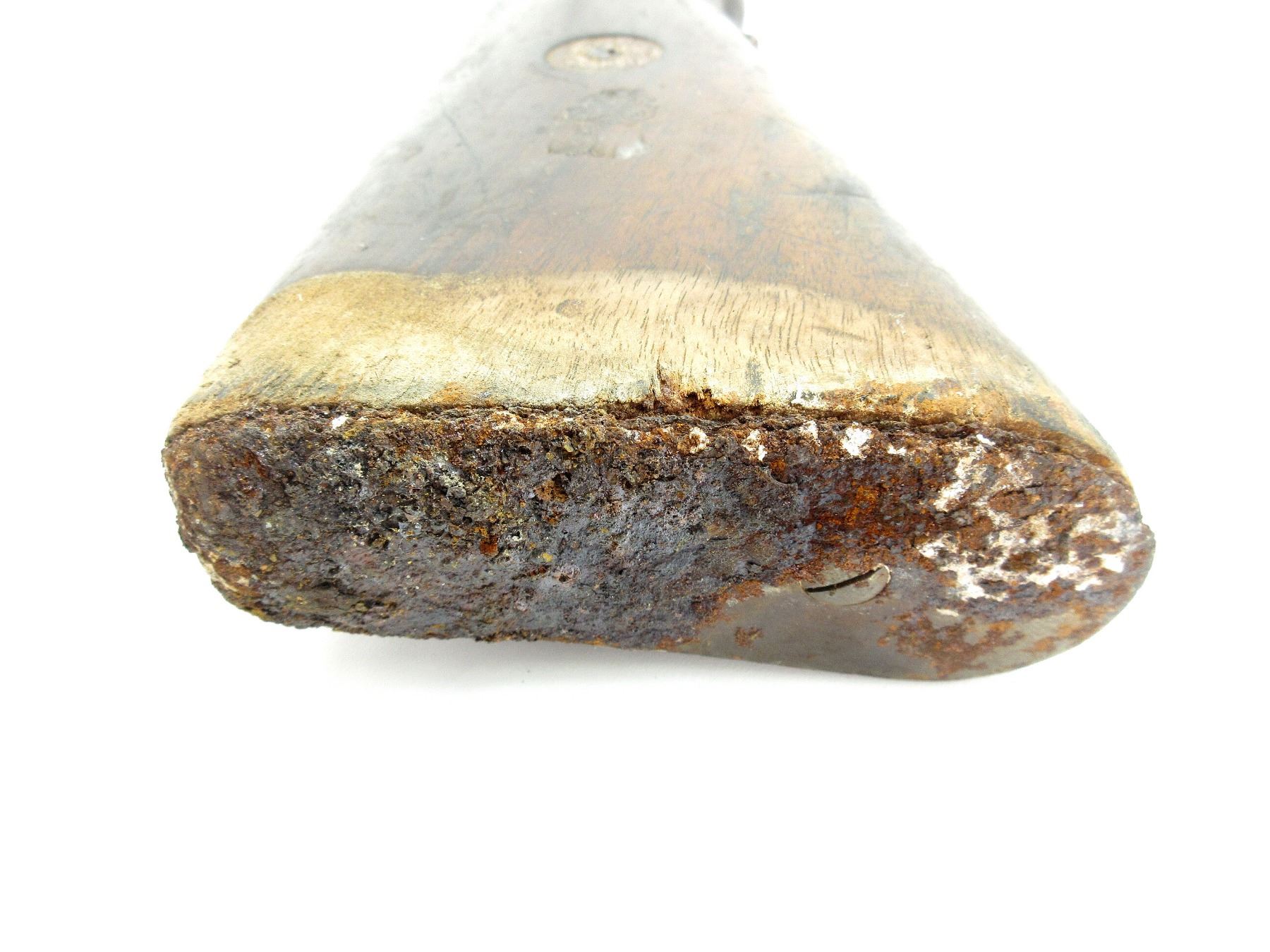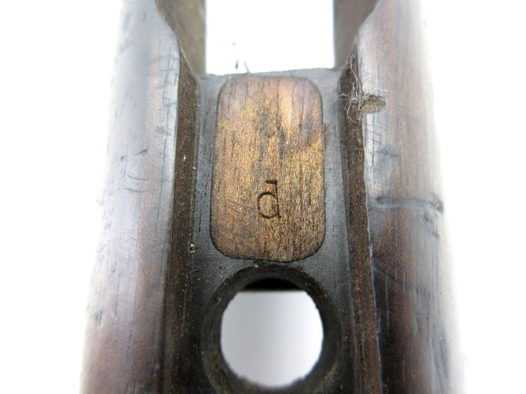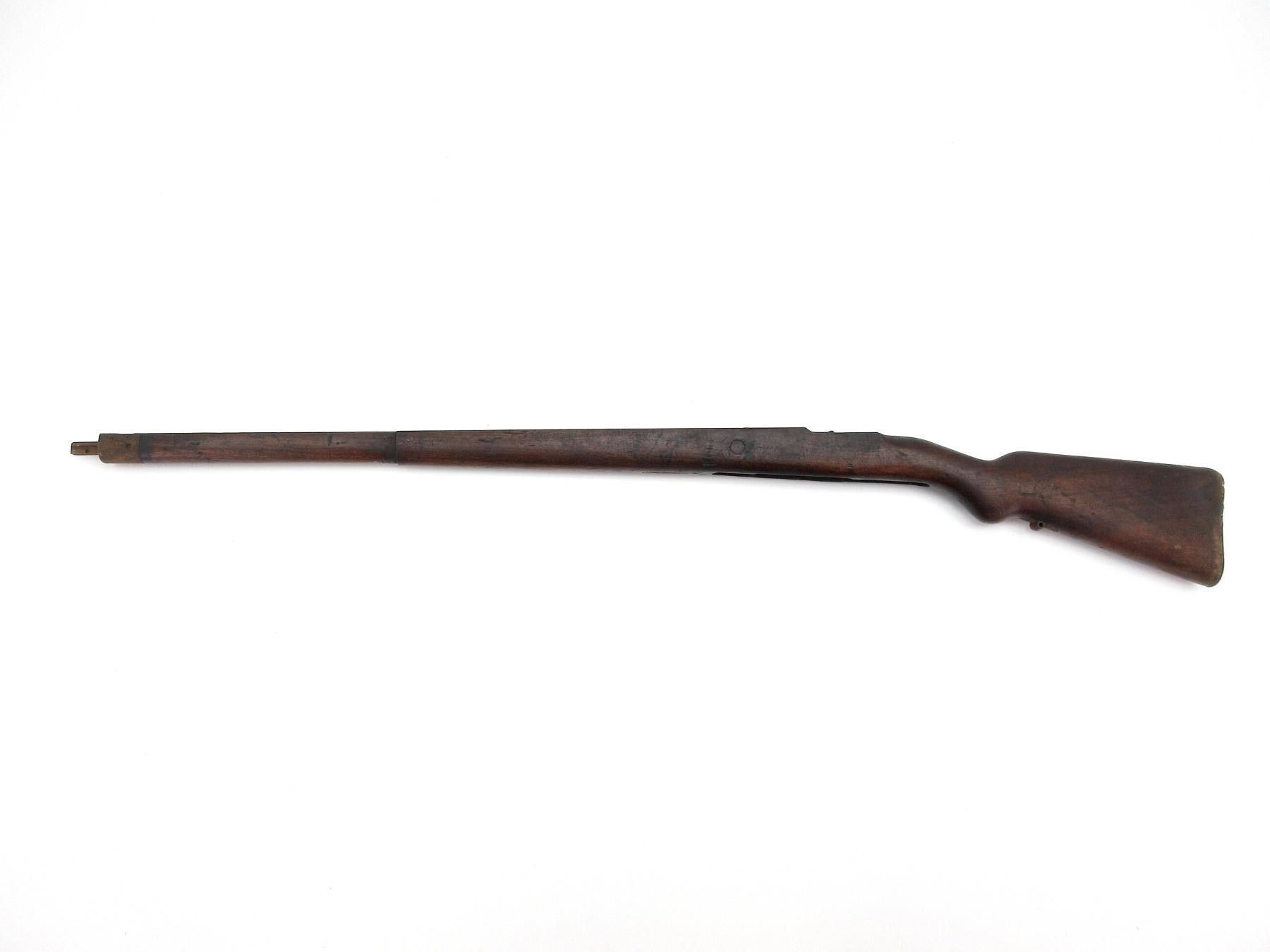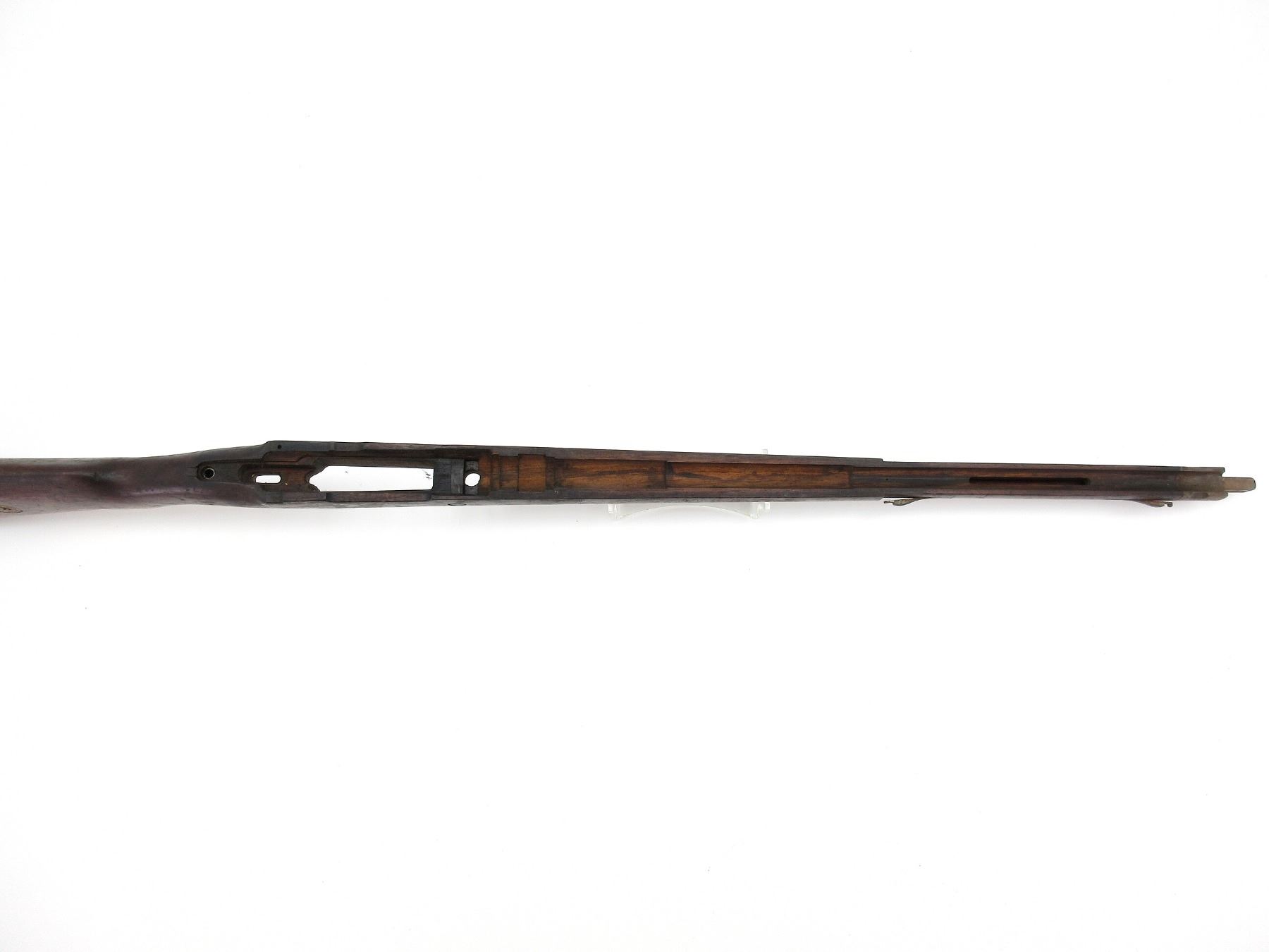 (1) WOOD CONSTRUCTION, MARKED: "S", WITH VARIOUS OTHER MARKINGS, INCLUDES RUSTED BUTT PLATE & NOSE CAP, POSSIBLY FITS MODEL 1908, SHOWS WEAR & TEAR, CRACKED / CHIPPED AT BUTT, WITH WATER DAMAGE, OAL APPROX. 44.75". MAY REQUIRE FITTING. SEE PHOTOS.