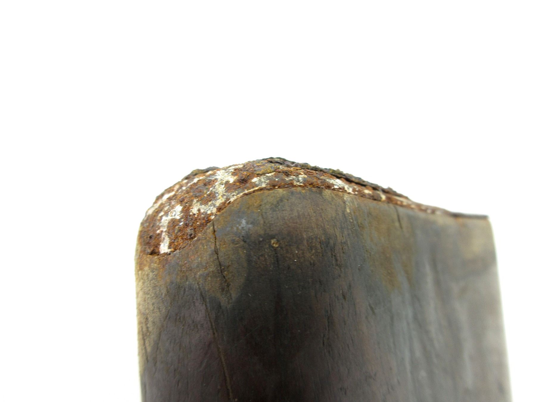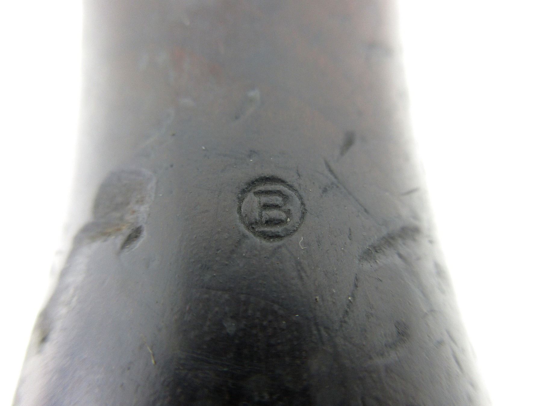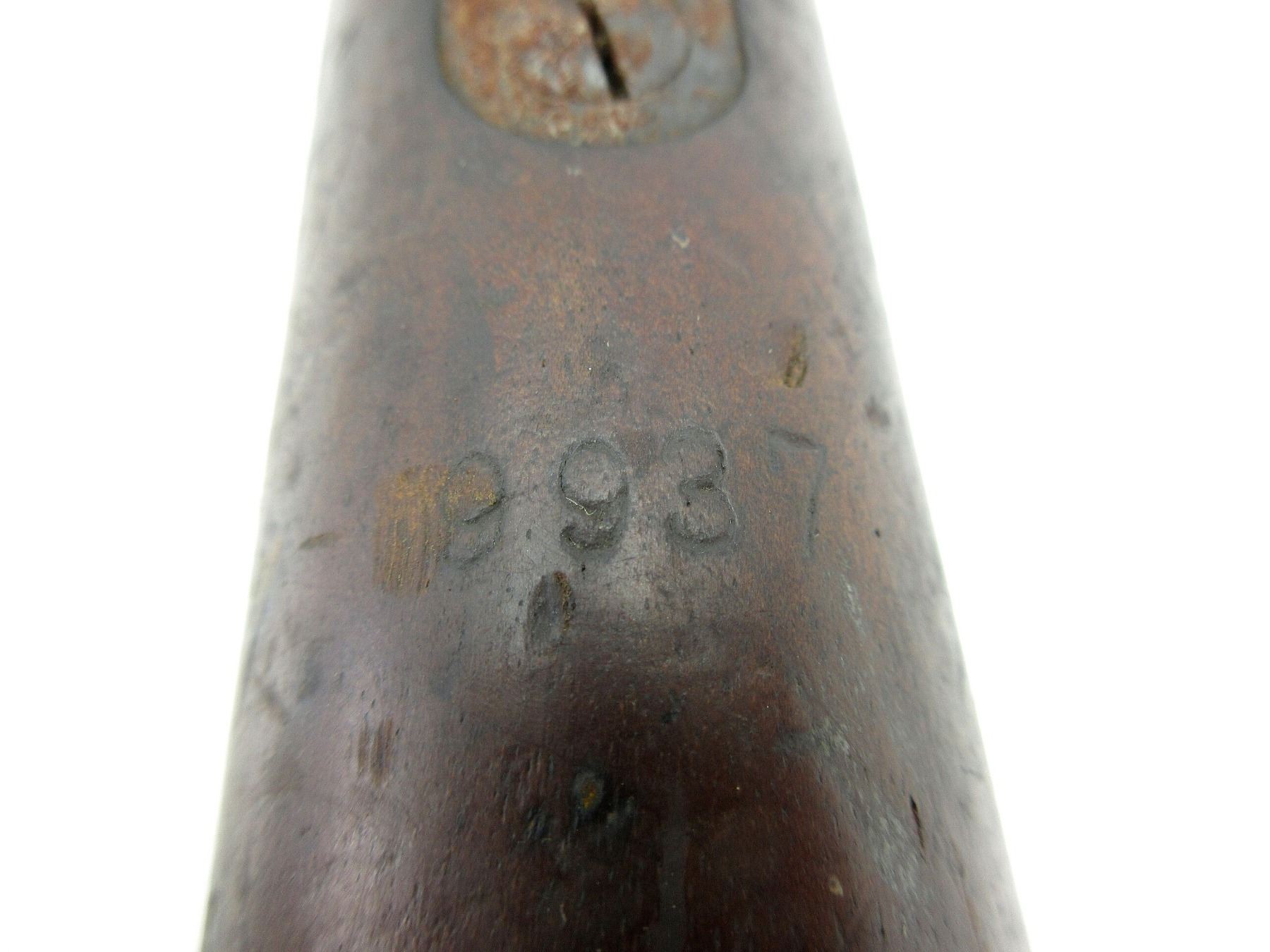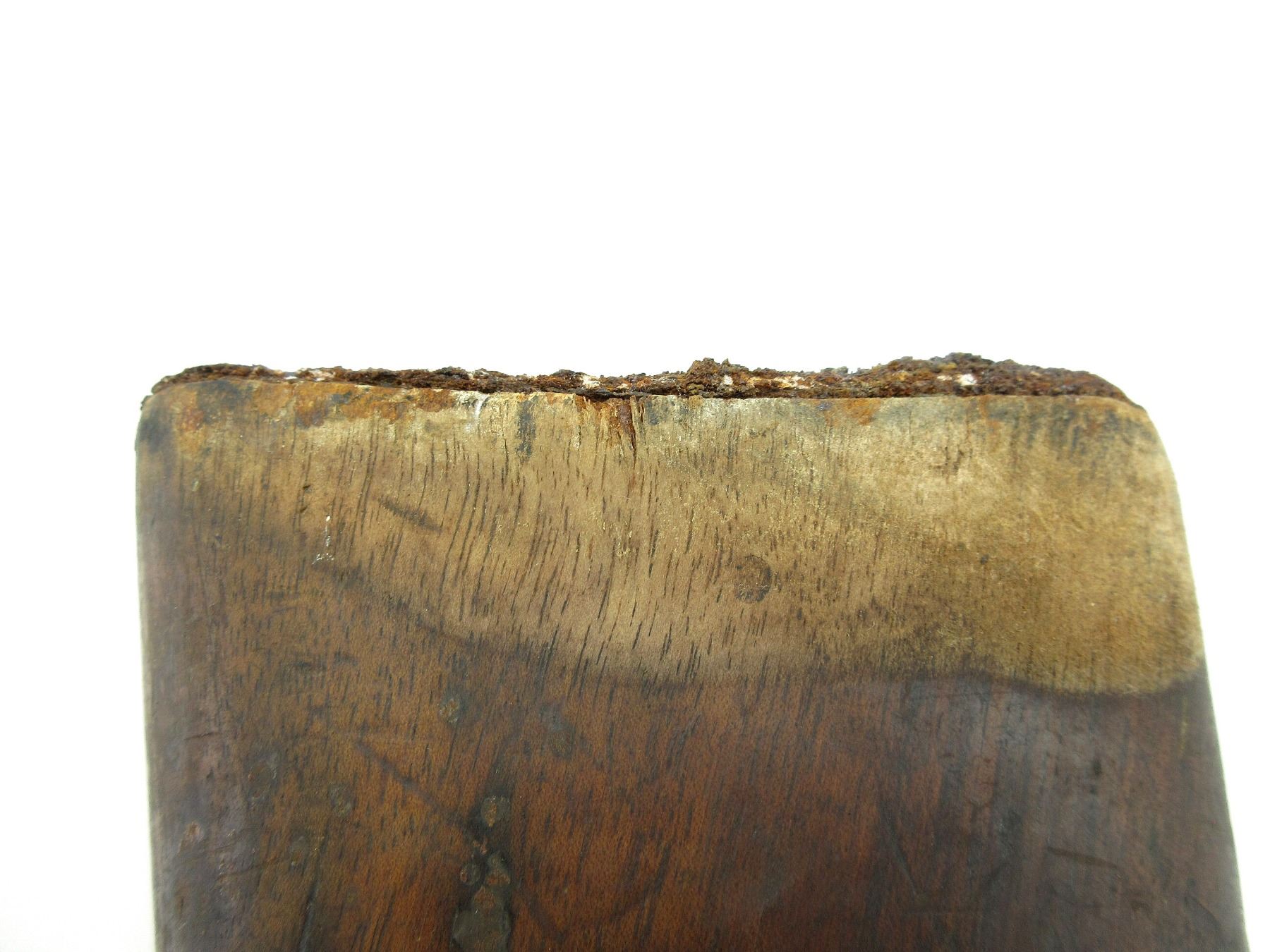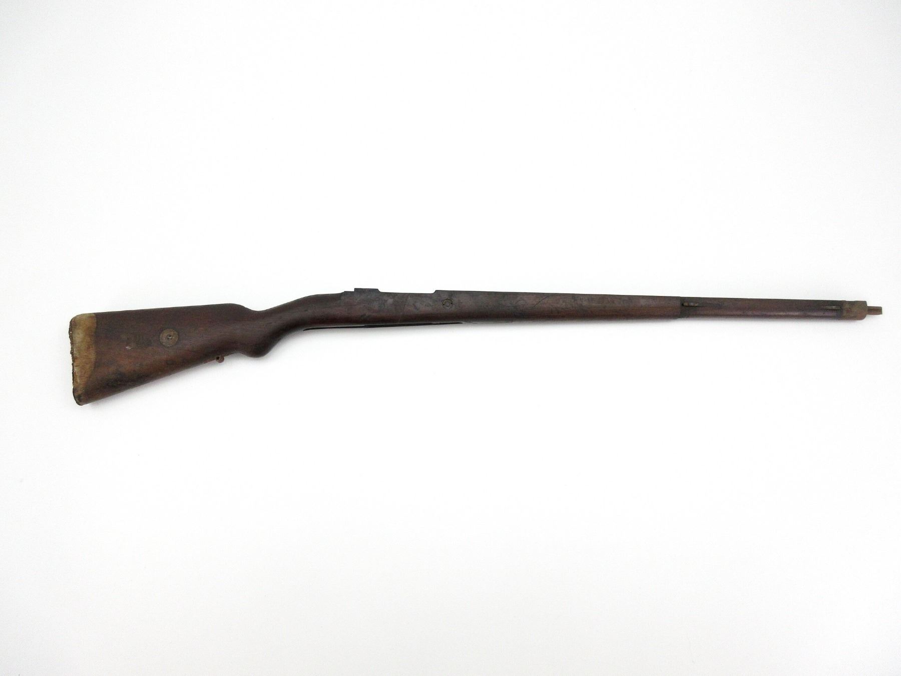 (1) WOOD CONSTRUCTION, MARKED: "S", WITH VARIOUS OTHER MARKINGS, INCLUDES RUSTED BUTT PLATE & NOSE CAP, POSSIBLY FITS MODEL 1908, SHOWS WEAR & TEAR, CRACKED / CHIPPED AT BUTT, WITH WATER DAMAGE, OAL APPROX. 44.75". MAY REQUIRE FITTING. SEE PHOTOS.