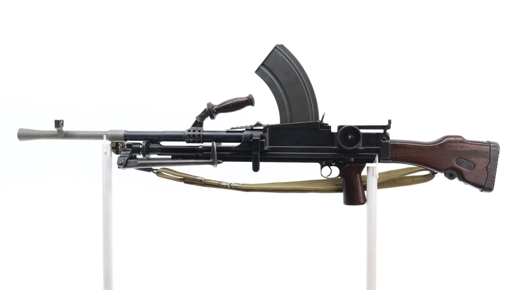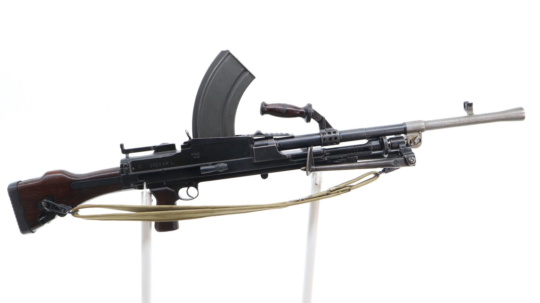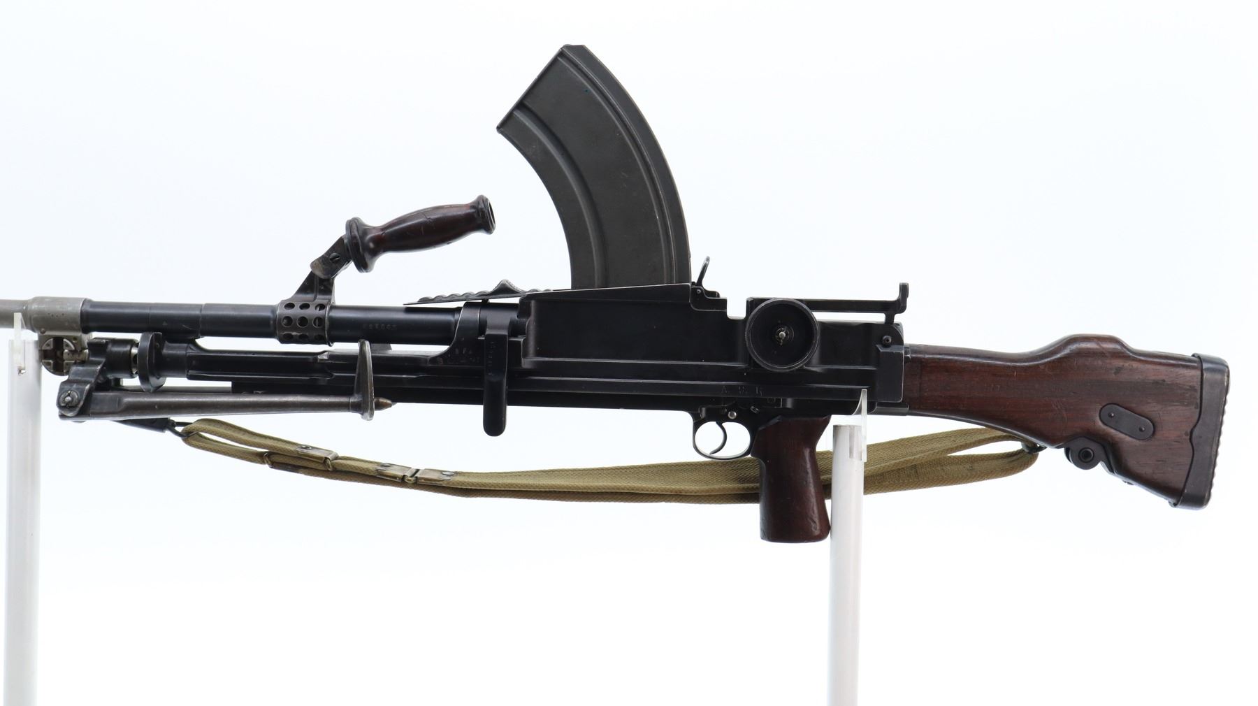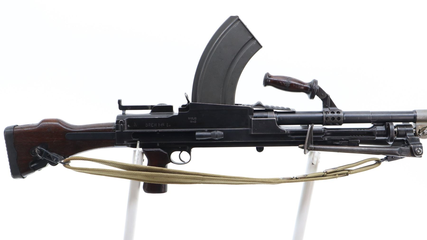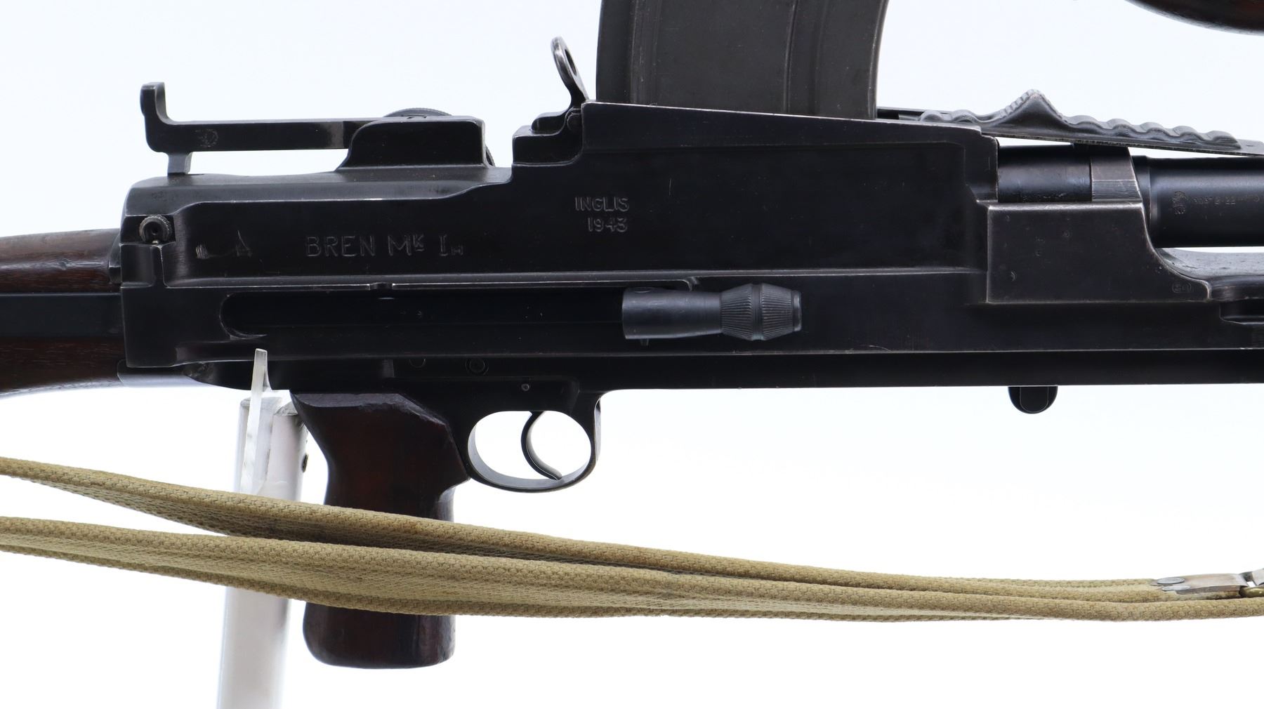 7+/10 , BREN GUN , MODEL: MKI MLMG , CALIBER: 303 BR , COMES WITH, DEWAT LETTER & MAGAZINE , MANUFACTURED BY INGLIS 1943. BLADE FRONT SIGHT WITH EARS, ADJUSTABLE REAR DIAL PEEP SIGHT, MKII CARRYING HANDLE, WOOD PISTOL GRIP, MKI WOOD BUTT STOCK, CUPPED STEEL BUTT PLATE, MAG AND EJECTION PORT DUST COVERS, LATE WAR STAMPED BIPOD, P37 CANVAS SLING WITH SLING HOOKS, TRIPOD MOUNTING POINTS, STAINLESS STEEL FLASH HIDER, METAL PARTS HAS VARIOUS CANADA PROOF MARKS STAMPED ON THEM. METAL FINISH SHOWS SOME SCRATCHES, HANDLING MARKS AND WEAR. STOCK SHOWS SOME DINGS AND SCRATCHES , ACTION: DEWAT , BARREL LENGTH: 25" , CONDITION: 7+/10 , SERIAL # 8T4361 5T8865 , CLASS: DEACTIVATED, NO LICENSE REQUIRED