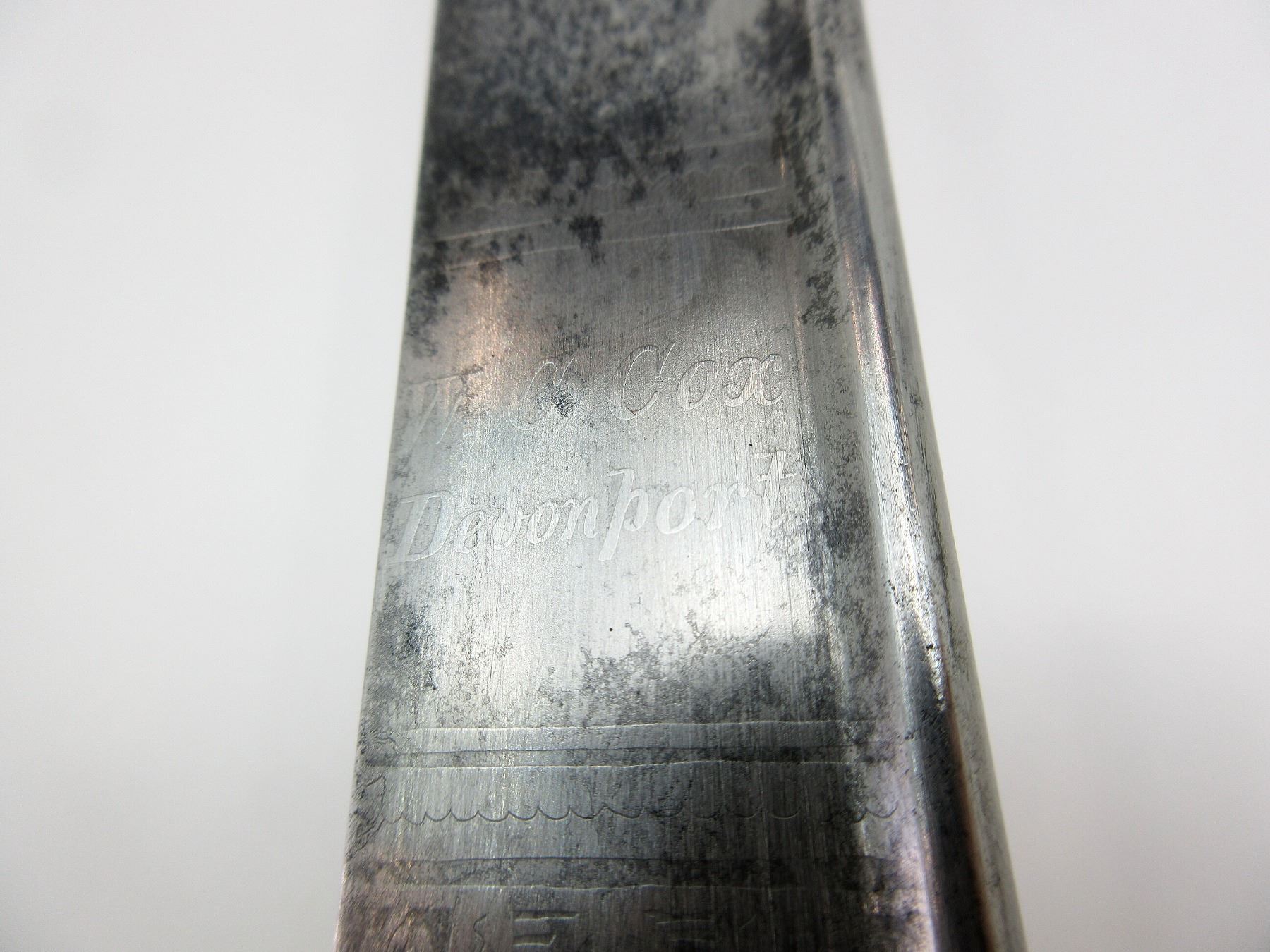 (1) PIPE-BACKED SWORD, RICASSO ACID ETCHED: "W.C. COX, DEVONPORT" & VARIOUS DECORATIVE ETCHINGS, DECORATIVE BRASS FOLDING HAND-GUARD WITH CROWN & ANCHOR SYMBOL, WIRE WRAPPED GRIP, SOME WIRE MISSING, BRASS LION'S HEAD POMMEL, NO VISIBLE MARKINGS, BRASS & LEATHER SCABBARD WITH TWO HANGERS, TIP BROKEN BUT REPAIRABLE, NO VISIBLE MARKINGS, BLADE APPROX. 30.5" & OAL APPROX. 36". SEE PHOTOS.