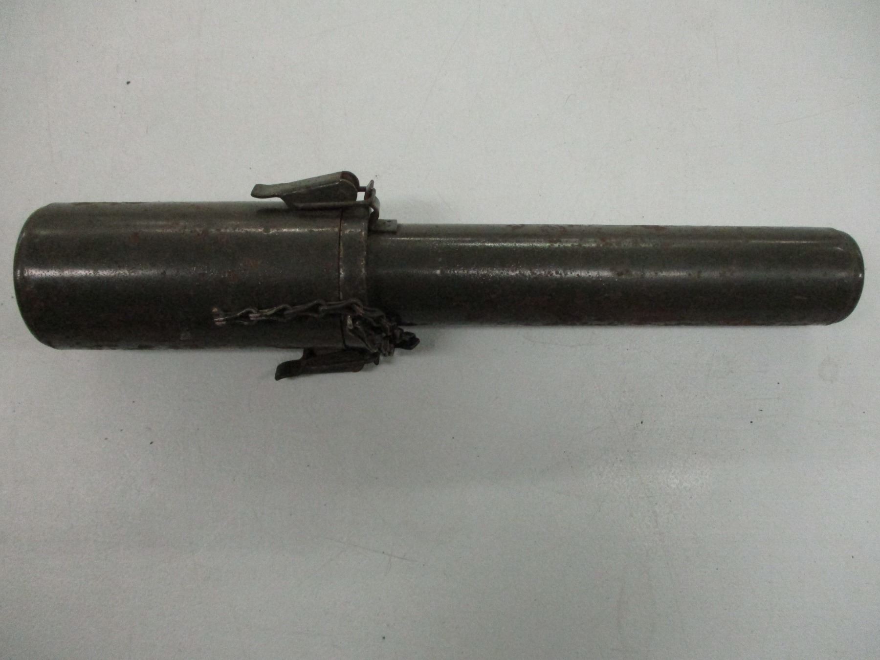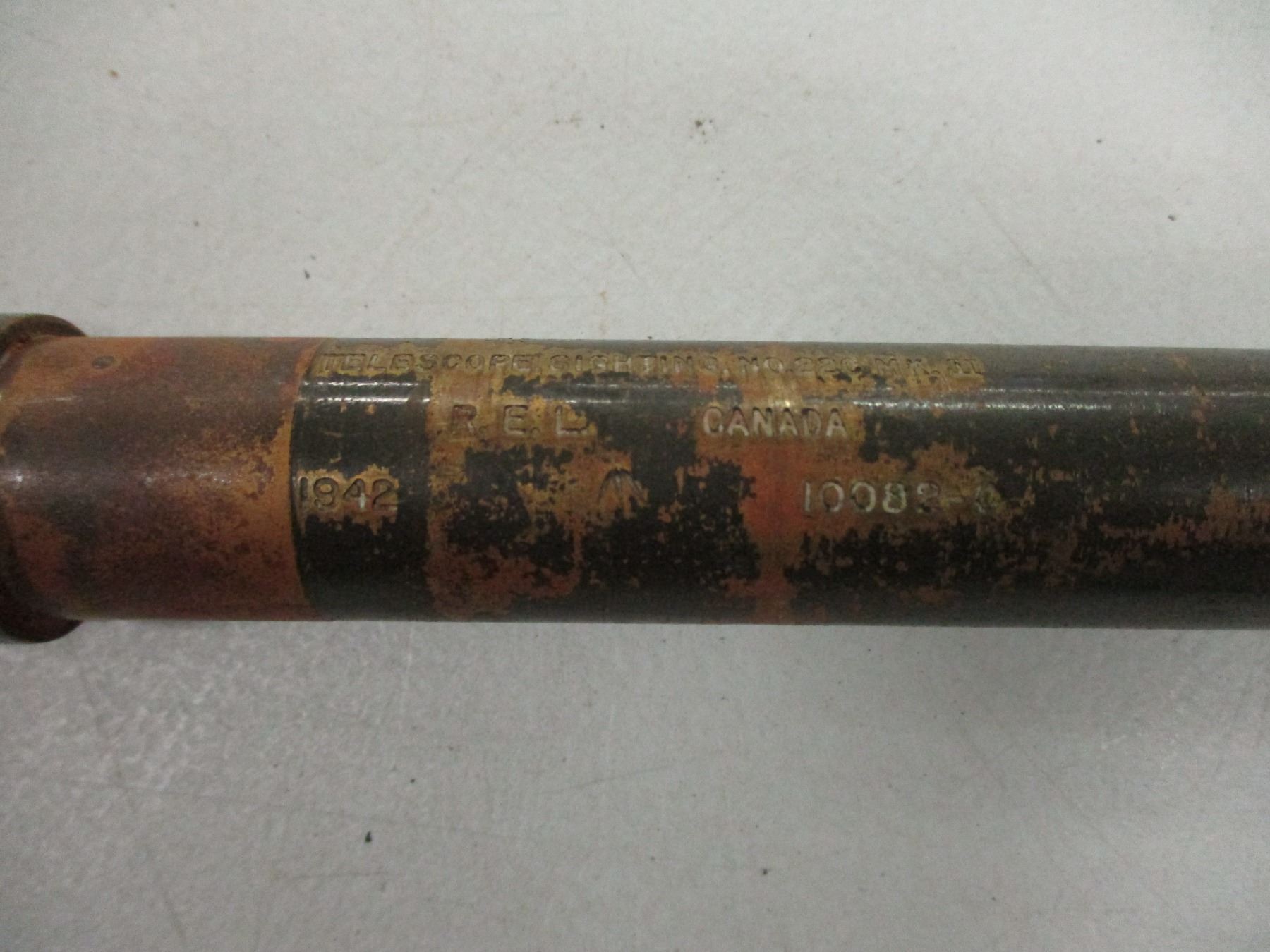 BRITISH ANTI TANK TELESCOPE + CASE , METAL, PAINTED GREEN. CLEAN OPTIC, CROSSHAIR MARKED R L. MARKED TELESCOPE, SIGHTING, NO 22C MK II. R.E.L. CANADA 1942, BROADARROW 10082-C. OUTER END OF SCOPE HAS BLACK GUNK. 2 PIECE GREEN METAL CASE CONNECTED WITH METAL CHAIN. MARKED IG-3019 R.E.L. CANADA 1942 BROADARROW.