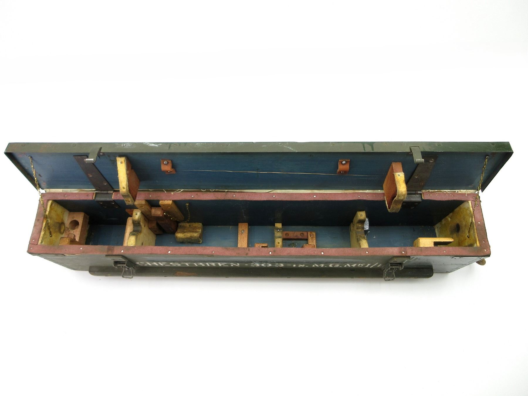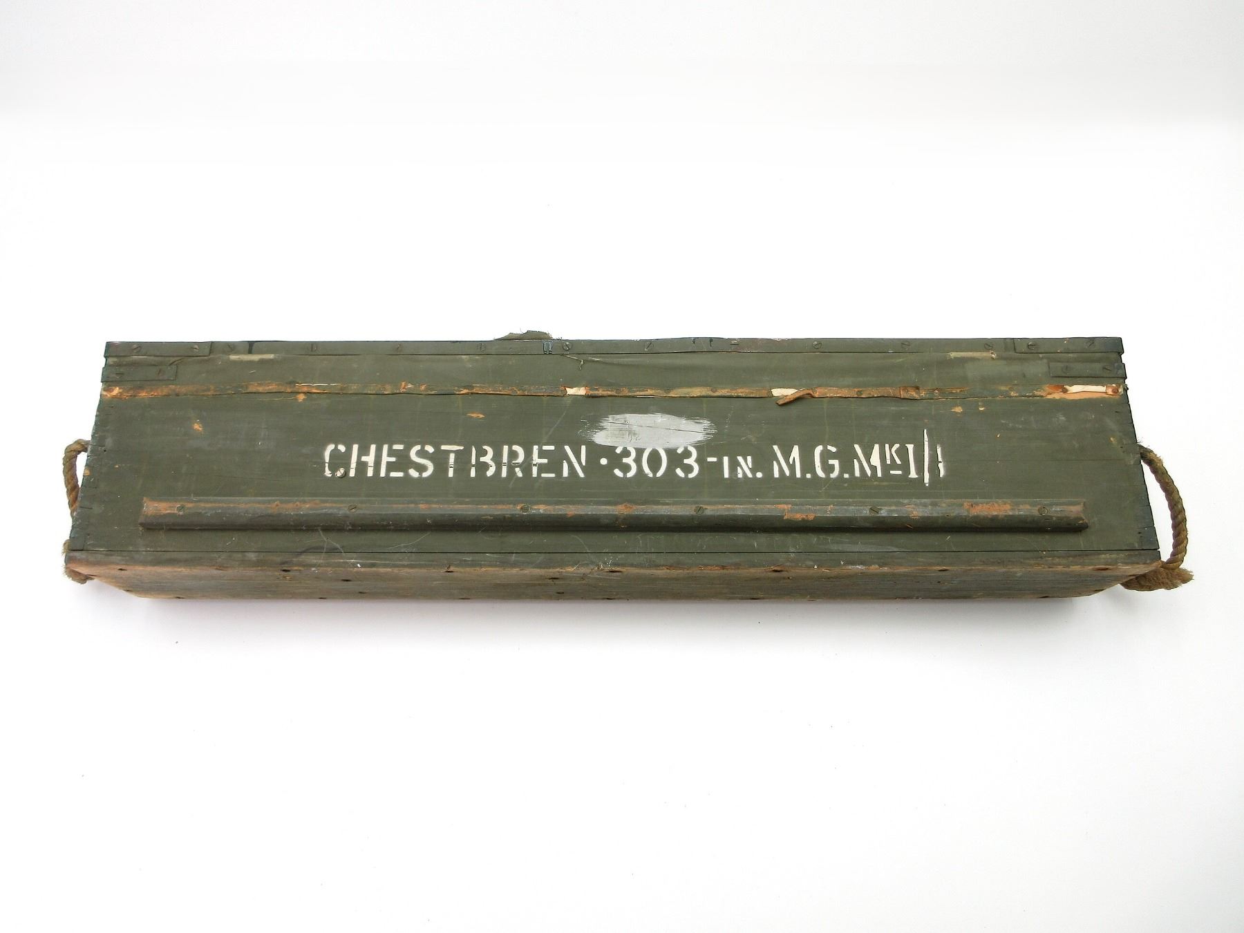 (1) FITS BREN'S MKI & MKII, VARIOUS DIVIDERS & BLOCKS INSIDE, GREEN PAINTED WOOD WITH ROPE HANDLES, METAL FITTINGS, MARKED: "P & B, 52", BROAD ARROW OVER "233", "CHEST BREN .303 IN M.G. MK 1/1" & VARIOUS OTHER MARKINGS, CRACK / SPLIT IN LID & APPROX. 49.75" X 9" X 11.25". SEE PHOTOS. *ADDITIONAL SHIPPING CHARGES MAY APPLY*