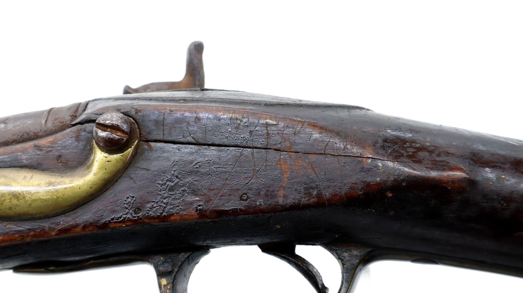 Main Description: Block front sight, tapered round barrel with British proof marks, lock converted from Flint to Percussion, smooth spur hammer which does not function, mounting screw will not tighten front one has been replaced. One piece sporterized wood stock, missing nose cap, straight grip, chipped and cracked behind barrel and around lock, smooth brass butt plate, tang marked CB54, butt stock has age cracks with notch in comb. Brass trigger guard, steel ramrod.