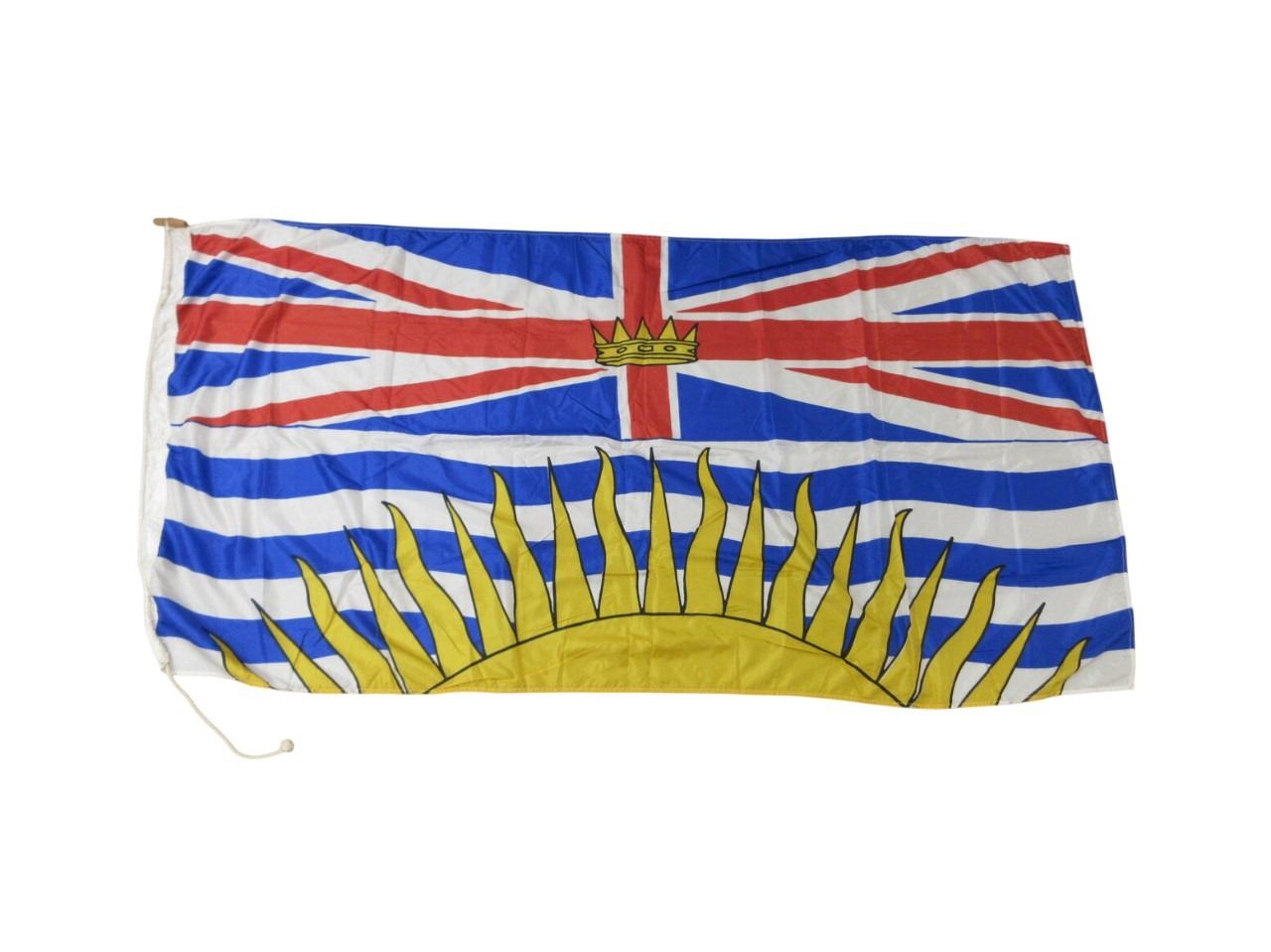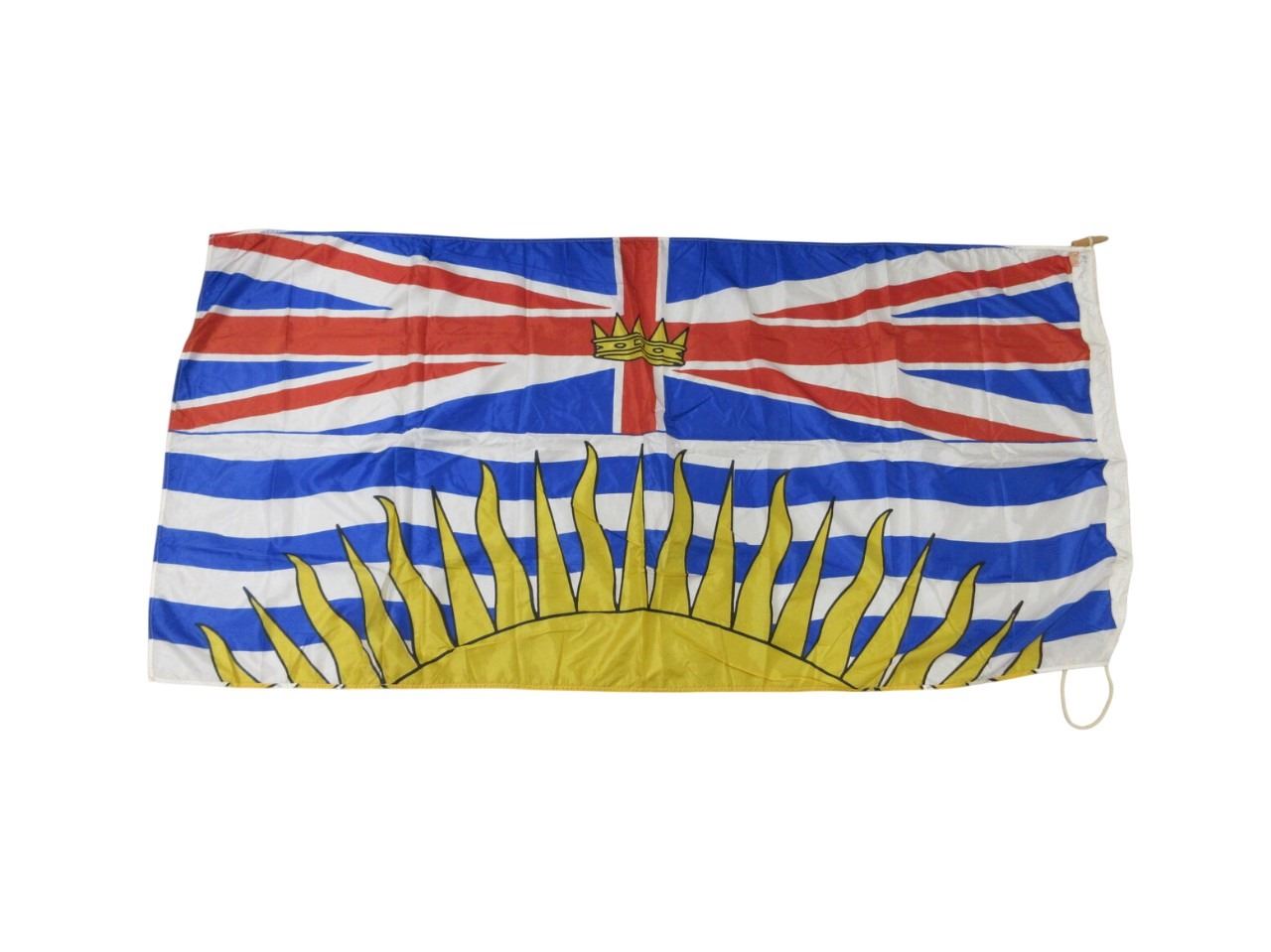 BRITISH COLUMBIA PROVINCIAL FLAG. (1) WHITE NYLON FLAG WITH UNION JACK & SETTING SUN ACROSS WATER EMBLEM, APPROX. 72" X 36". SEE PHOTOS.