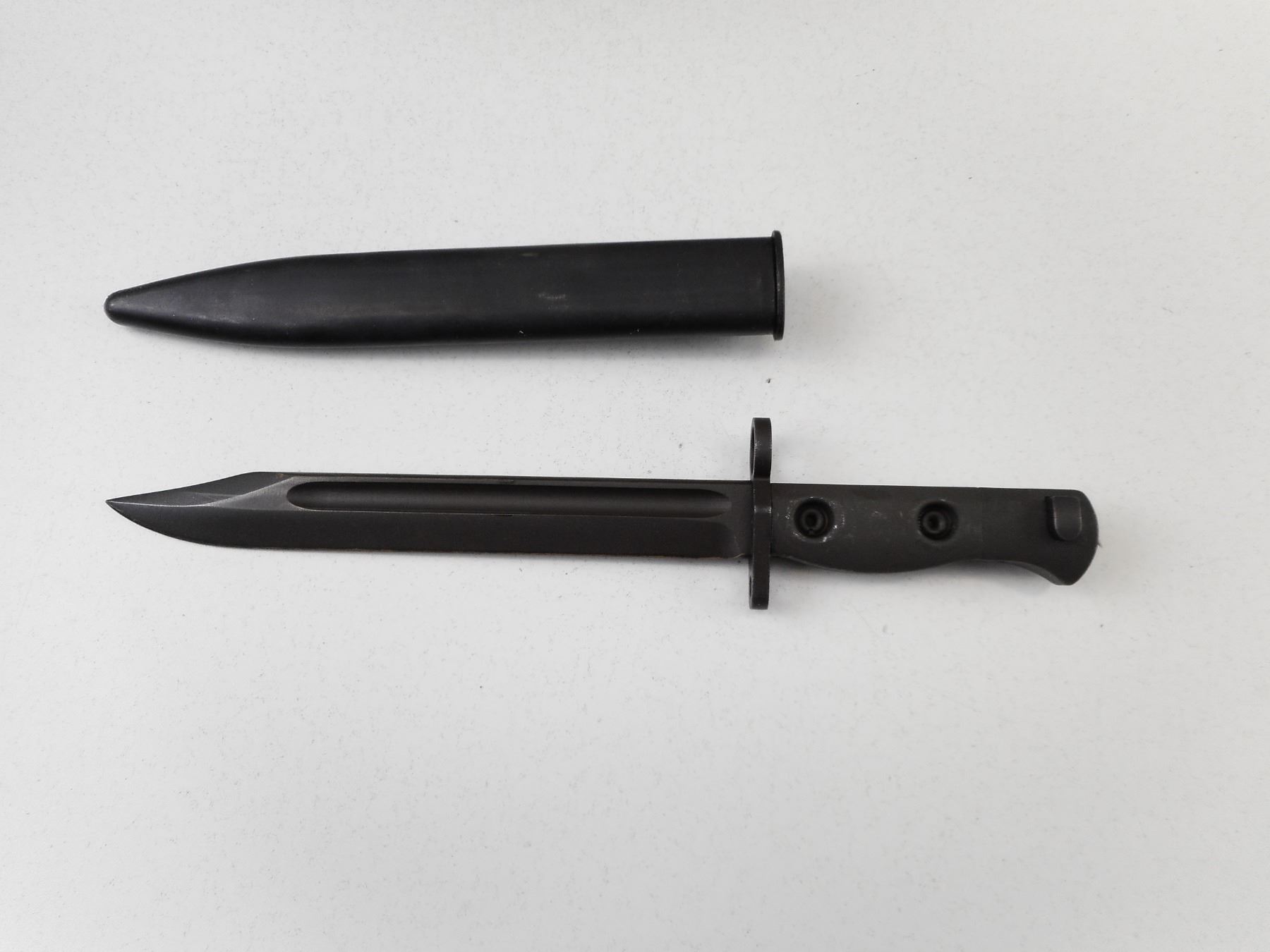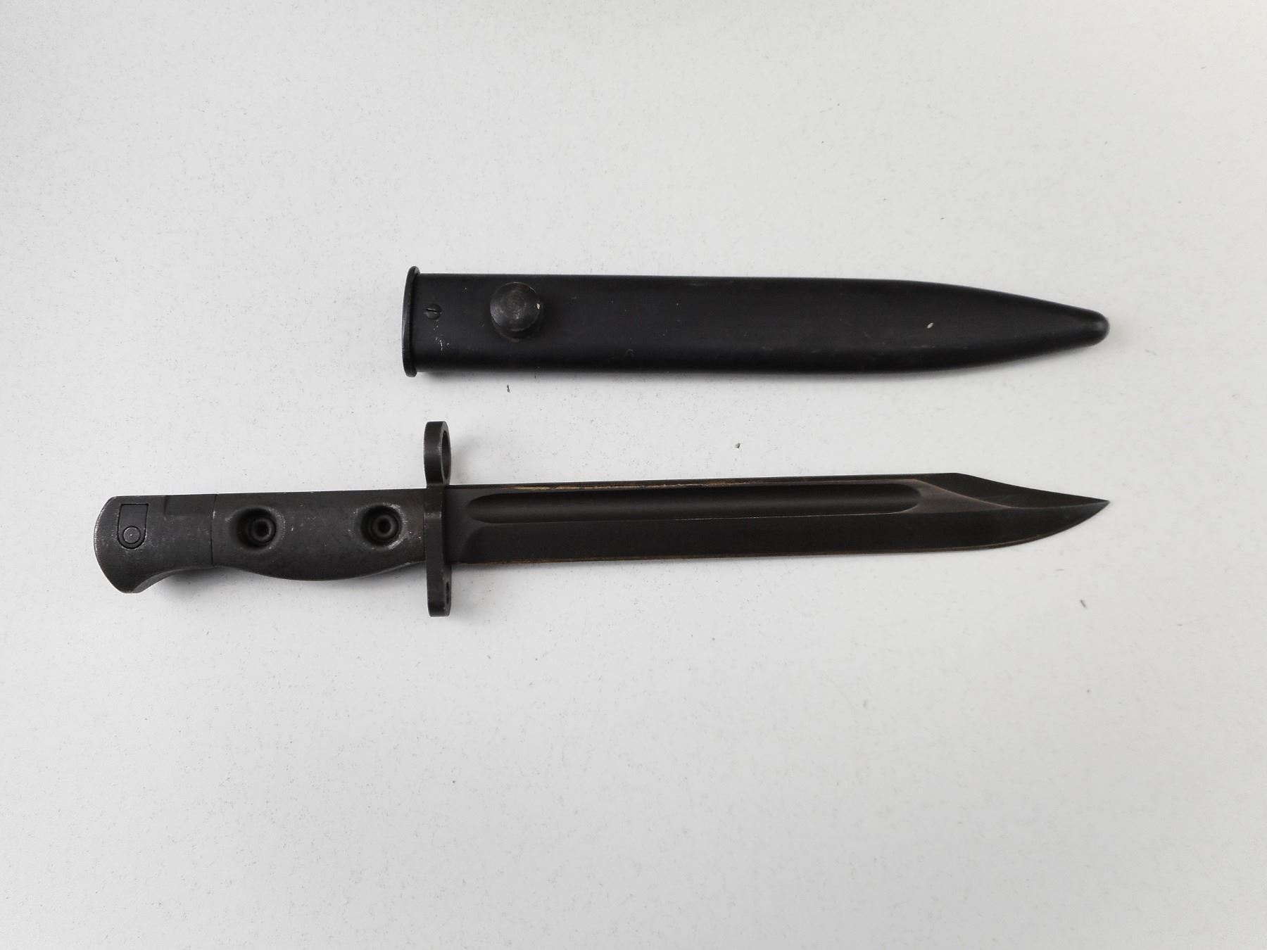 BRITISH FN L1A1 RIFLE BAYONET WITH SCABBARD , UNMARKED, BLACKENED BLADE. LENGTH OF BLADE APPROX. 8" TOTAL LENGTH APPROX. 12". STEEL SCABBARD HAS NO VISIBLE MARKINGS.