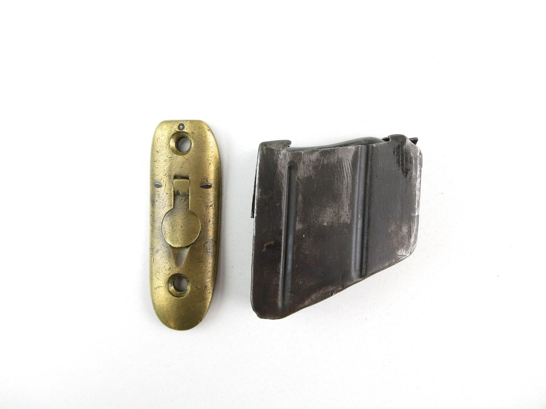LOT INCLUDES; (1) RIFLE MAGAZINE, .303 BR, 10 ROUND MAG, BLUED STEEL CONSTRUCTION, MARKED WITH BROAD ARROW, (1) BRASS BUTT PLATE, WITH TRAP, APPEARS UNMARKED. SEE PHOTOS. PAL REQUIRED.
