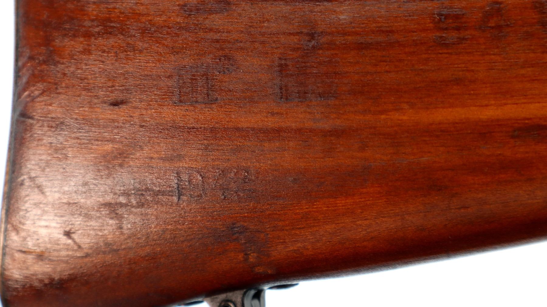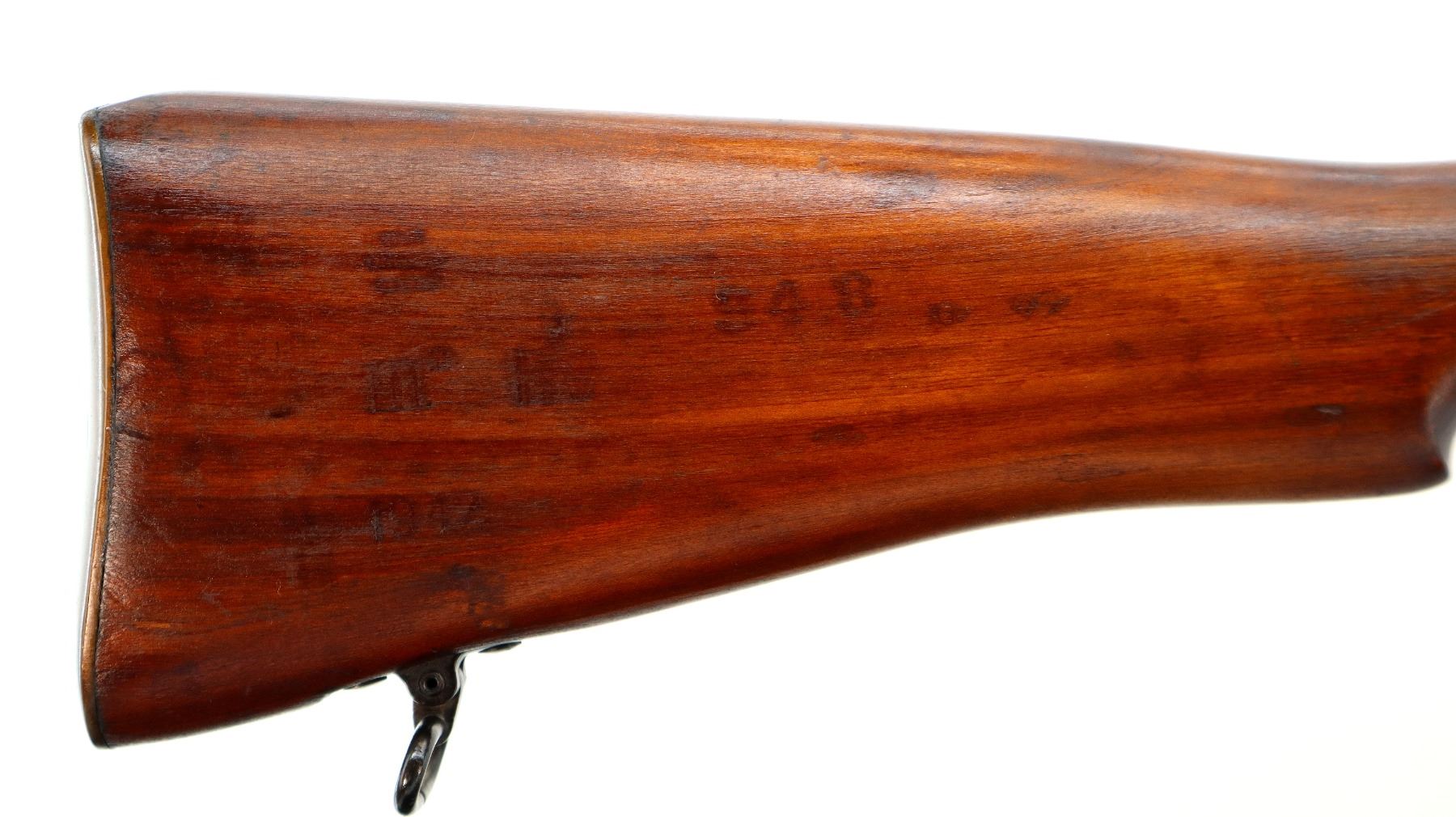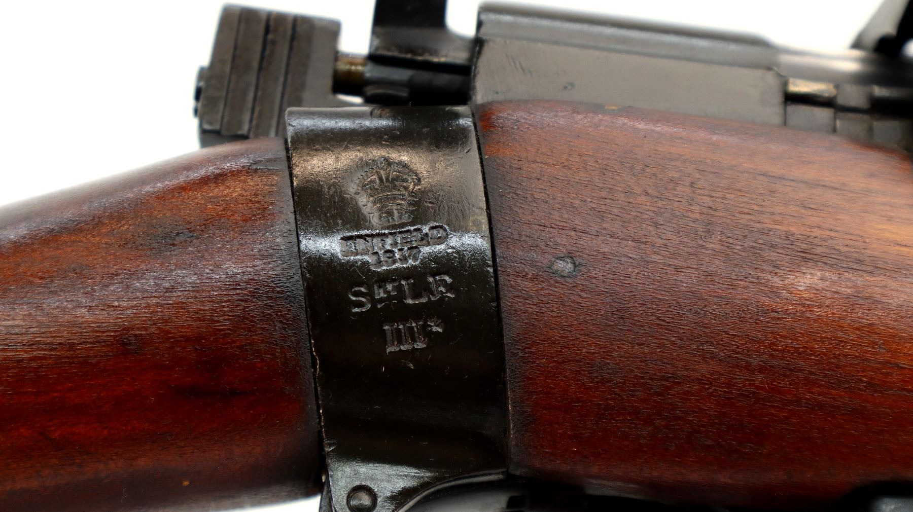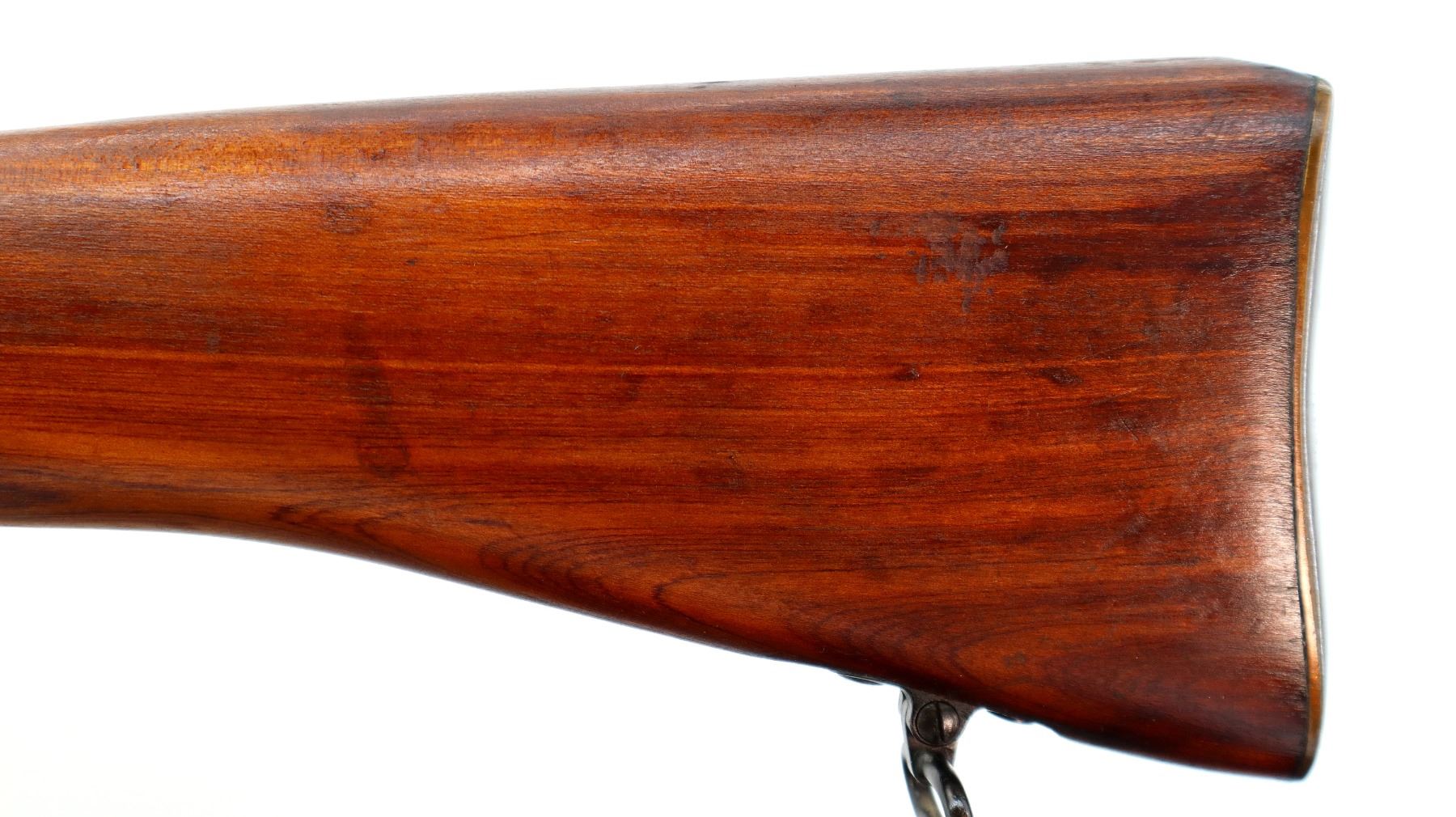 Main Description: Manufactured by Enfield 1917, bolt numbered to match. Blade front sight with ramp, adjustable u notched rear sight, blued finish. Two piece sporterized wood stocks, pistol grip, smooth brass butt plate with trap, rear sling swivel front stud.