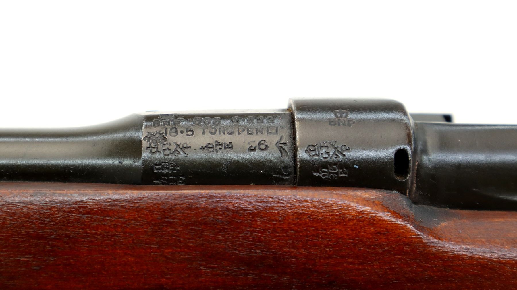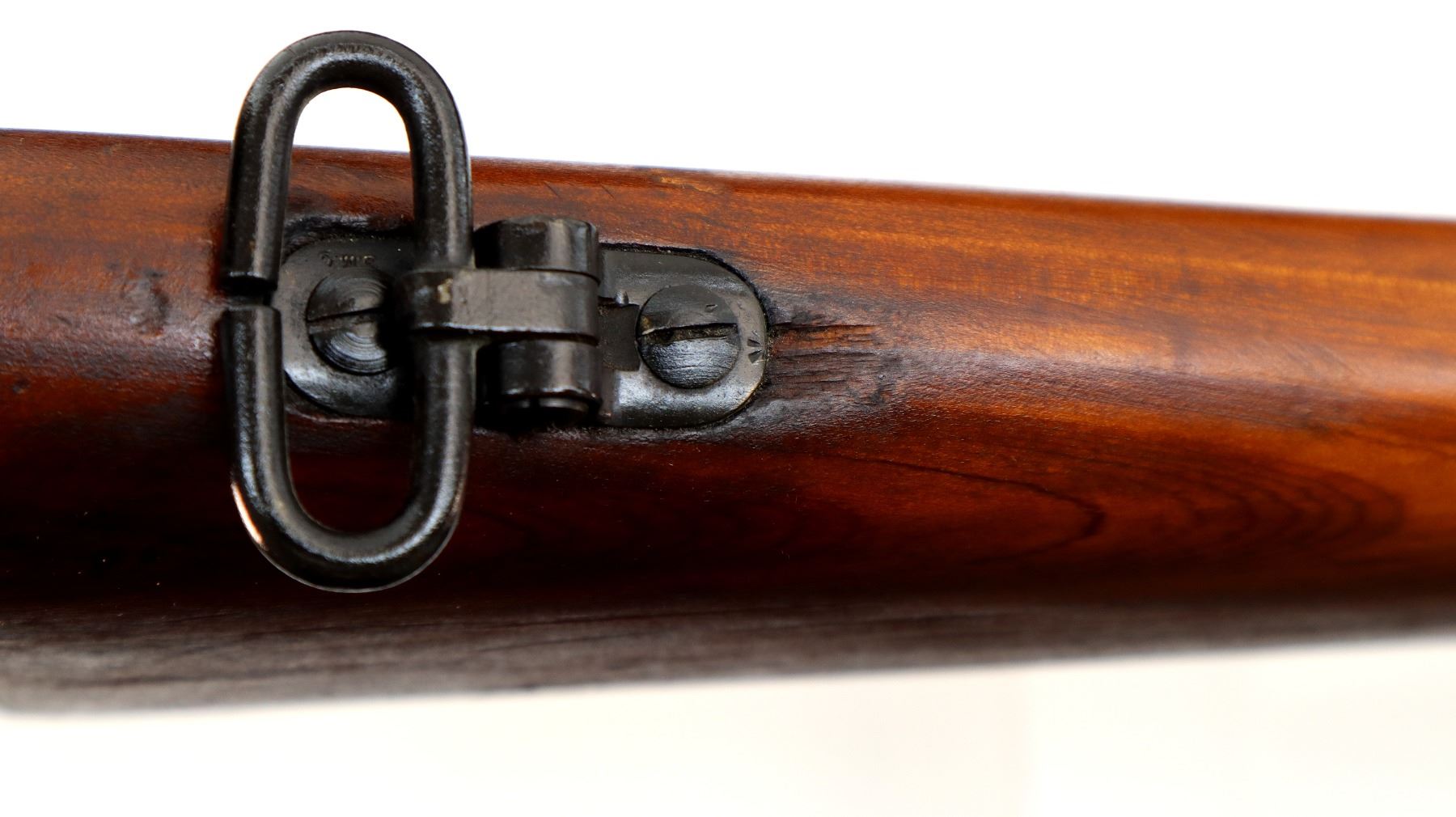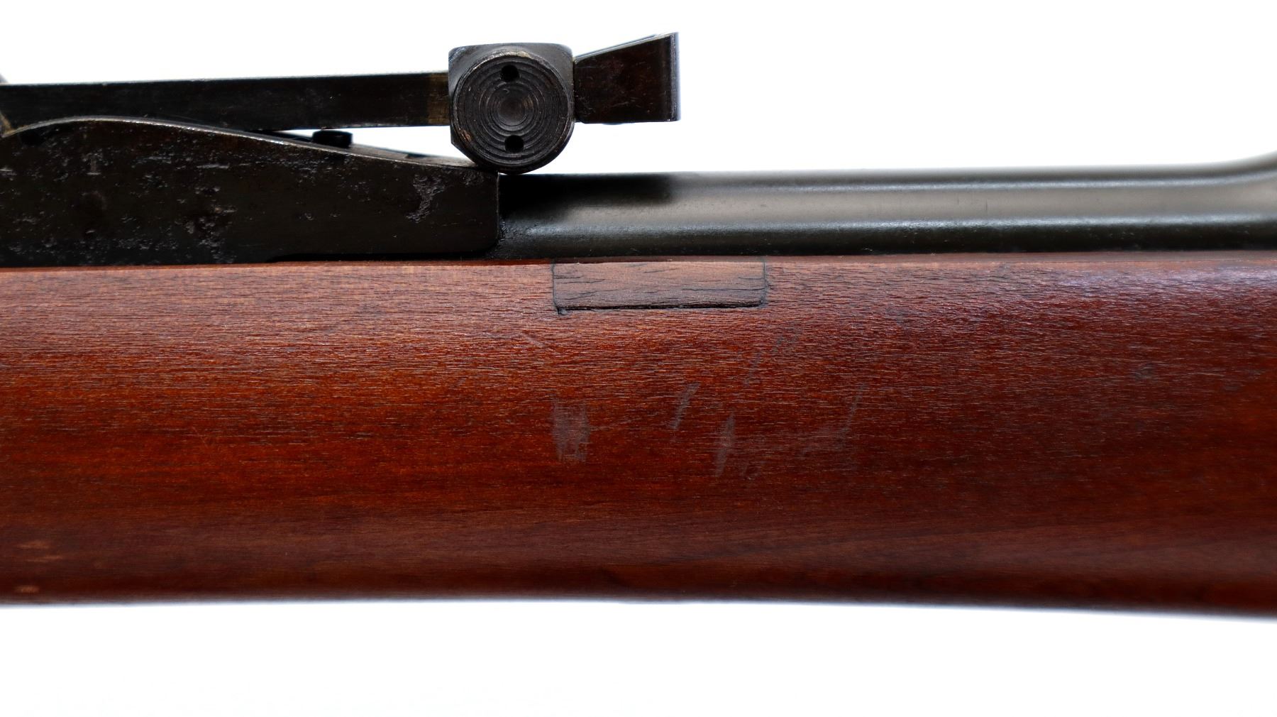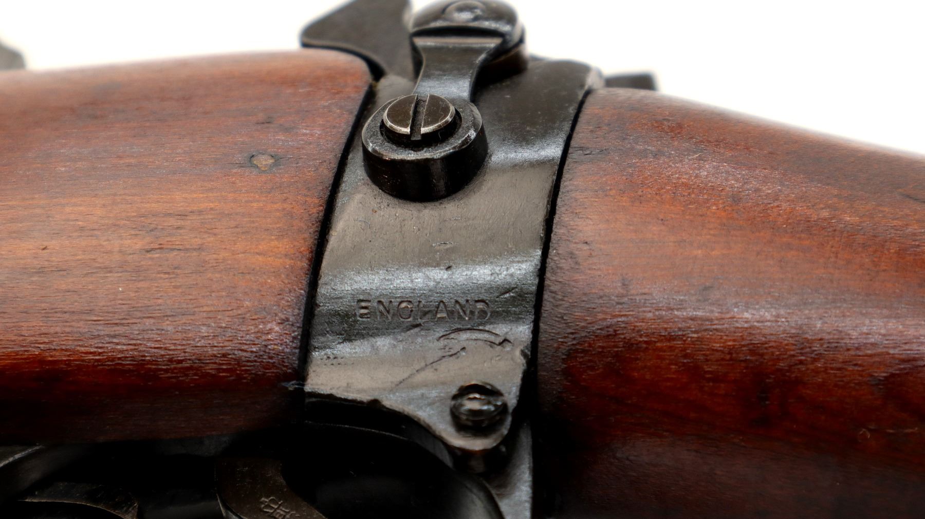 Main Description: Manufactured by Enfield 1917, bolt numbered to match. Blade front sight with ramp, adjustable u notched rear sight, blued finish. Two piece sporterized wood stocks, pistol grip, smooth brass butt plate with trap, rear sling swivel front stud.