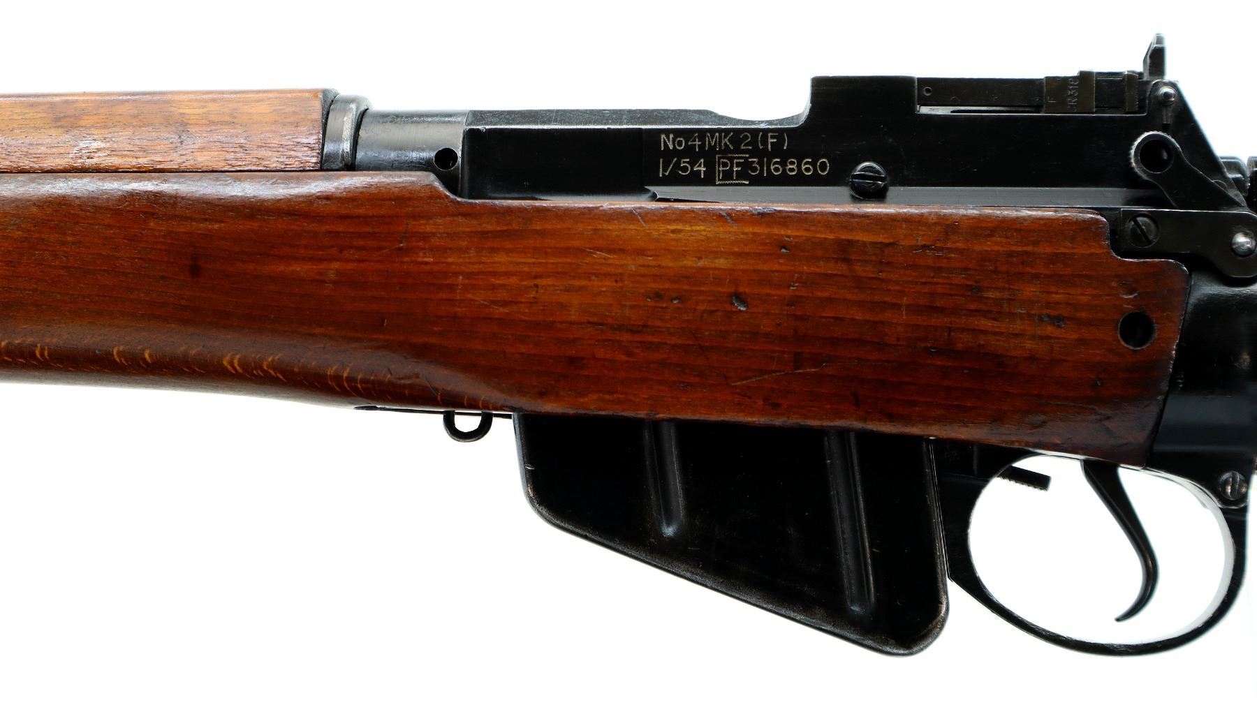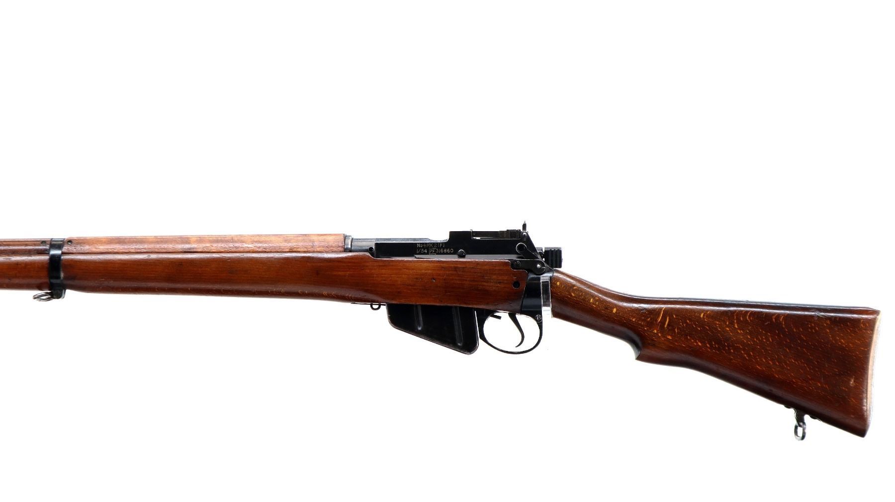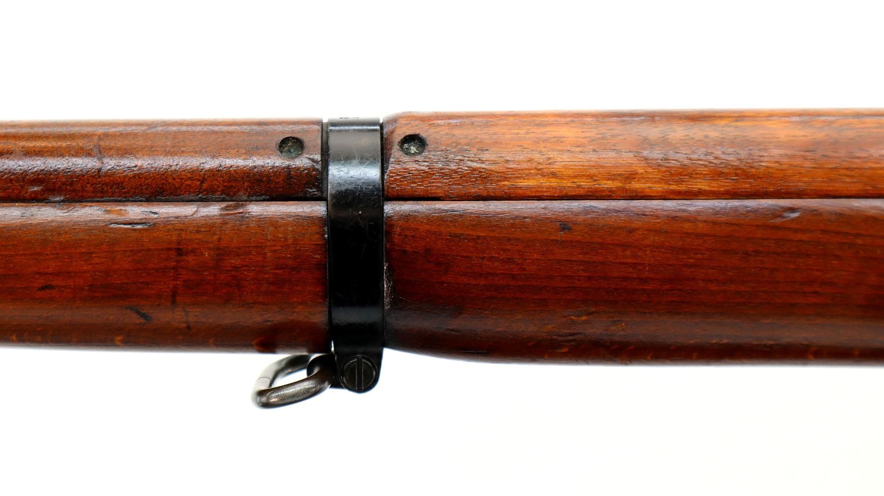 Main Description: Manufactured by Fazakerley 1/54, visible numbers match. Blade front sight with ears and ramp, adjustable milled rear peep sight, black painted metal finish. Four piece full military wood stocks, pistol grip, smooth brass butt plate with trap, sling swivels, bayonet lug.