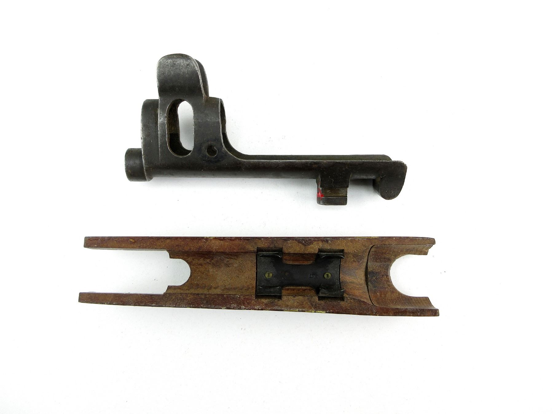 LOT INCLUDES; (1) NOSE CAP, BLUED STEEL CONSTRUCTION, MARKED: "Z, 4554C", WITH OTHER FAINT / UNCLEAR MARKINGS, (1) REAR HANDGUARD, WITH METAL CLIP, CLIP MARKED: "B", OAL APPROX. 6.5". MAY REQUIRE FITTING. SEE PHOTOS.