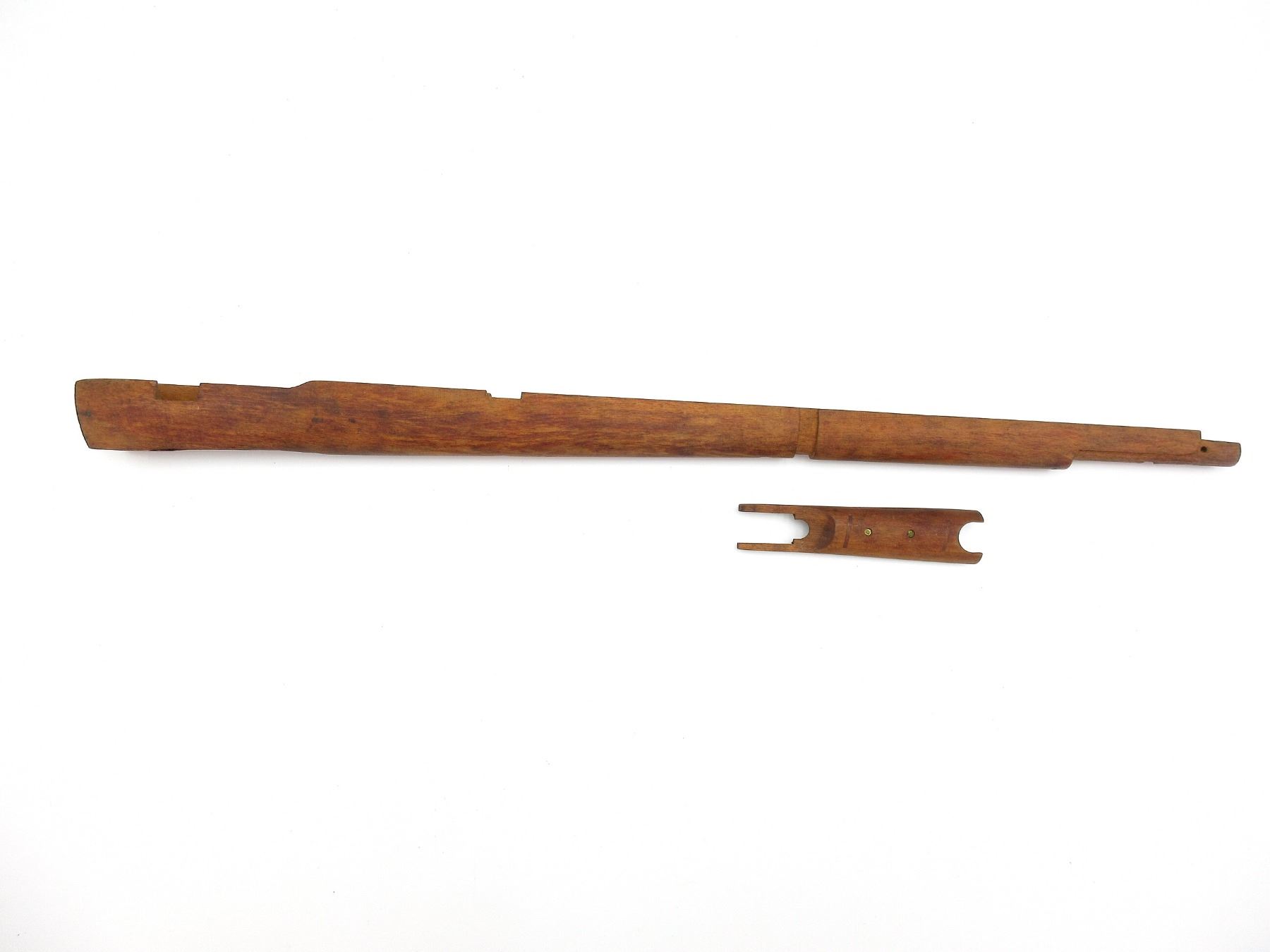 LOT INCLUDES; (1) FOREND, WOOD CONSTRUCTION, MARKED WITH BROAD ARROW, CRACKED AT BACK, OAL APPROX. 30.75", (1) REAR HANDGUARD, WOOD CONSTRUCTION, UNMARKED, WITH METAL CLIP, OAL APPROX. 6.5". MAY REQUIRE FITTING. SEE PHOTOS.