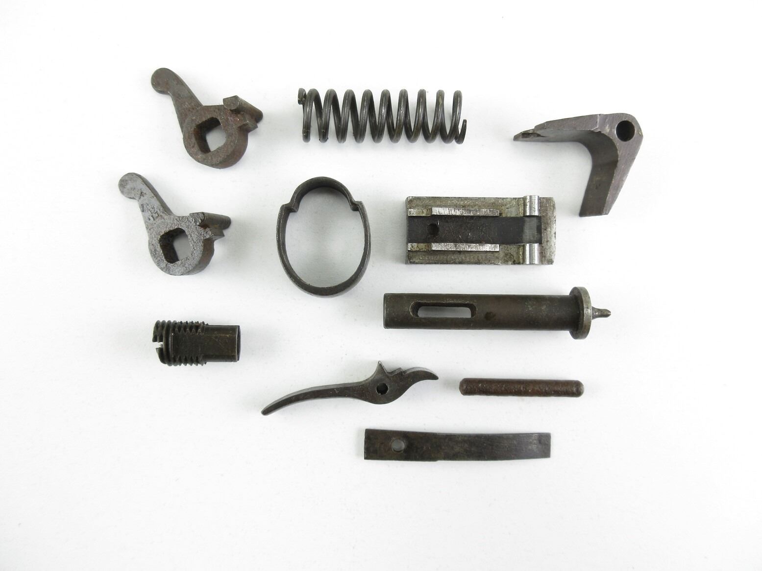 BRITISH MARTINI CADET RIFLE PARTS LOT. FITS .22 LR, VARIOUS MODELS / STYLES OF MARTINI RIFLES, LOT INCLUDES; (1) FIRING PIN, (2) SEARS, (1) REAR SIGHT BASE, (1) EXTRACTOR, (1) TRIGGER, (1) BARREL BAND, WITH VARIOUS PINS & SPRINGS. SEE PHOTOS.