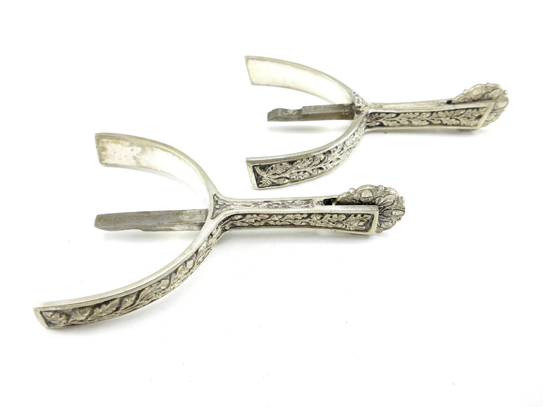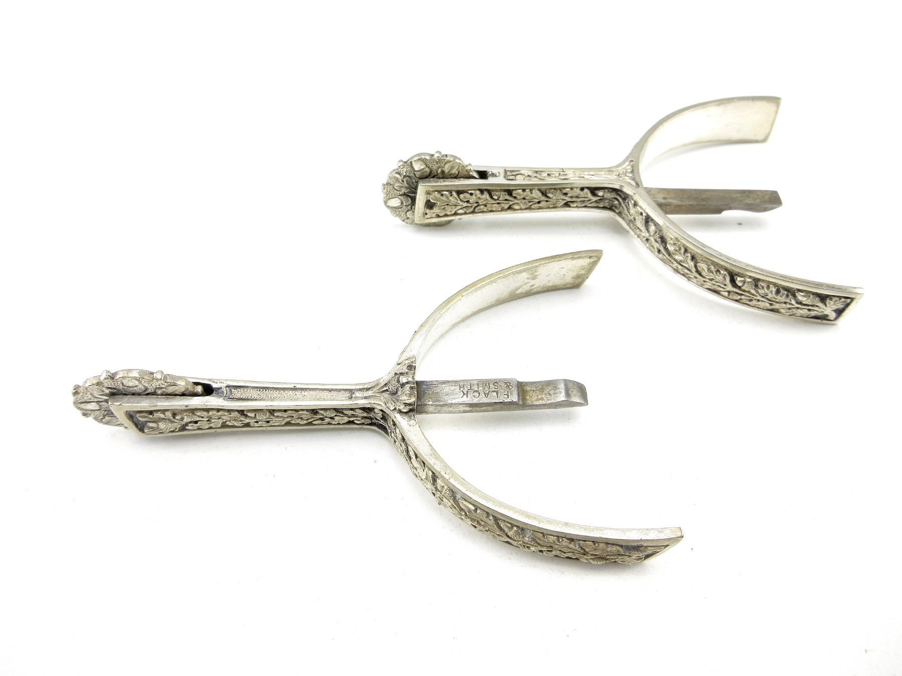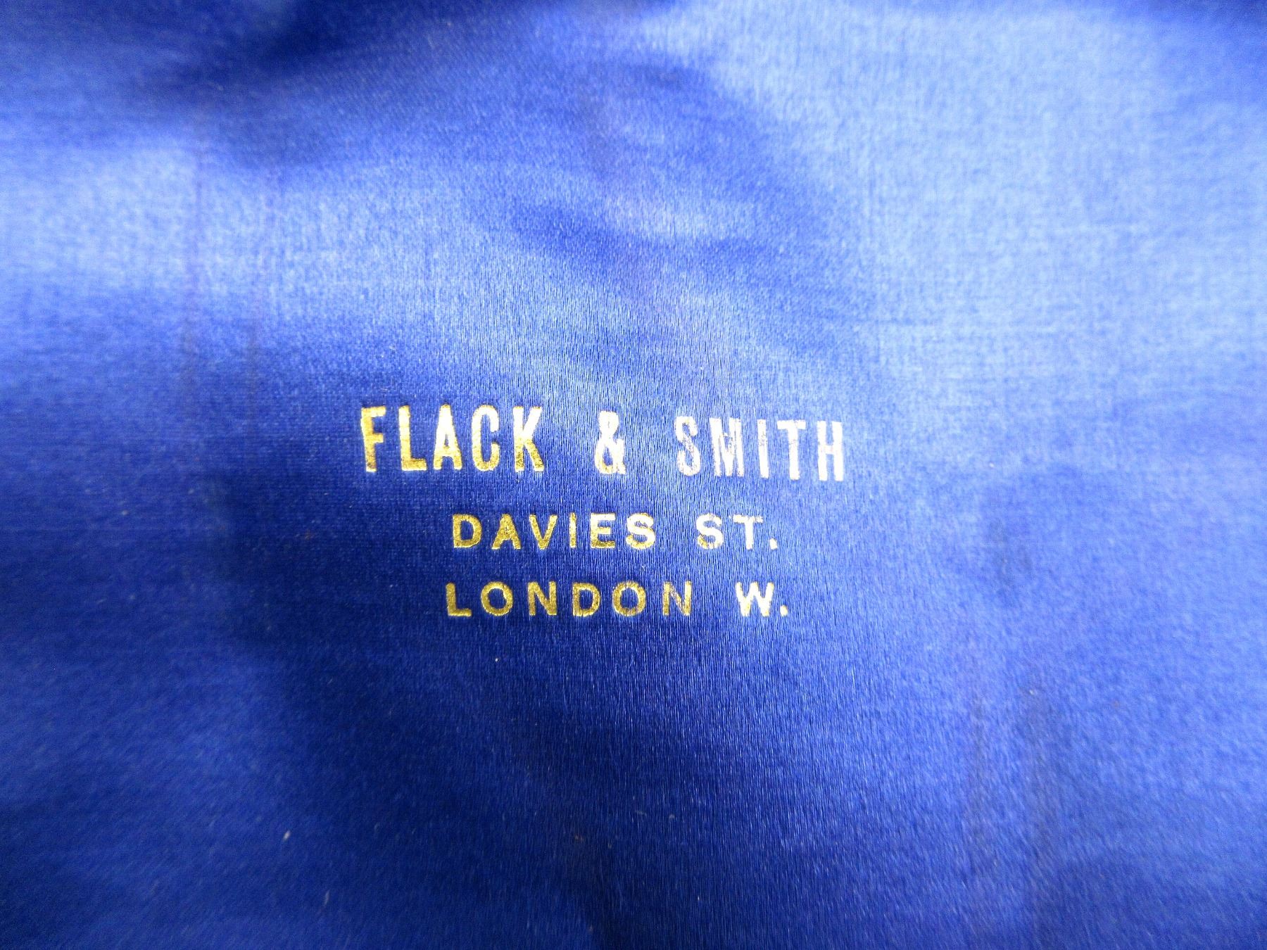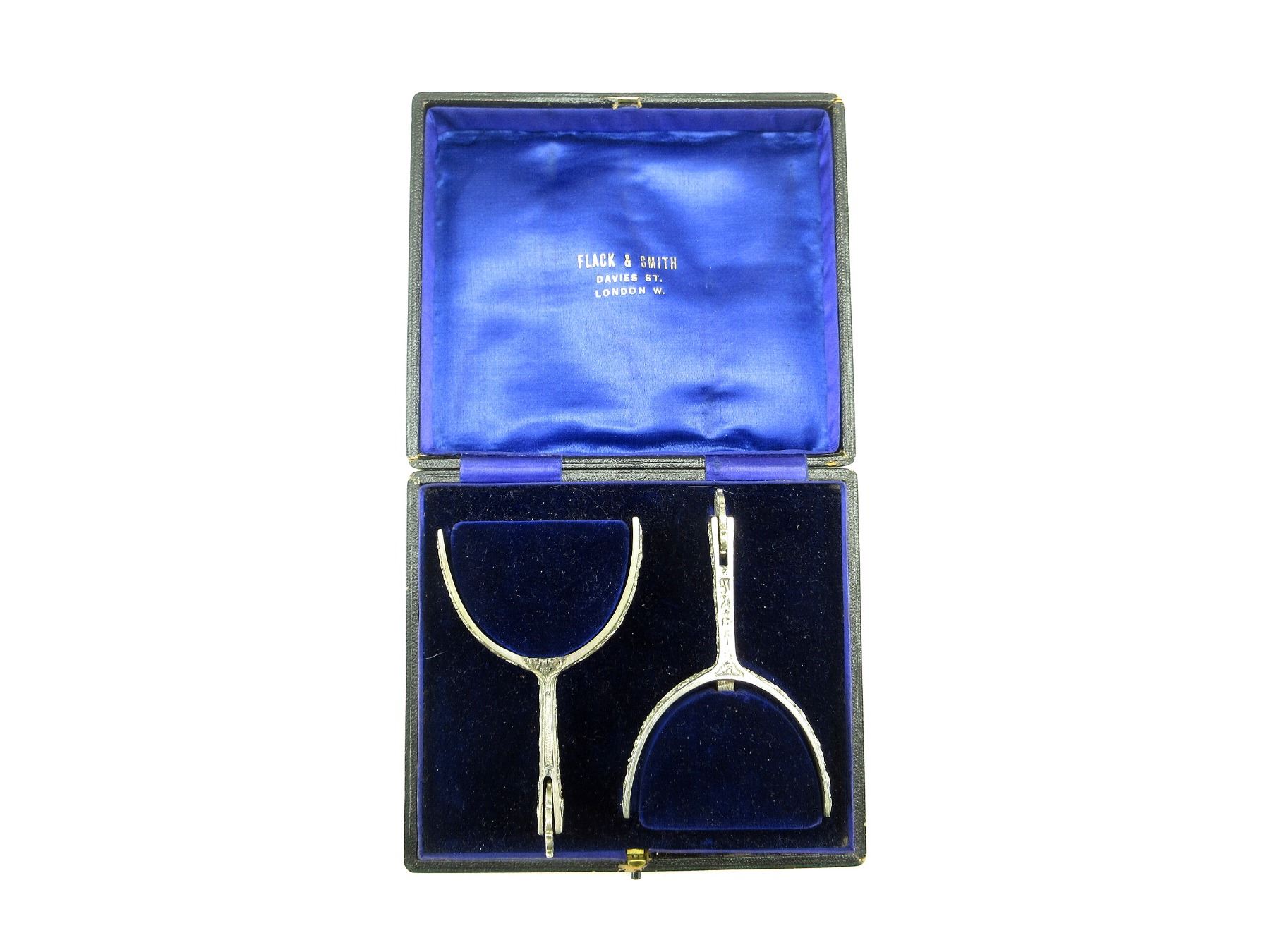 (1) SET OF METAL SPURS, CONSIGNOR STATES: "BRITISH / CANADIAN HIGH RANK OFFICER SPURS", SPURS MARKED: "FLACK & SMITH", DECORATIVE ACORN & OAKLEAF DESIGN, BLACK LEATHER WRAPPED CASE, WITH BLUE FELT / SATIN STYLE LINING, CASE MARKED: "FLACK & SMITH, DAVIES ST., LONDON W.", SPURS OAL APPROX. 4 3/8" & CASE APPROX. 6.25" X 5 3/8" X 1.25". SEE PHOTOS.