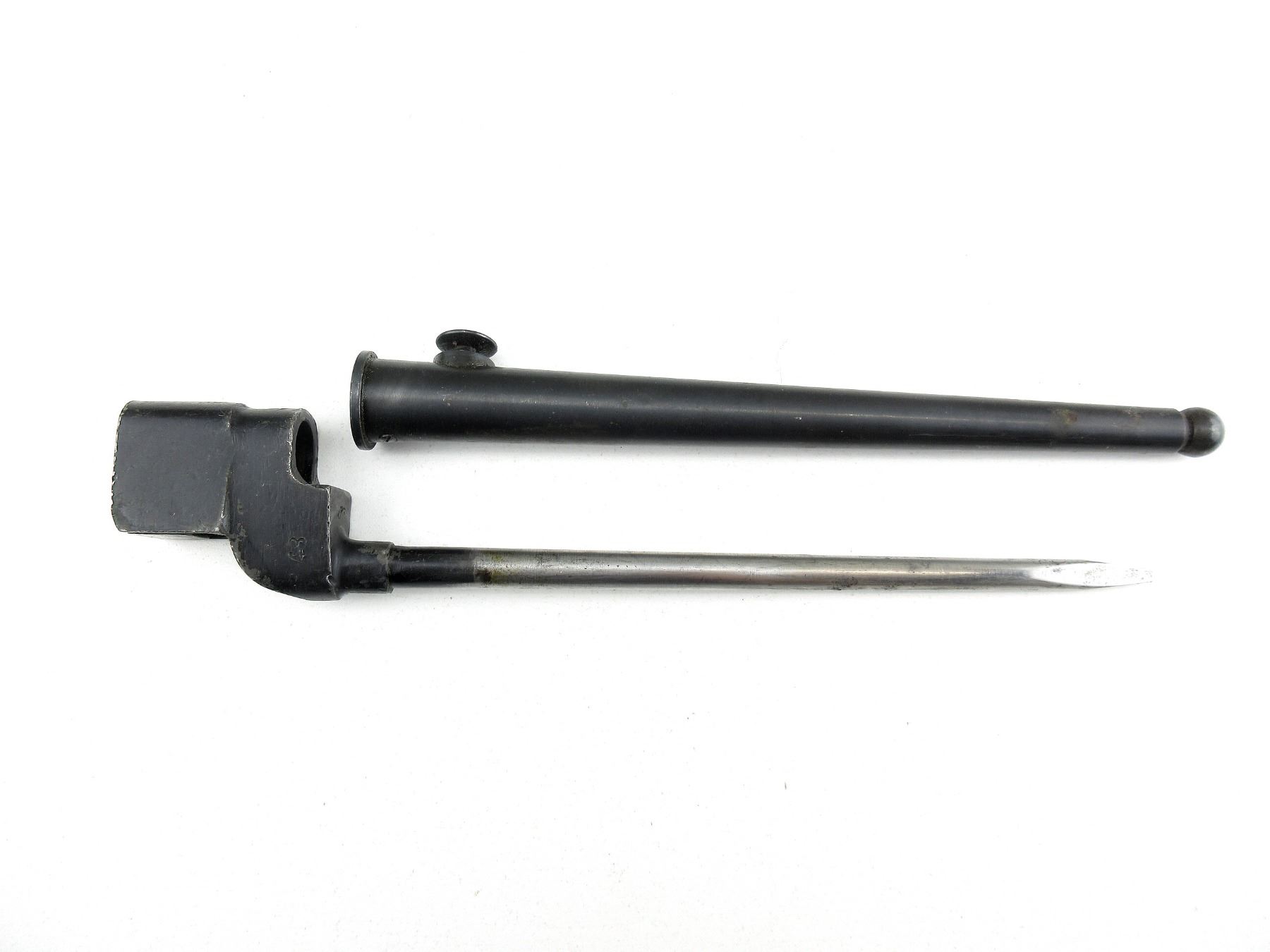 (1) FITS LEE ENFIELD NO.4 MKI & MKII SERIES RIFLES, SOCKET MARKED: "48", BROAD ARROWS, "D", METAL MK. I SCABBARD, THROAT MARKED: "NO. 4 MK1", BLADE APPROX. 7 7/8" & OAL APPROX. 9.75". SEE PHOTOS.