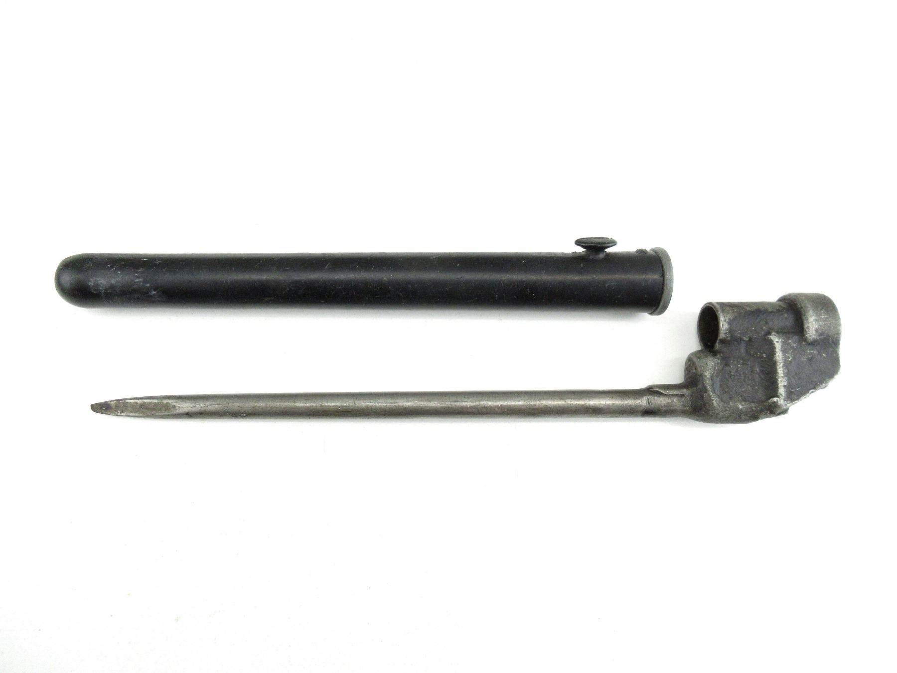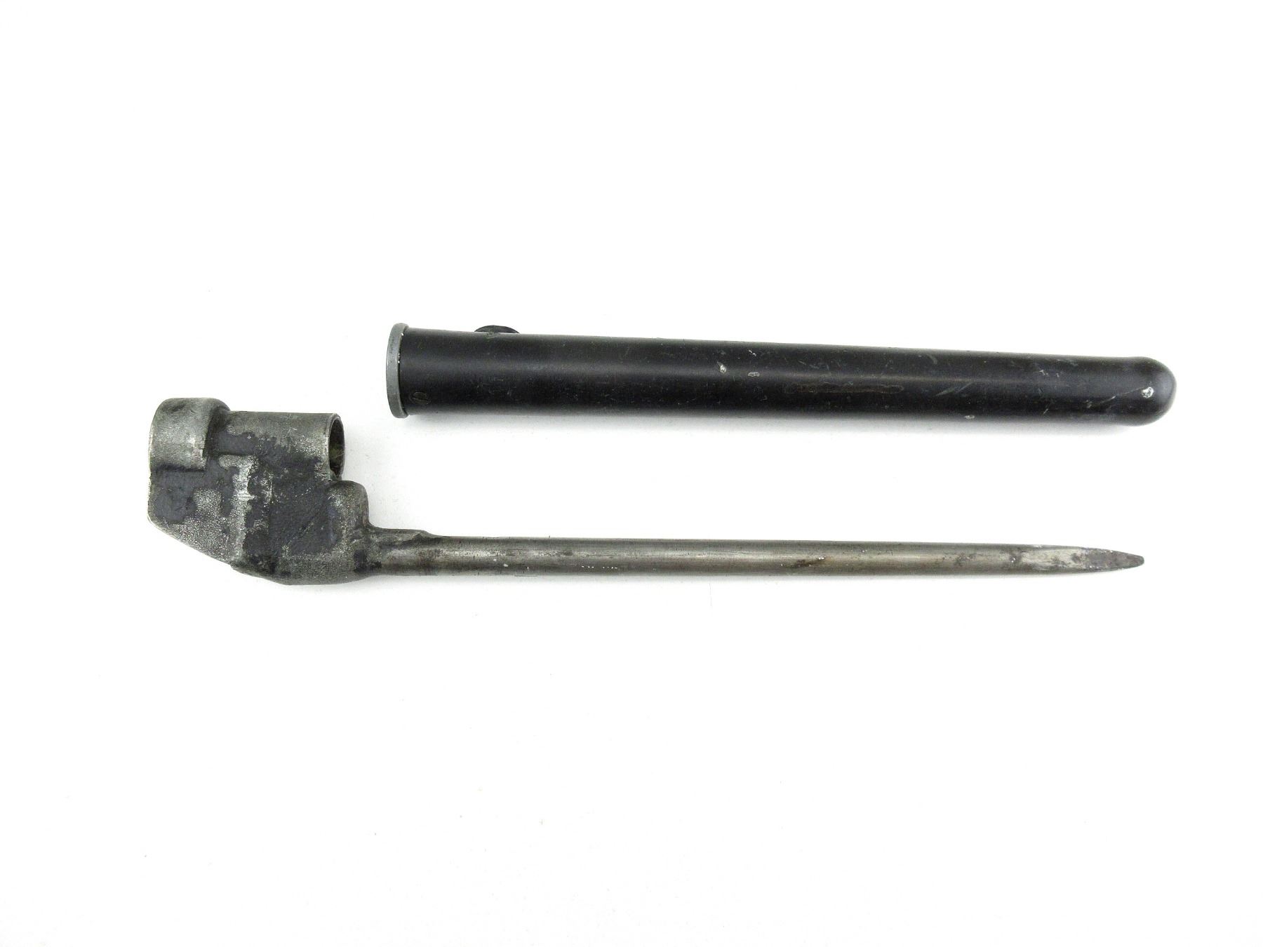 (1) FITS LEE ENFIELD NO.4 MKI & MKII SERIES RIFLES, SOCKET FAINTLY MARKED: "?/158" & BROAD ARROW, PLASTIC MKIII SCABBARD, NO VISIBLE MARKINGS, BLADE APPROX. 8" & OAL APPROX. 9 7/8". SEE PHOTOS.