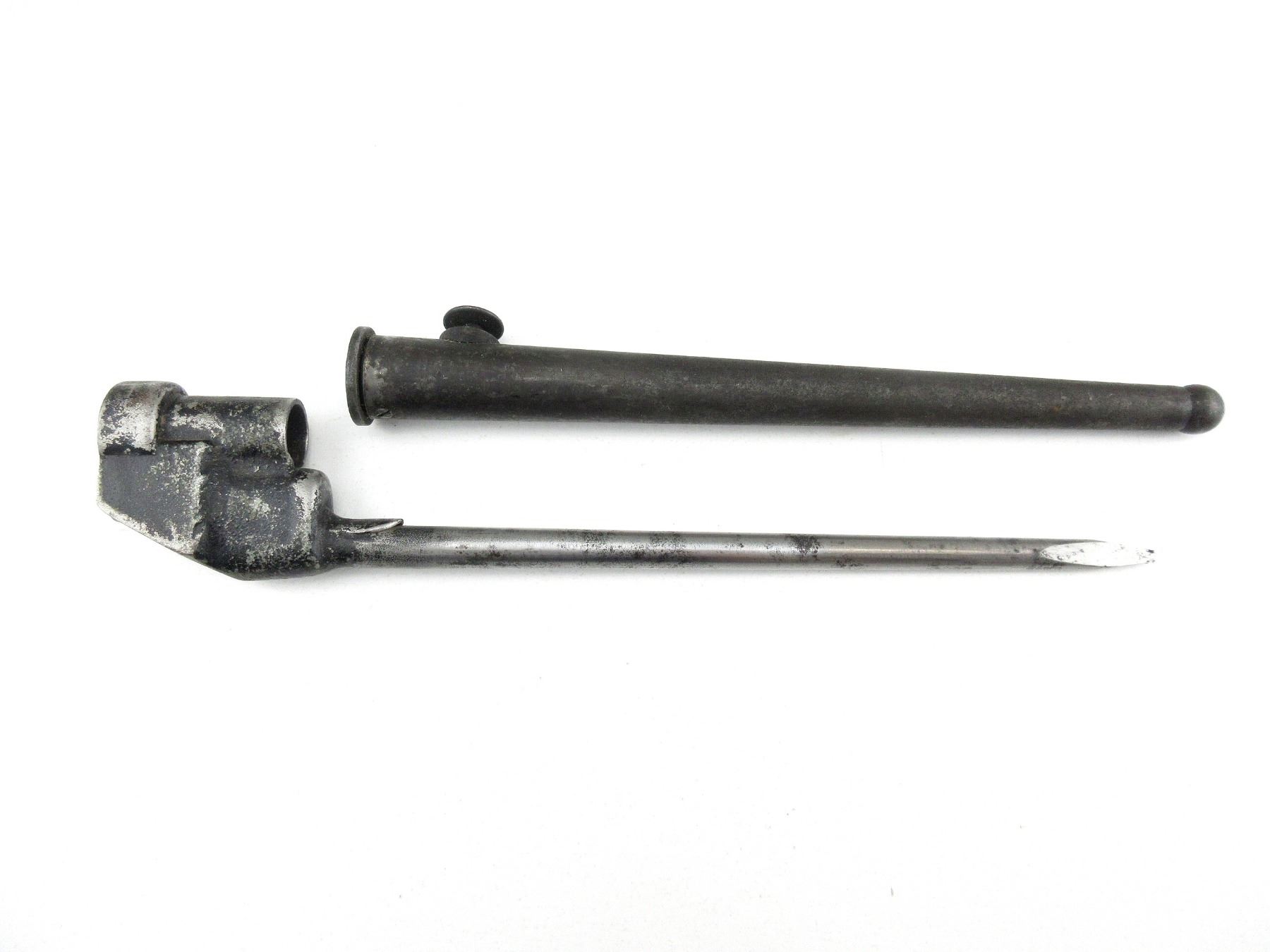 (1) FITS LEE ENFIELD NO.4 MKI & MKII SERIES RIFLES, SOCKET FAINTLY MARKED: "M/158" & BROAD ARROW, METAL MK. I SCABBARD, THROAT MARKED: "I" & BROAD ARROW, BLADE APPROX. 7 7/8" & OAL APPROX. 9.75". SEE PHOTOS.