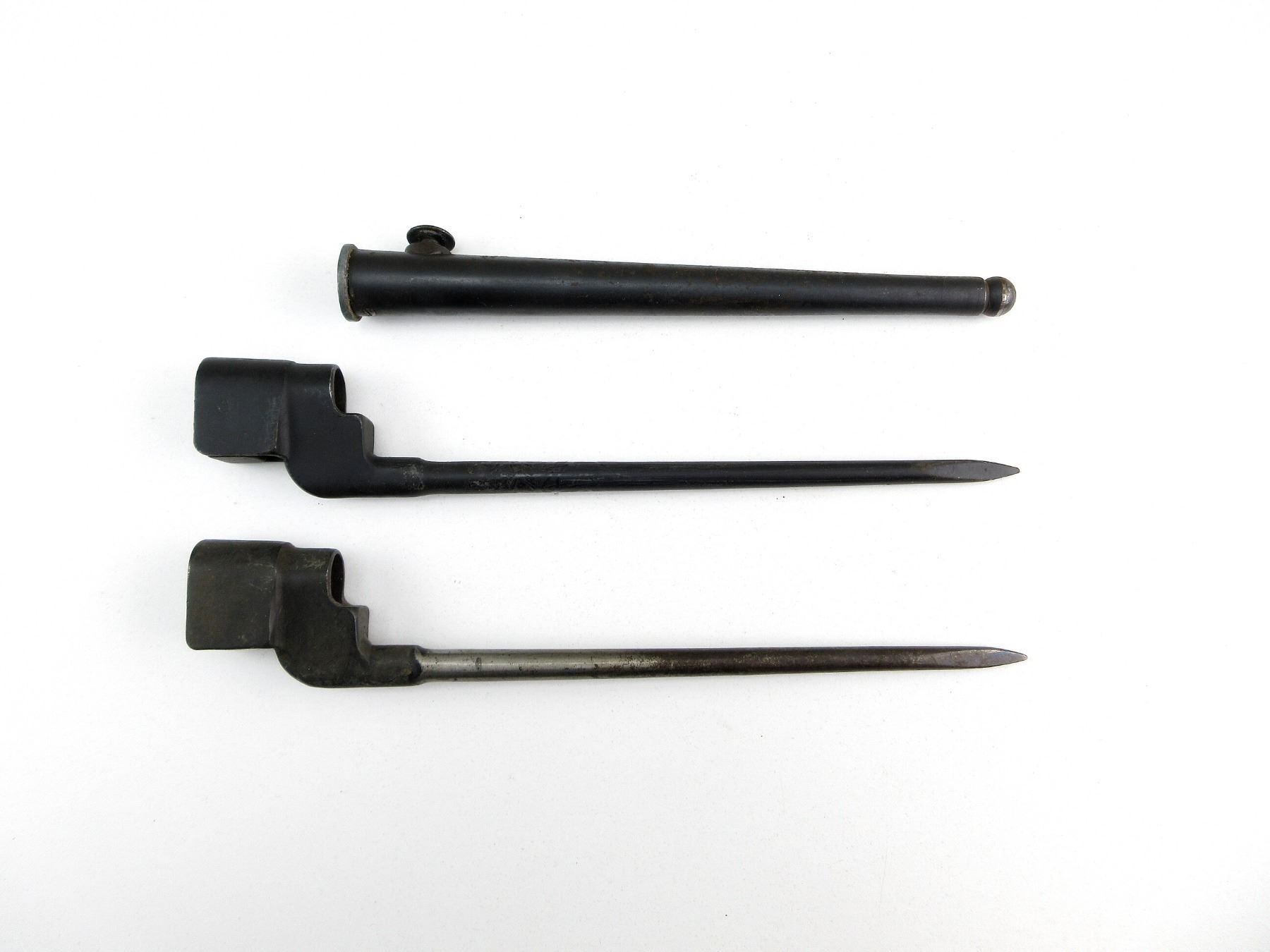 LOT INCLUDES; (1) NO.4 MKII SPIKE BAYONET, FITS LEE ENFIELD NO.4 MKI & MKII SERIES RIFLES, SOCKET FAINTLY MARKED: "NO4 MK II", "YC 306" & "N67", METAL MK. I SCABBARD, STUD MARKED: "792", BROAD ARROW & VARIOUS OTHER ETCHINGS, BLADE APPROX. 8 1/8", OAL APPROX. 10" & (1) NO.4 MKII SPIKE BAYONET, FITS LEE ENFIELD NO.4 MKI & MKII SERIES RIFLES, SOCKET FAINTLY MARKED: "NO? ?? ??" & "?67", NO SCABBARD, BLADE APPROX. 8 1/8" & OAL APPROX. 10". SEE PHOTOS.