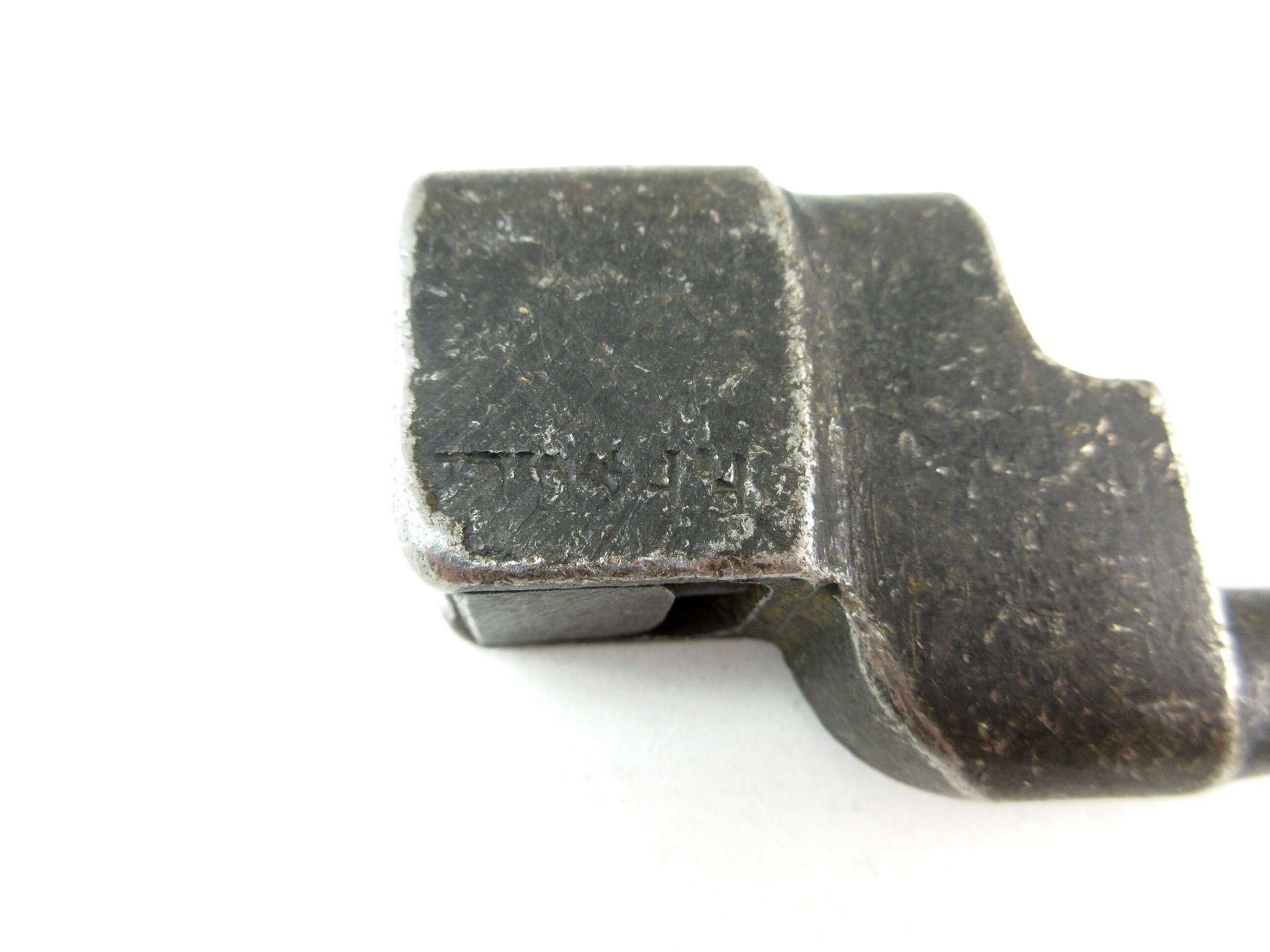 (1) FITS LEE ENFIELD NO.4 MKI & MKII SERIES RIFLES, SOCKET MARKED: "NO4 MK II*" OVER "P.S.K.", "F.F. & ?.?." & BROAD ARROW, METAL MK. I SCABBARD, STUD MARKED WITH EARLY VERSION C-BROAD ARROW, BLADE APPROX. 8" & OAL APPROX. 9 7/8". SEE PHOTOS.