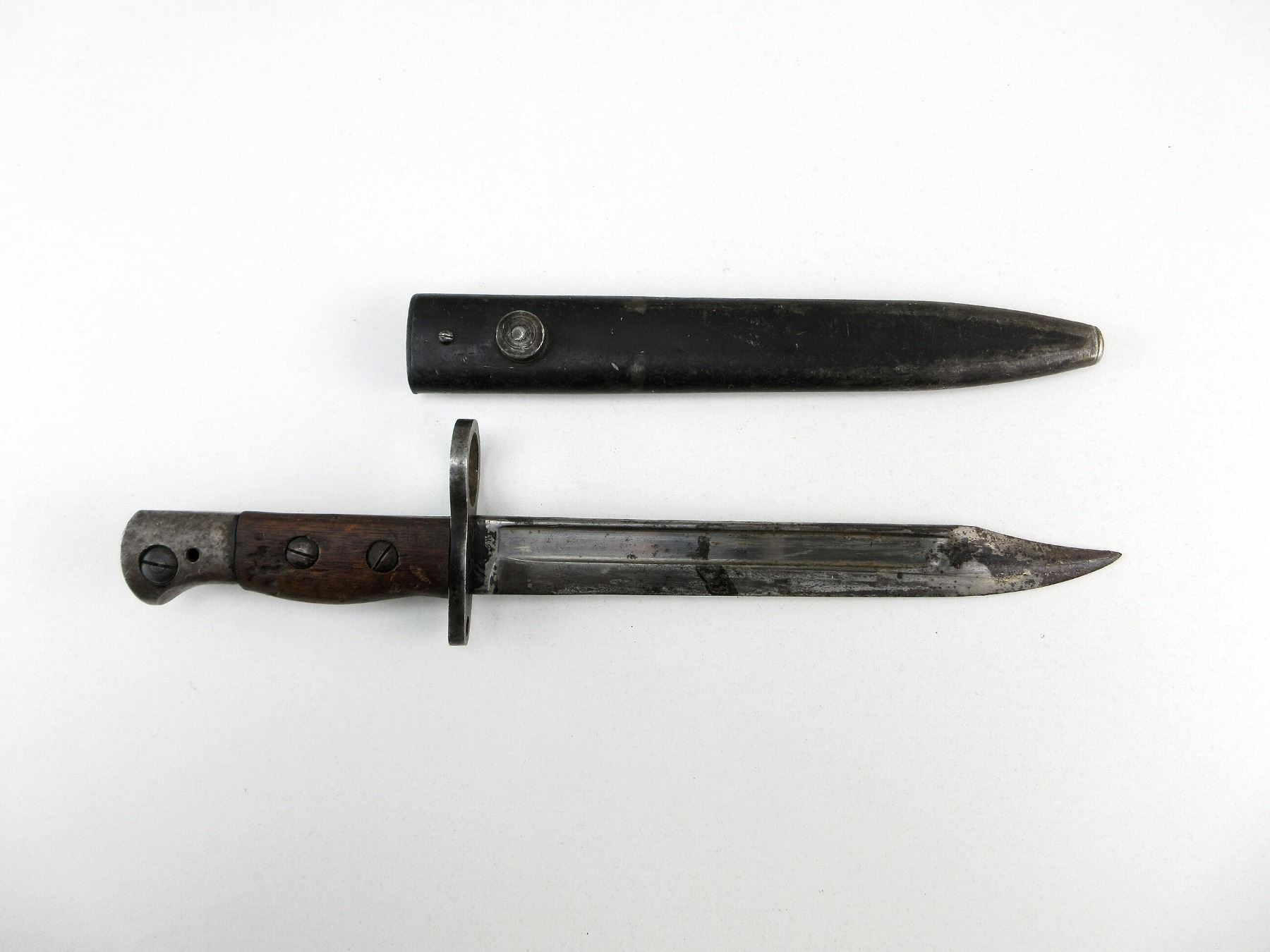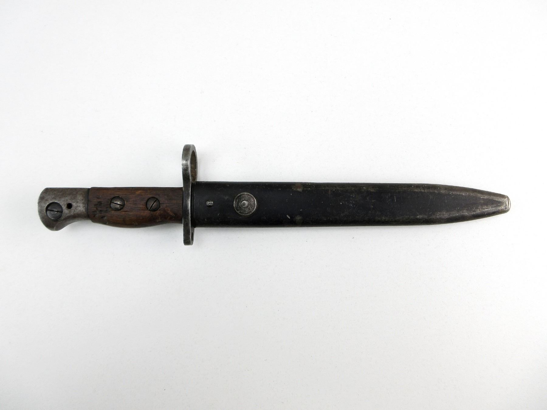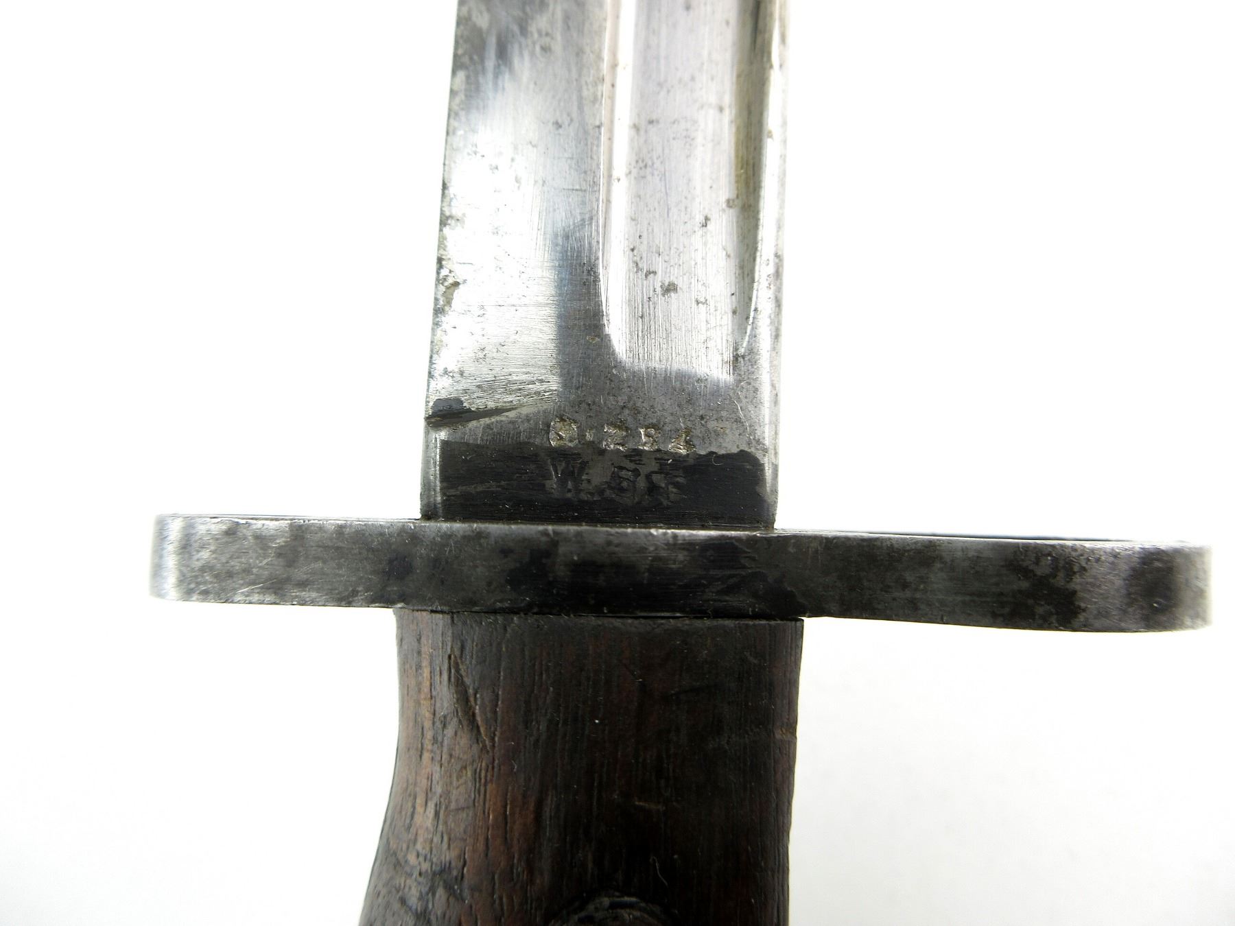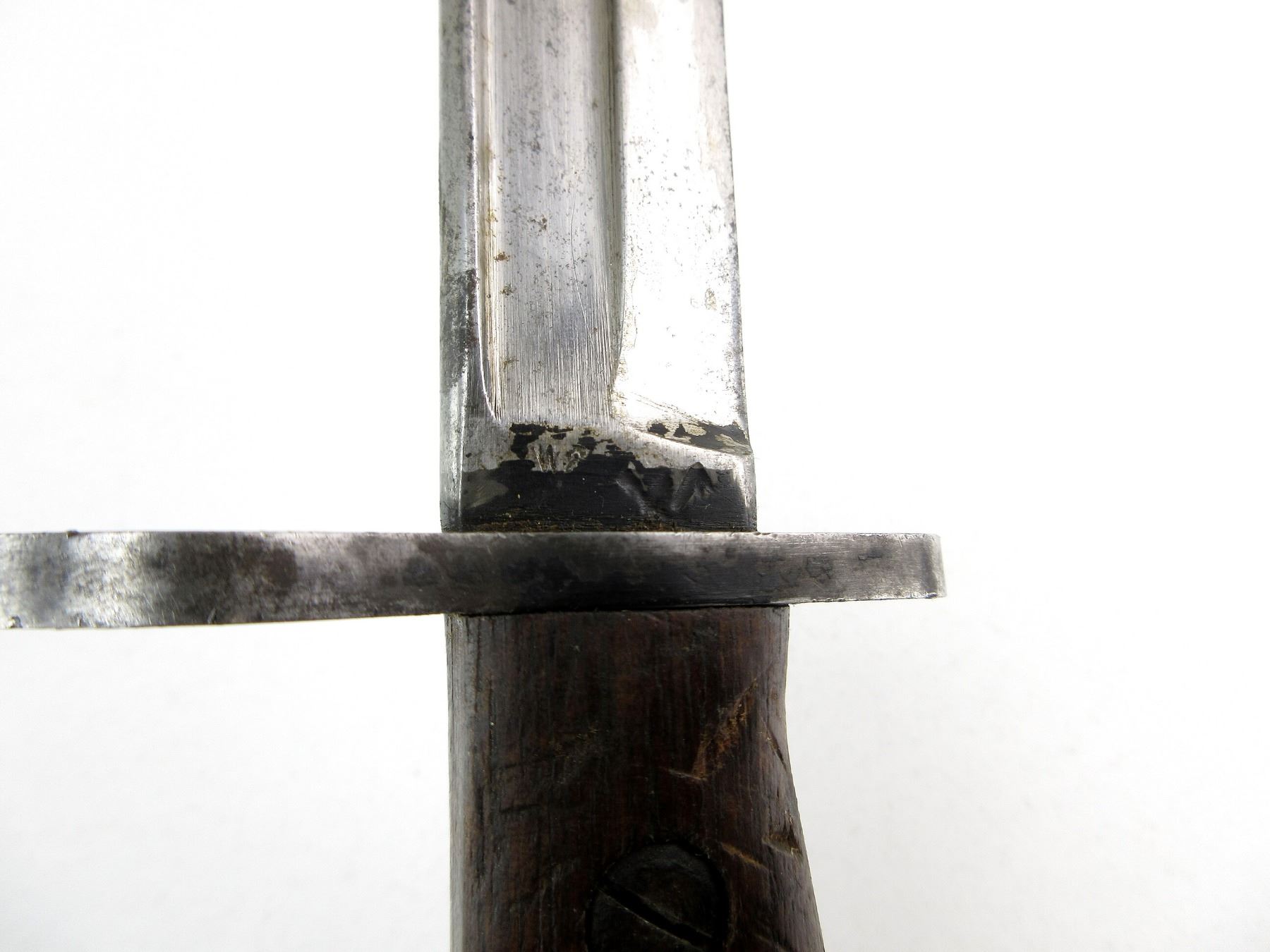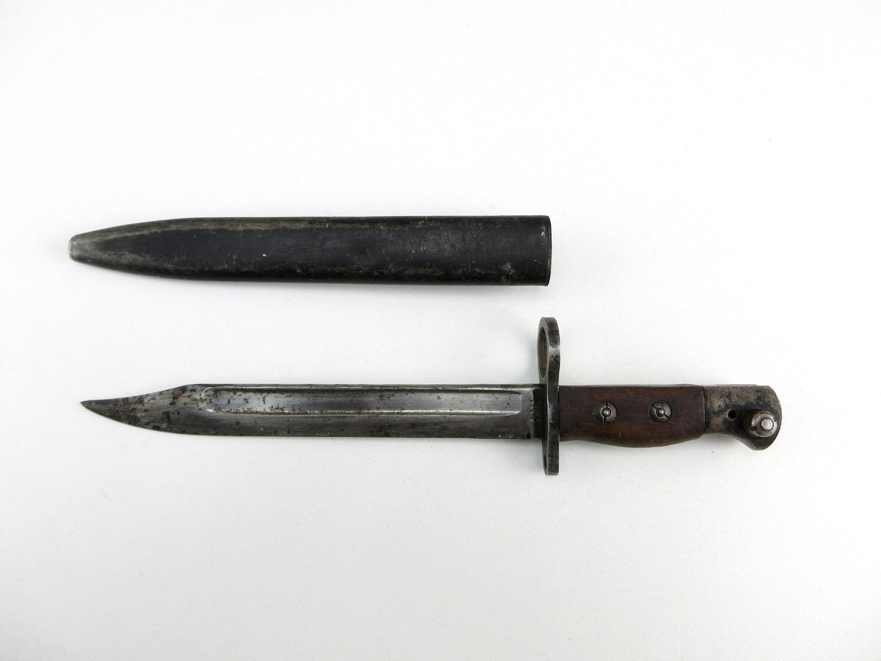 (1) FITS .303 BRITISH JUNGLE CARBINES, RICASSO MARKED: "W??" & VARIOUS FAINT / UN-CLEAR MARKINGS, OTHER-SIDE MARKED: "W?", "X (BEND TEST) & BROAD ARROW, 2-PIECE WOOD GRIP, METAL POMMEL, NO VISIBLE MARKINGS, BLACK PAINTED METAL SCABBARD, BROAD ARROW NEAR THROAT, BLADE APPROX. 8" & OAL APPROX. 11 7/8". SEE PHOTOS.