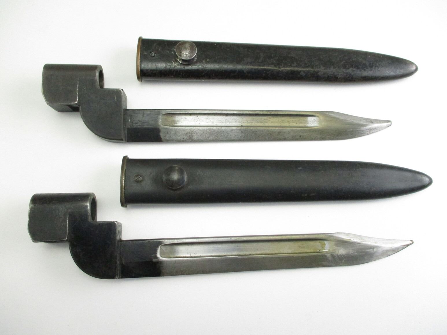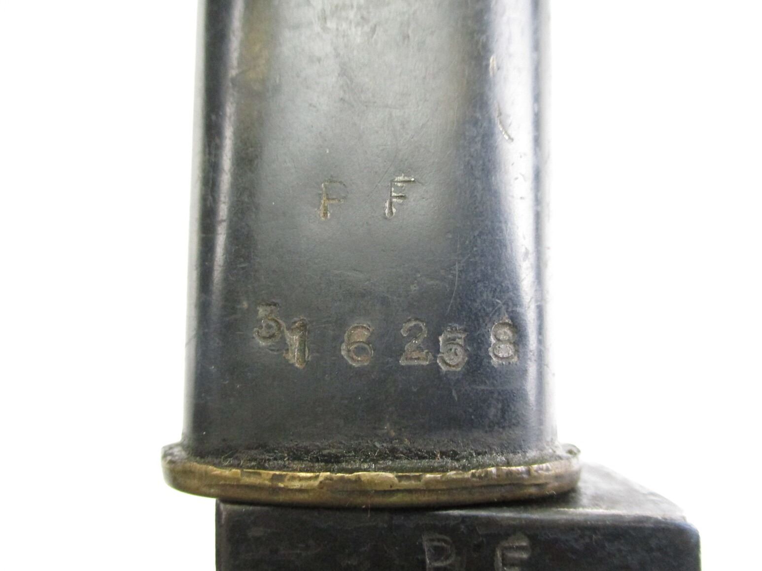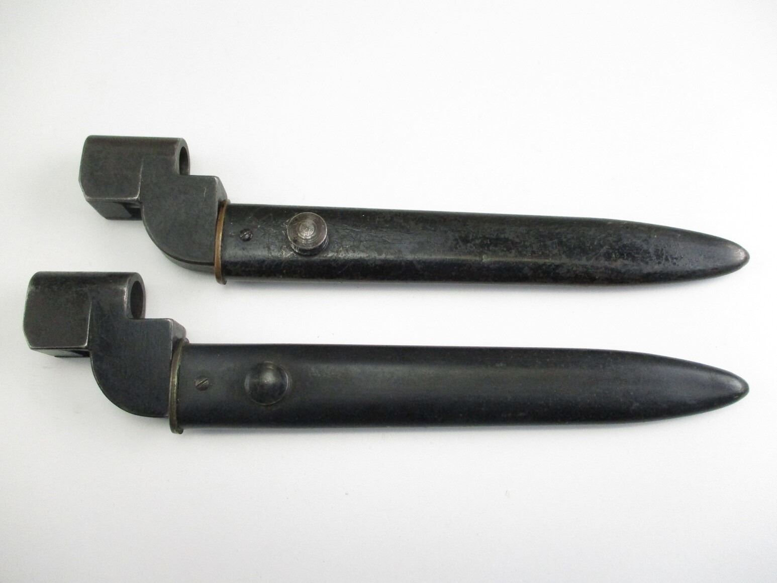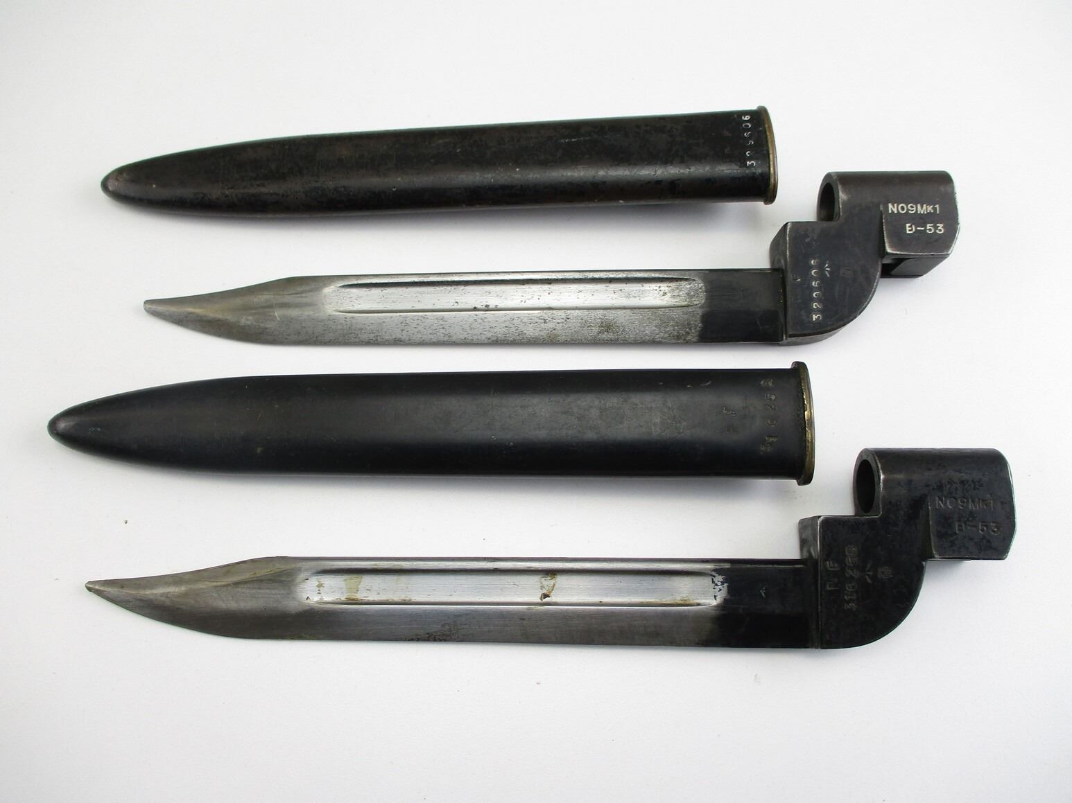 BRITISH NO.9 MKI BAYONET LOT. FITS .303 LEE ENFIELD NO.4 MKI SERIES RIFLES, LOT INCLUDES; (1) SOCKET MARKED: "NO9 MKI" OVER "DE-53", "P. F., 329606" & BROAD ARROW, METAL SCABBARD WITH MATCHING NUMBERS, MARKED: "P. F., 329606" & (1) SOCKET MARKED: "NO9 MKI" OVER "DE-53", "P. F., 316258" & BROAD ARROW, METAL SCABBARD WITH MATCHING NUMBERS, MARKED: "P. F., 316258". EACH BLADE APPROX. 8" & OAL APPROX. 10 1/8". SEE PHOTOS.