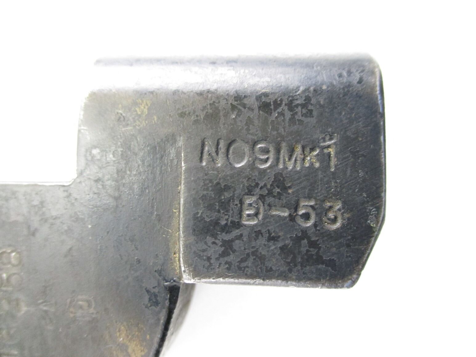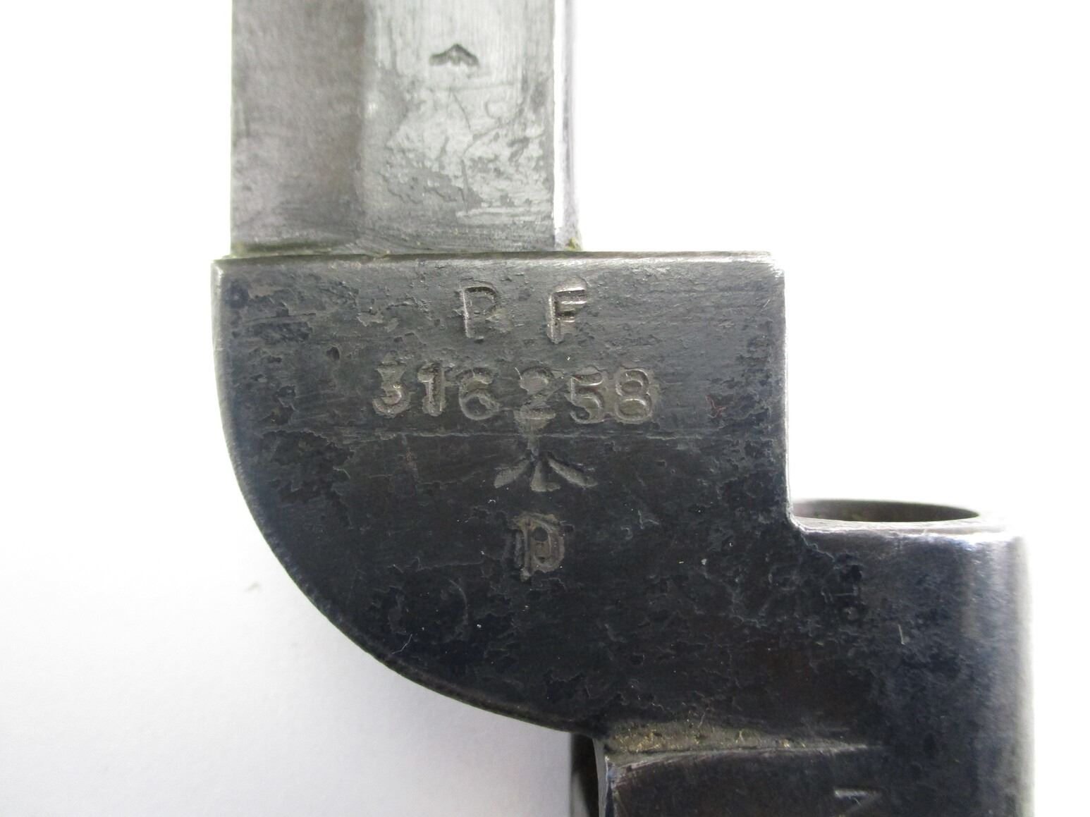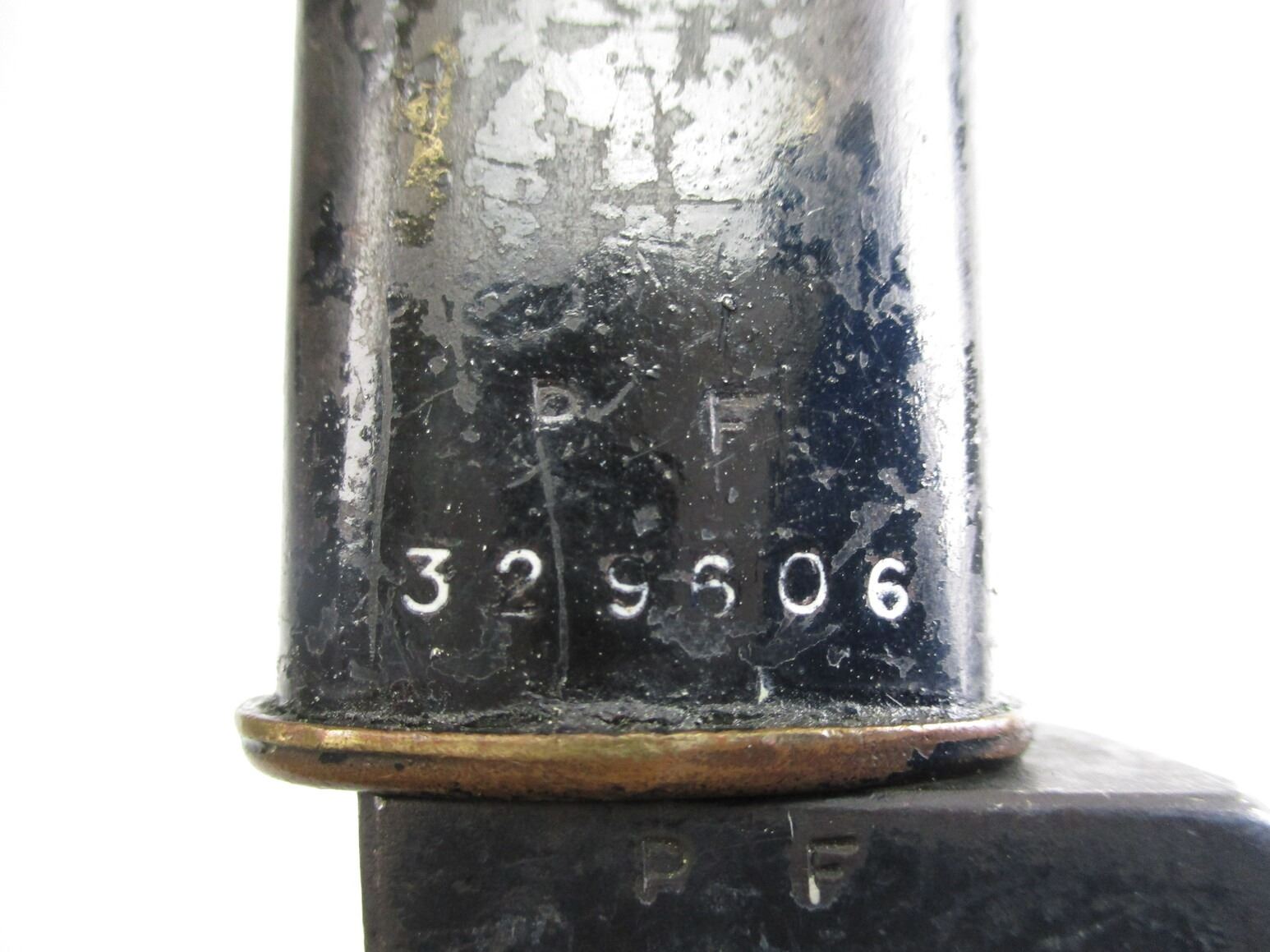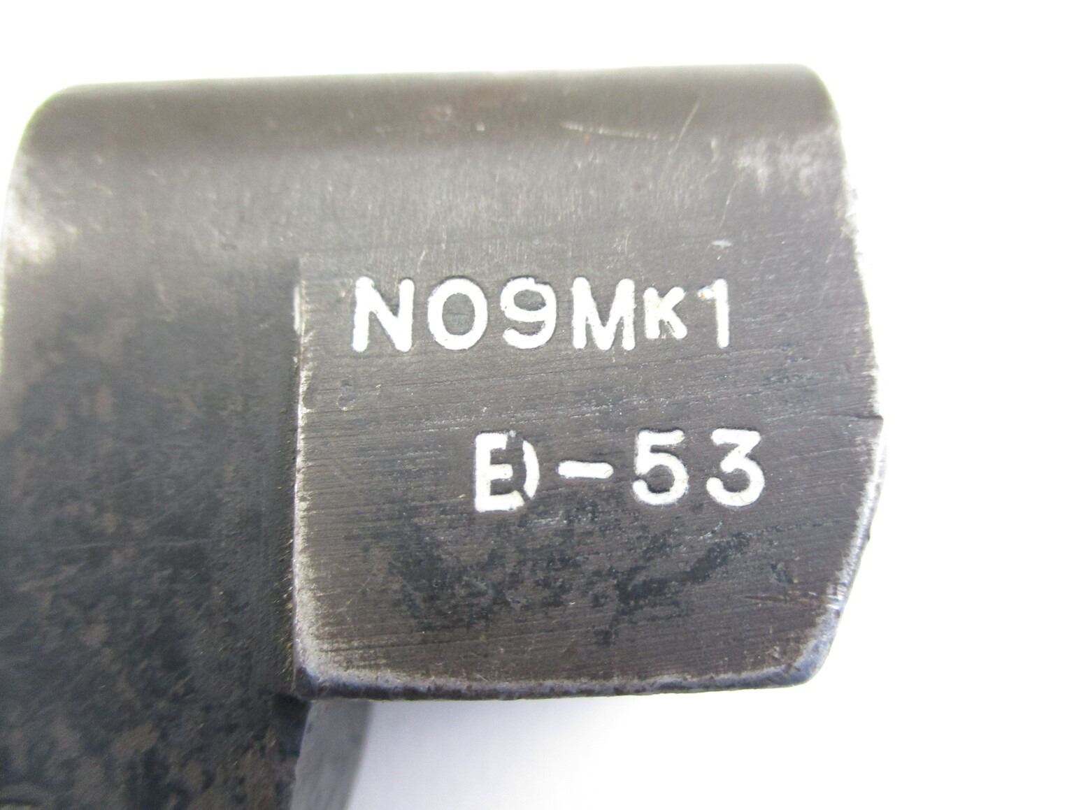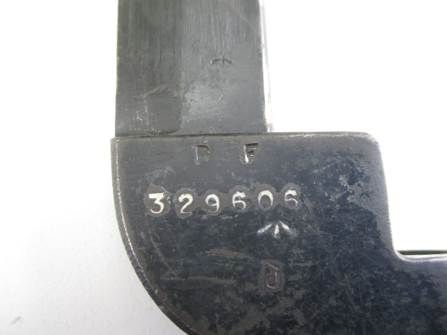 BRITISH NO.9 MKI BAYONET LOT. FITS .303 LEE ENFIELD NO.4 MKI SERIES RIFLES, LOT INCLUDES; (1) SOCKET MARKED: "NO9 MKI" OVER "DE-53", "P. F., 329606" & BROAD ARROW, METAL SCABBARD WITH MATCHING NUMBERS, MARKED: "P. F., 329606" & (1) SOCKET MARKED: "NO9 MKI" OVER "DE-53", "P. F., 316258" & BROAD ARROW, METAL SCABBARD WITH MATCHING NUMBERS, MARKED: "P. F., 316258". EACH BLADE APPROX. 8" & OAL APPROX. 10 1/8". SEE PHOTOS.