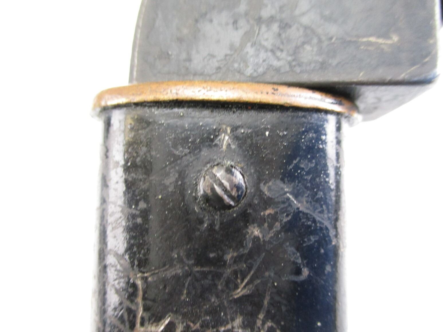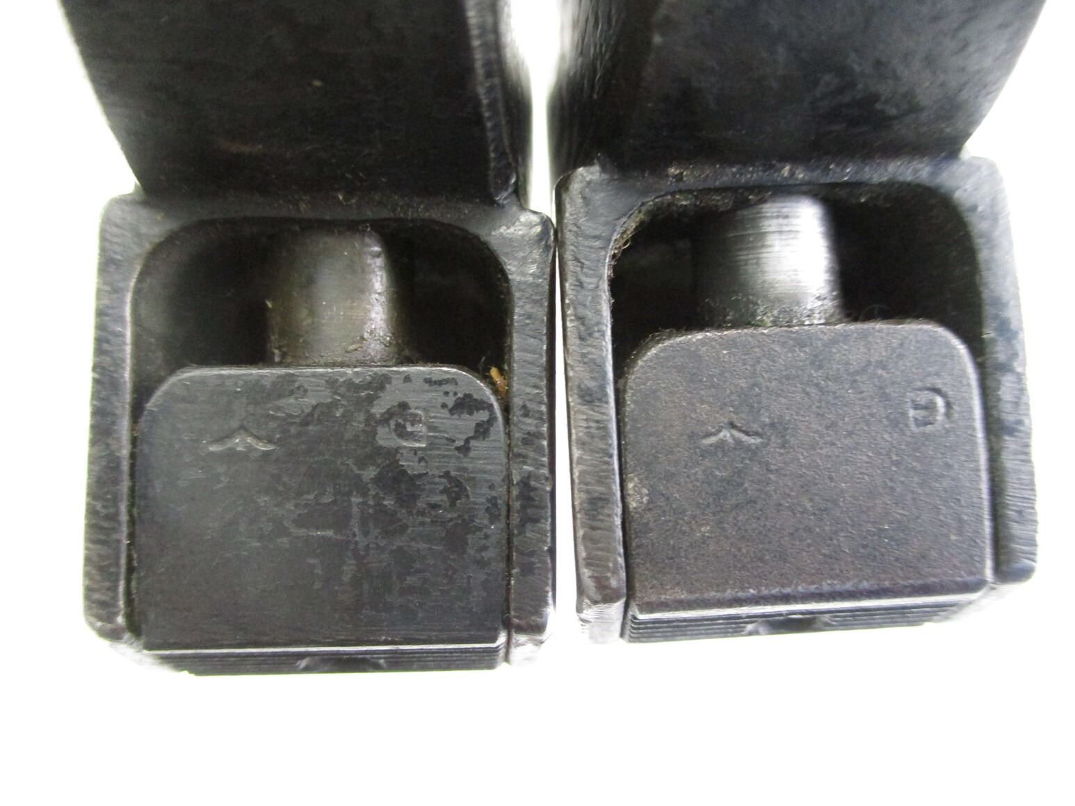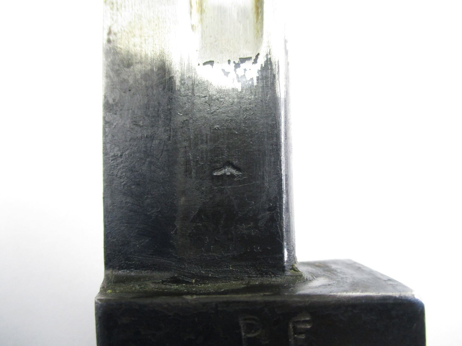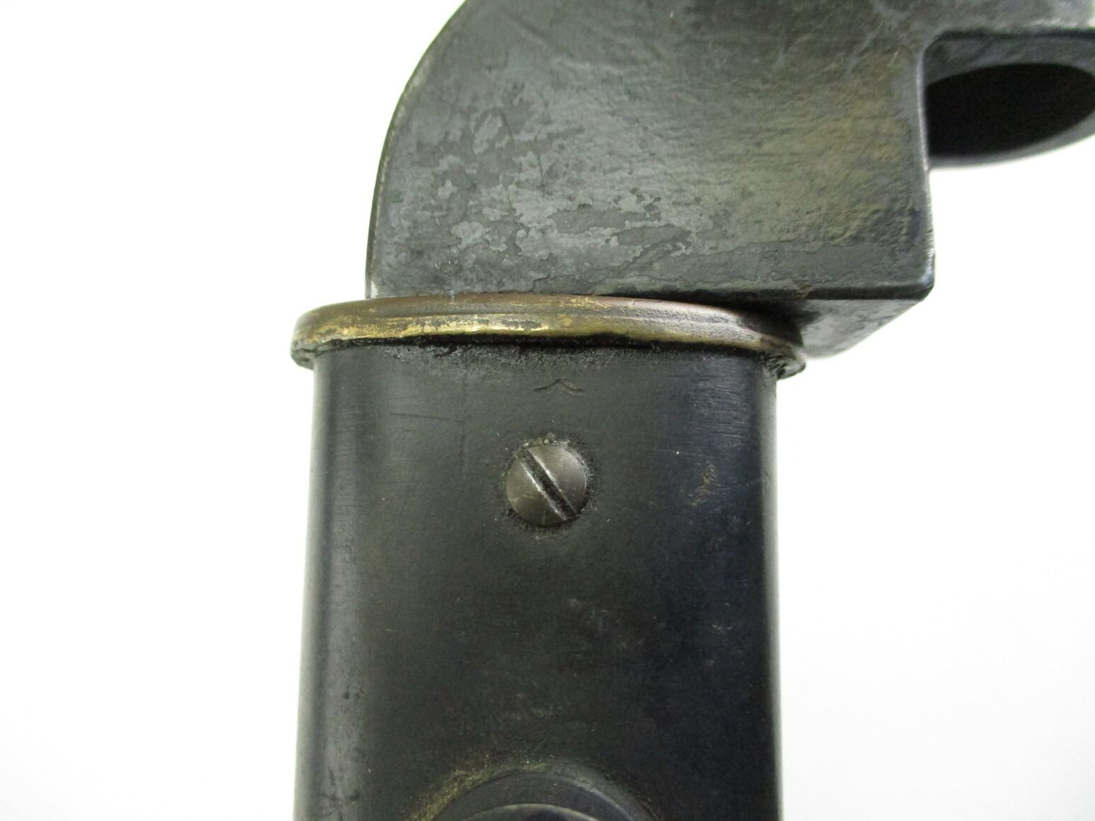 BRITISH NO.9 MKI BAYONET LOT. FITS .303 LEE ENFIELD NO.4 MKI SERIES RIFLES, LOT INCLUDES; (1) SOCKET MARKED: "NO9 MKI" OVER "DE-53", "P. F., 329606" & BROAD ARROW, METAL SCABBARD WITH MATCHING NUMBERS, MARKED: "P. F., 329606" & (1) SOCKET MARKED: "NO9 MKI" OVER "DE-53", "P. F., 316258" & BROAD ARROW, METAL SCABBARD WITH MATCHING NUMBERS, MARKED: "P. F., 316258". EACH BLADE APPROX. 8" & OAL APPROX. 10 1/8". SEE PHOTOS.