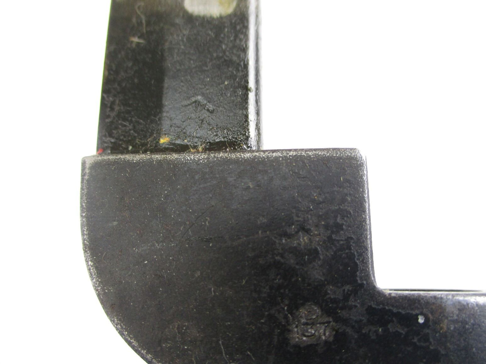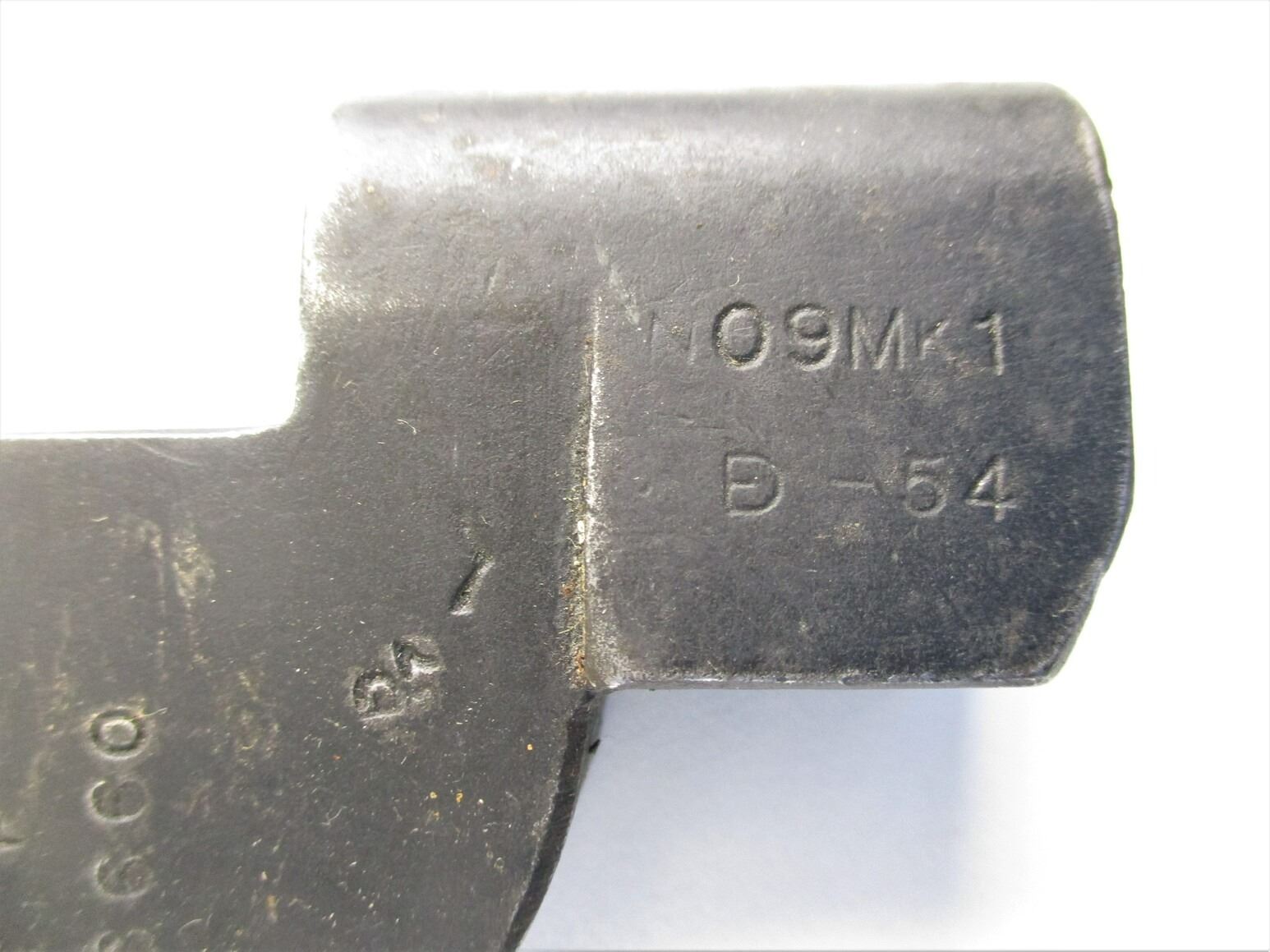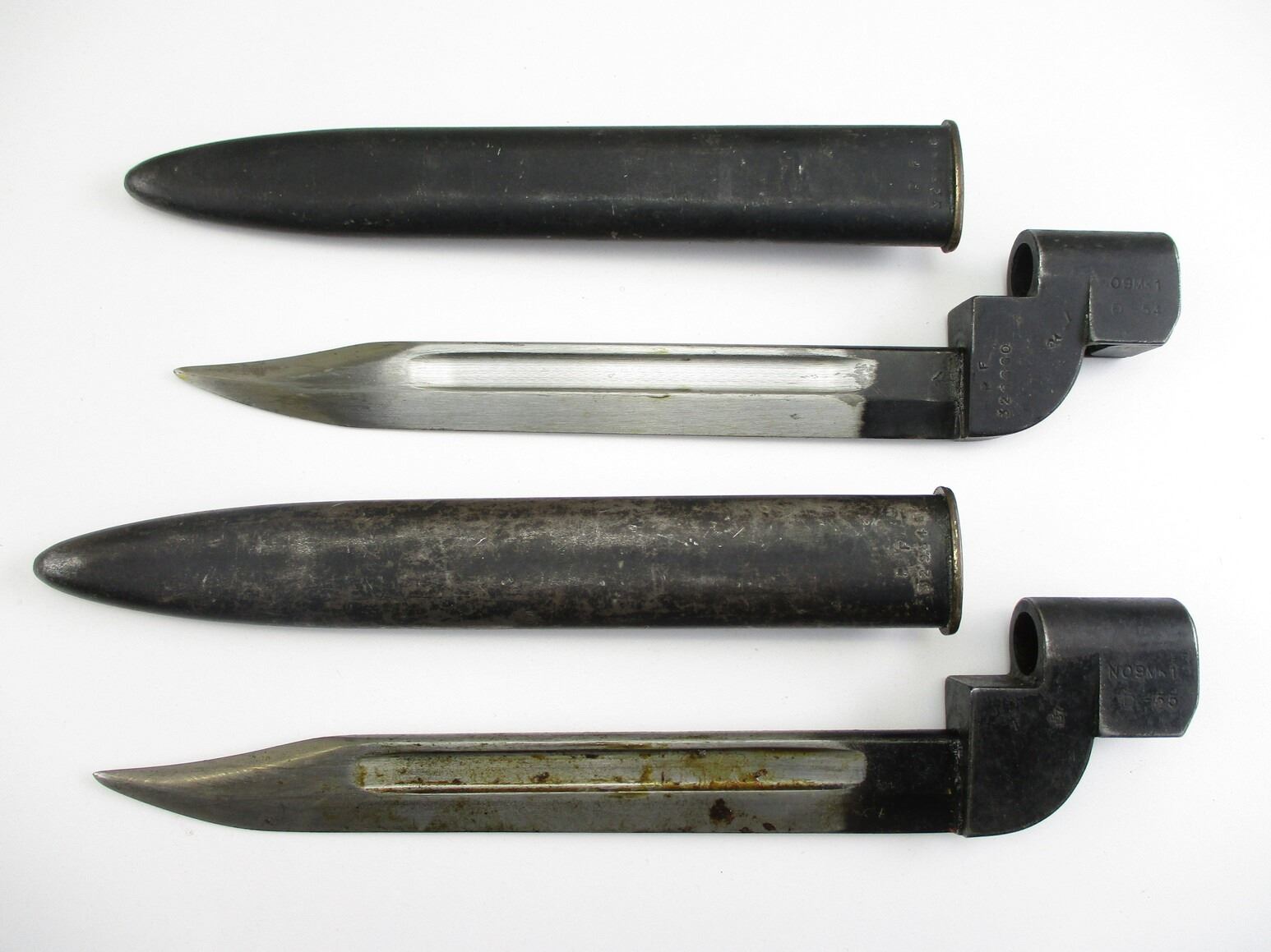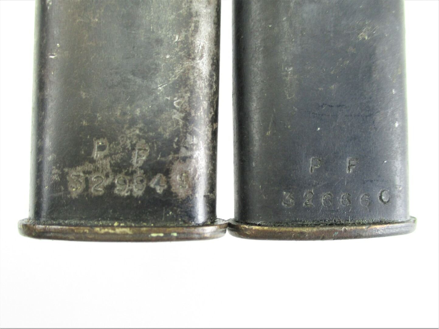 BRITISH NO.9 MKI BAYONET LOT. (2) FITS .303 LEE ENFIELD NO.4 MKI SERIES RIFLES, INCLUDES; (1) SOCKET MARKED: "NO9 MKI" OVER "DE-54", "P. F., 326660" & BROAD ARROW, METAL SCABBARD WITH MATCHING NUMBERS, MARKED: "P. F., 326660" & (1) SOCKET MARKED: "NO9 MKI" OVER "DE-55" & BROAD ARROW, METAL SCABBARD MARKED: "P. F., 329849". EACH BLADE APPROX. 8" & OAL APPROX. 10 1/8". SEE PHOTOS.