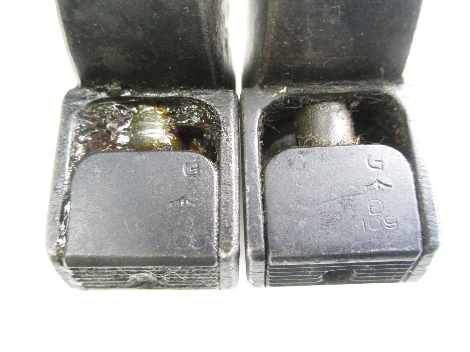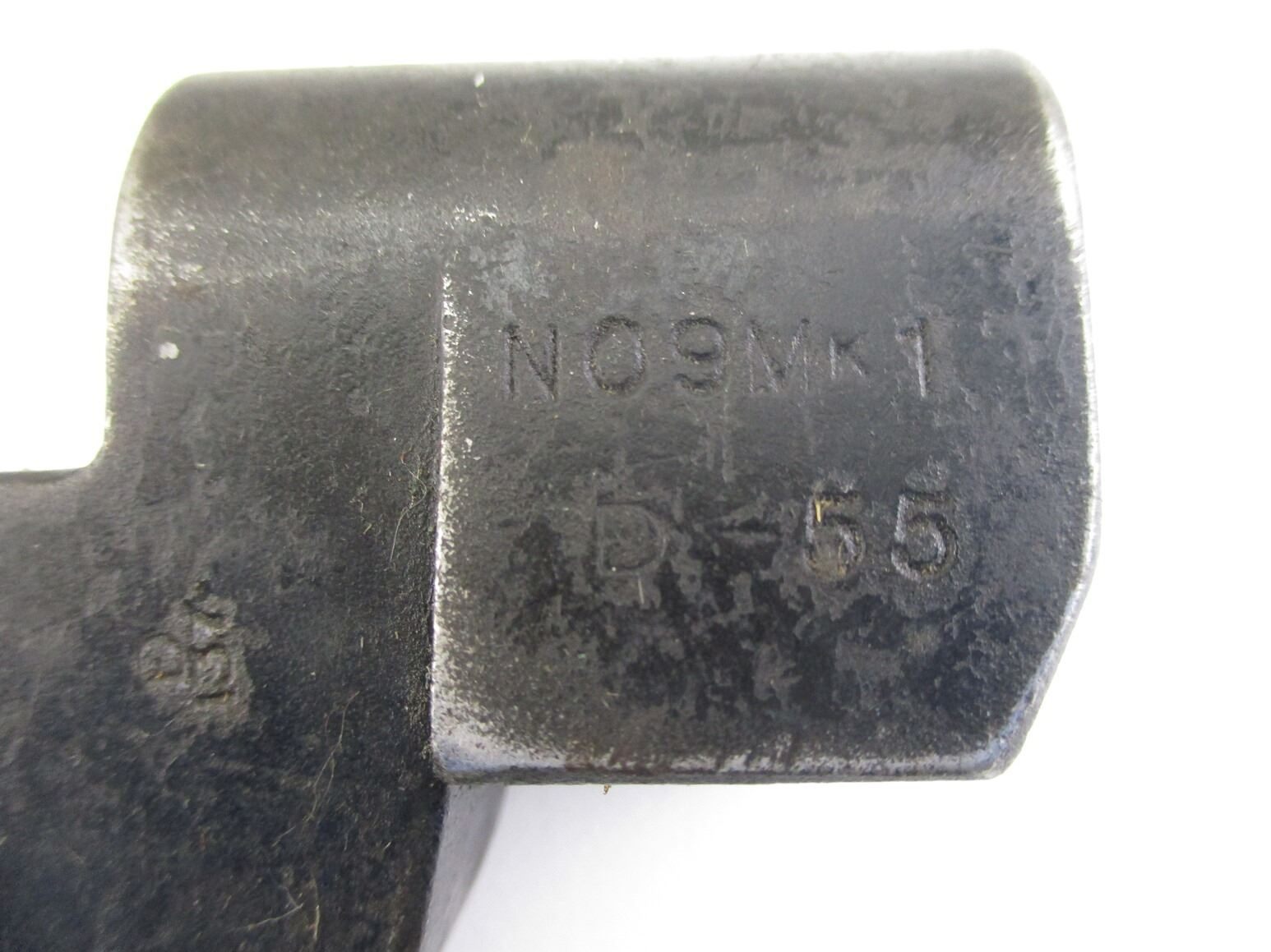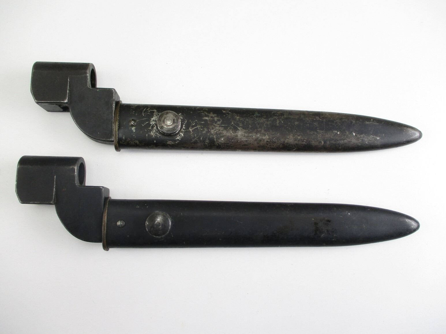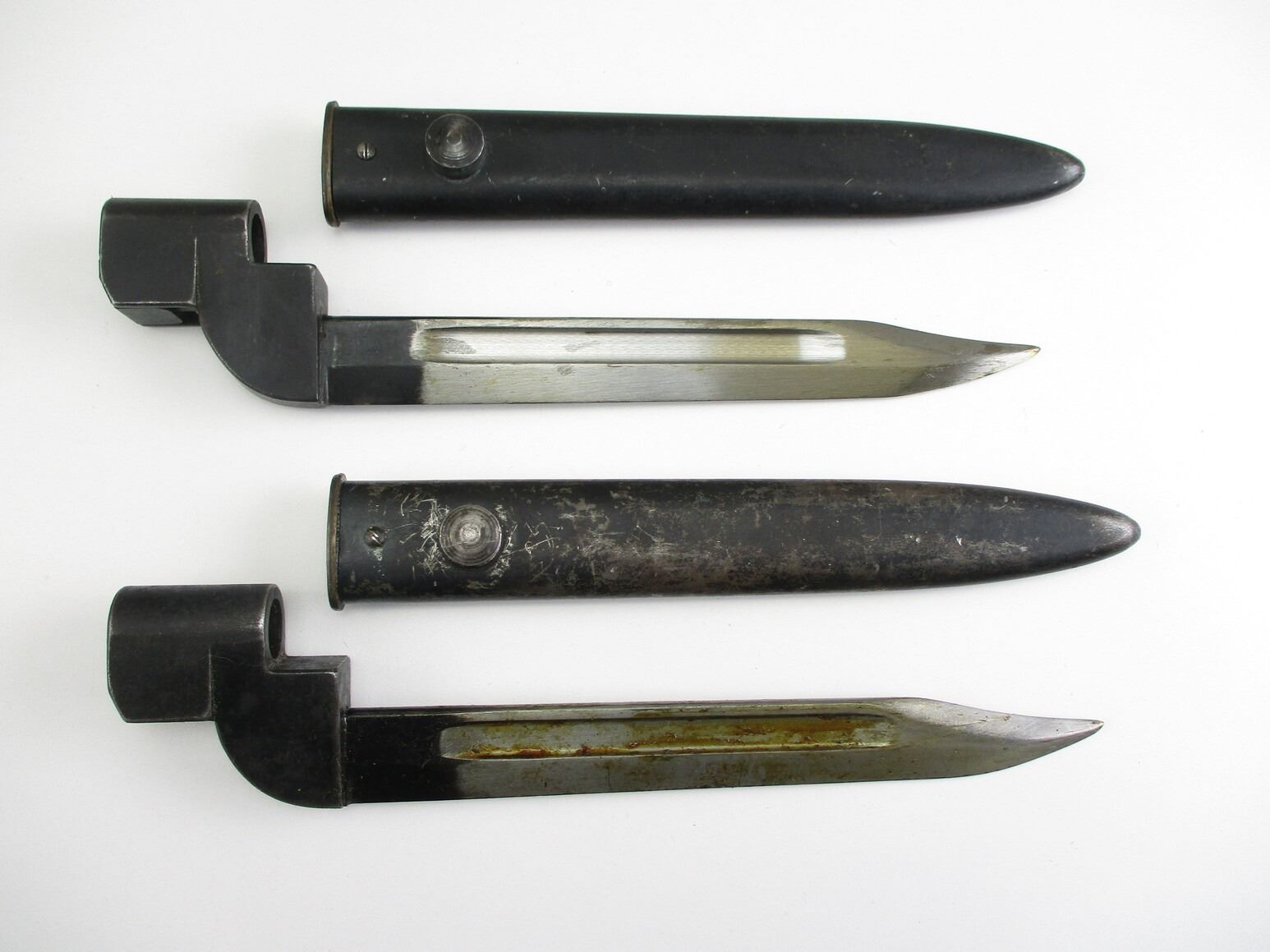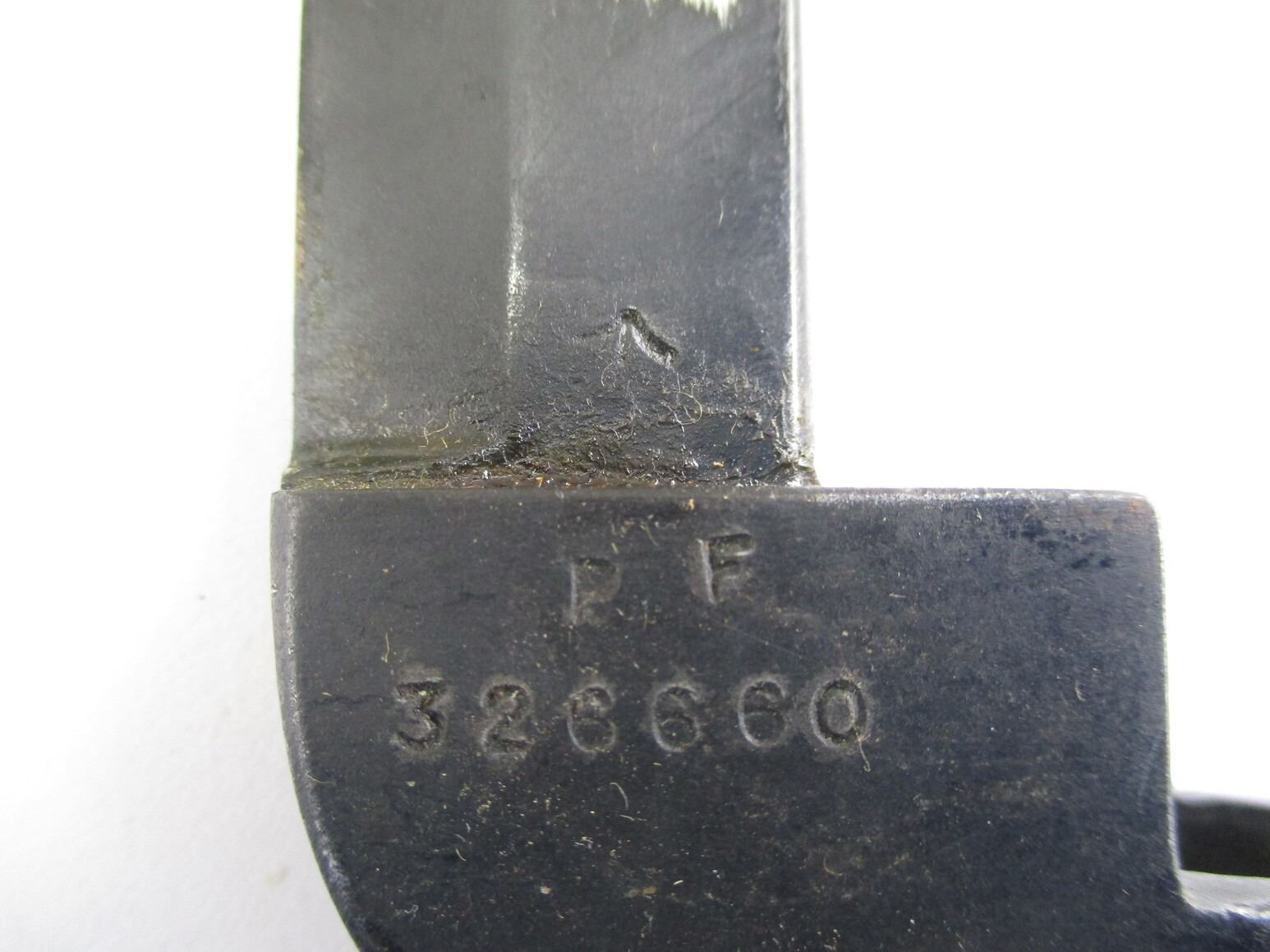 BRITISH NO.9 MKI BAYONET LOT. (2) FITS .303 LEE ENFIELD NO.4 MKI SERIES RIFLES, INCLUDES; (1) SOCKET MARKED: "NO9 MKI" OVER "DE-54", "P. F., 326660" & BROAD ARROW, METAL SCABBARD WITH MATCHING NUMBERS, MARKED: "P. F., 326660" & (1) SOCKET MARKED: "NO9 MKI" OVER "DE-55" & BROAD ARROW, METAL SCABBARD MARKED: "P. F., 329849". EACH BLADE APPROX. 8" & OAL APPROX. 10 1/8". SEE PHOTOS.