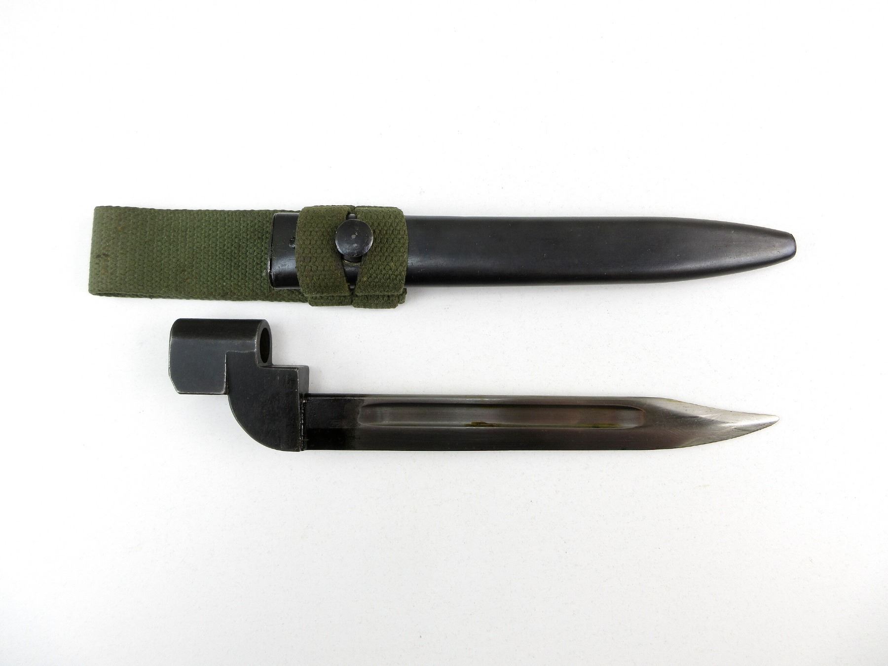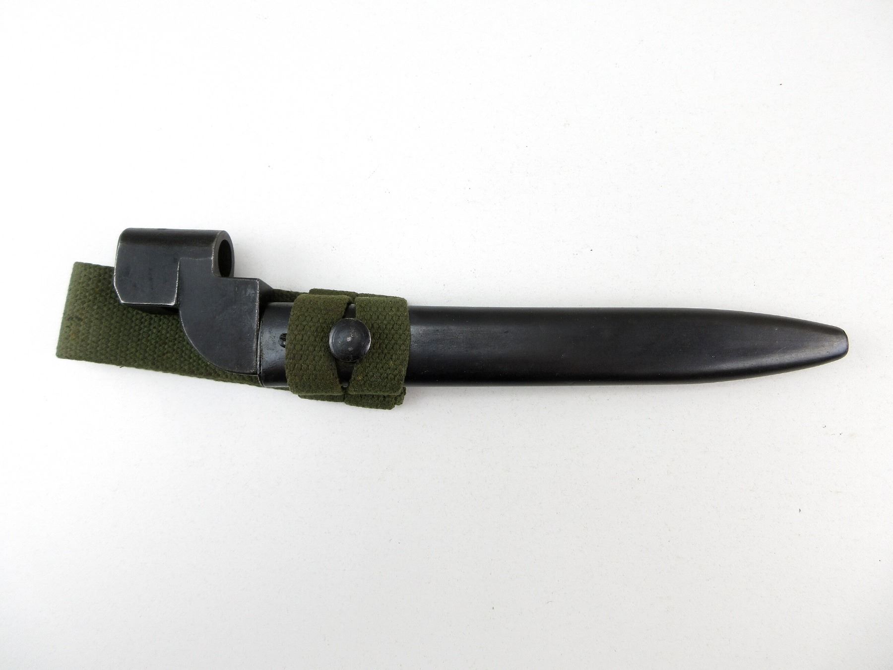 (1) FITS .303 LEE ENFIELD NO.4 MKI SERIES RIFLES, BLADE MARKED WITH BROAD ARROW, SOCKET MARKED: "NO9 MK1" OVER "ED-54", "ED" OVER "137", BROAD ARROW, "ED" OVER "88", "ED" OVER "109" & "ED" OVER BROAD ARROW, BLACK PAINTED METAL SCABBARD, NO VISIBLE MARKINGS, BLADE APPROX. 8" & OAL APPROX. 10 1/8". SEE PHOTOS.