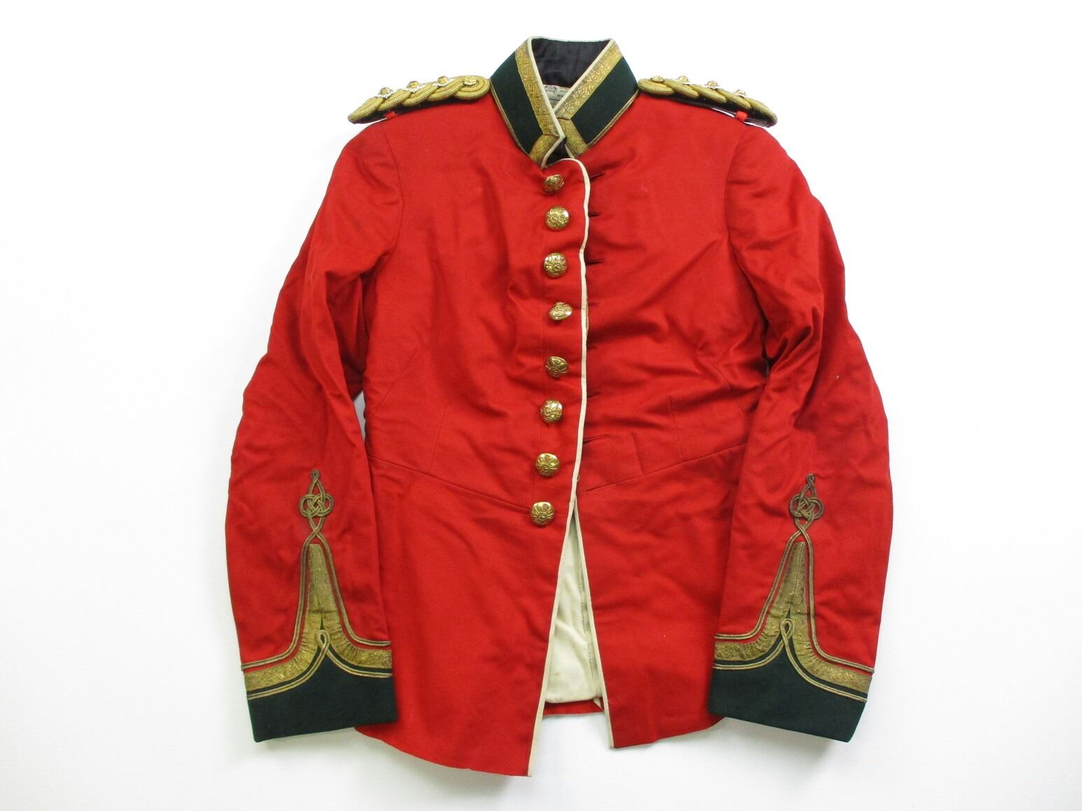 BRITISH OFFICERS SCARLET SERGE TUNIC , SHERWOOD FORESTERS BUTTONS, TRI JUNCTA IN UNO RANK PIPS. TAG READS MILTON & JONES MILITARY TAILORS MANCHESTER.